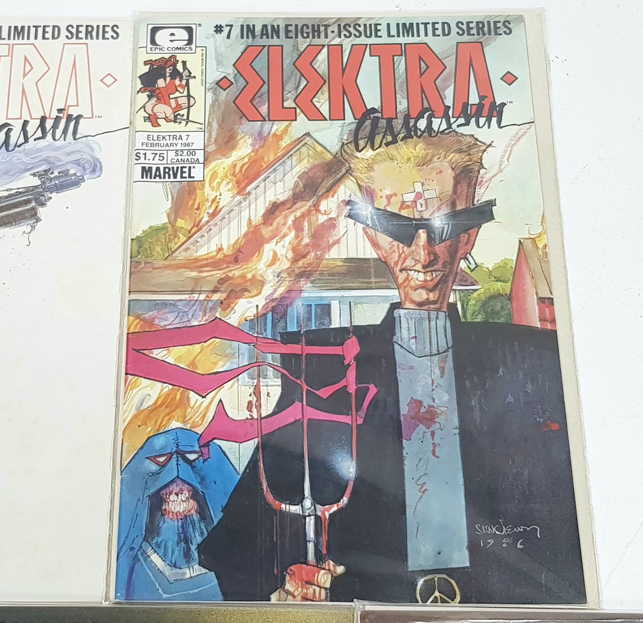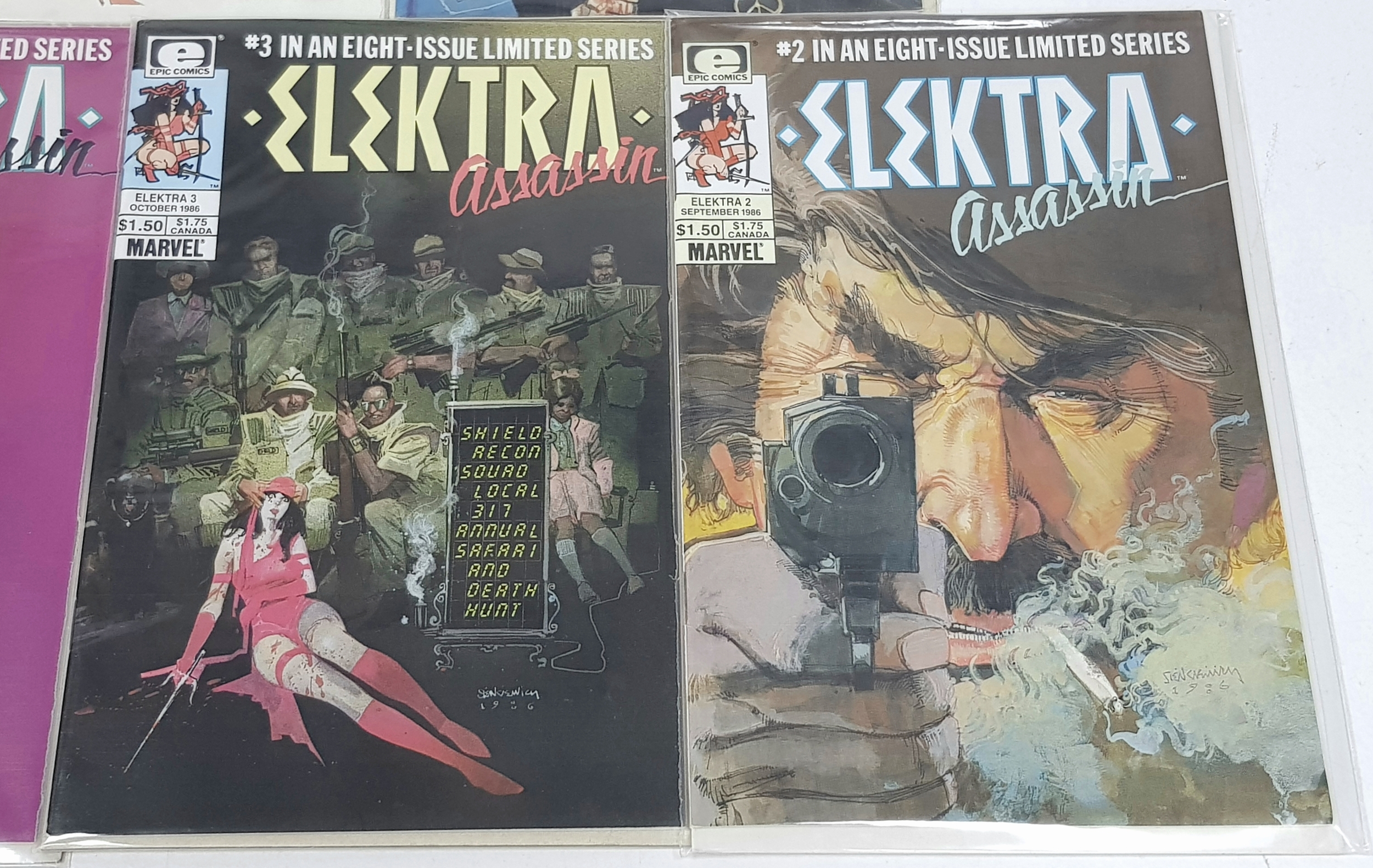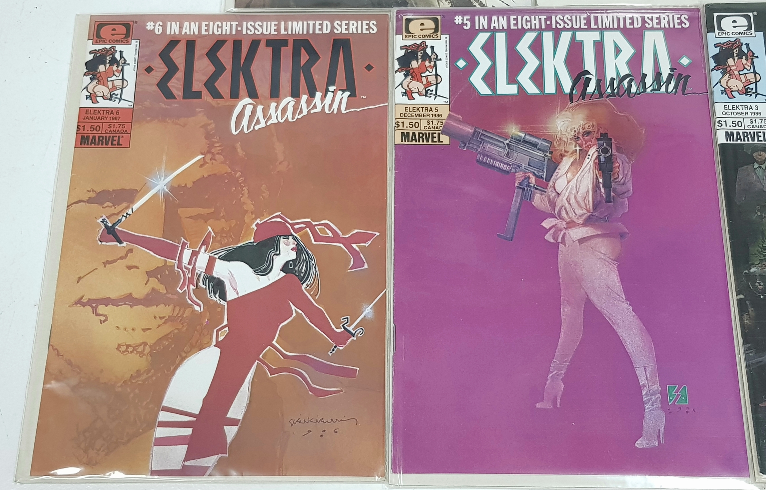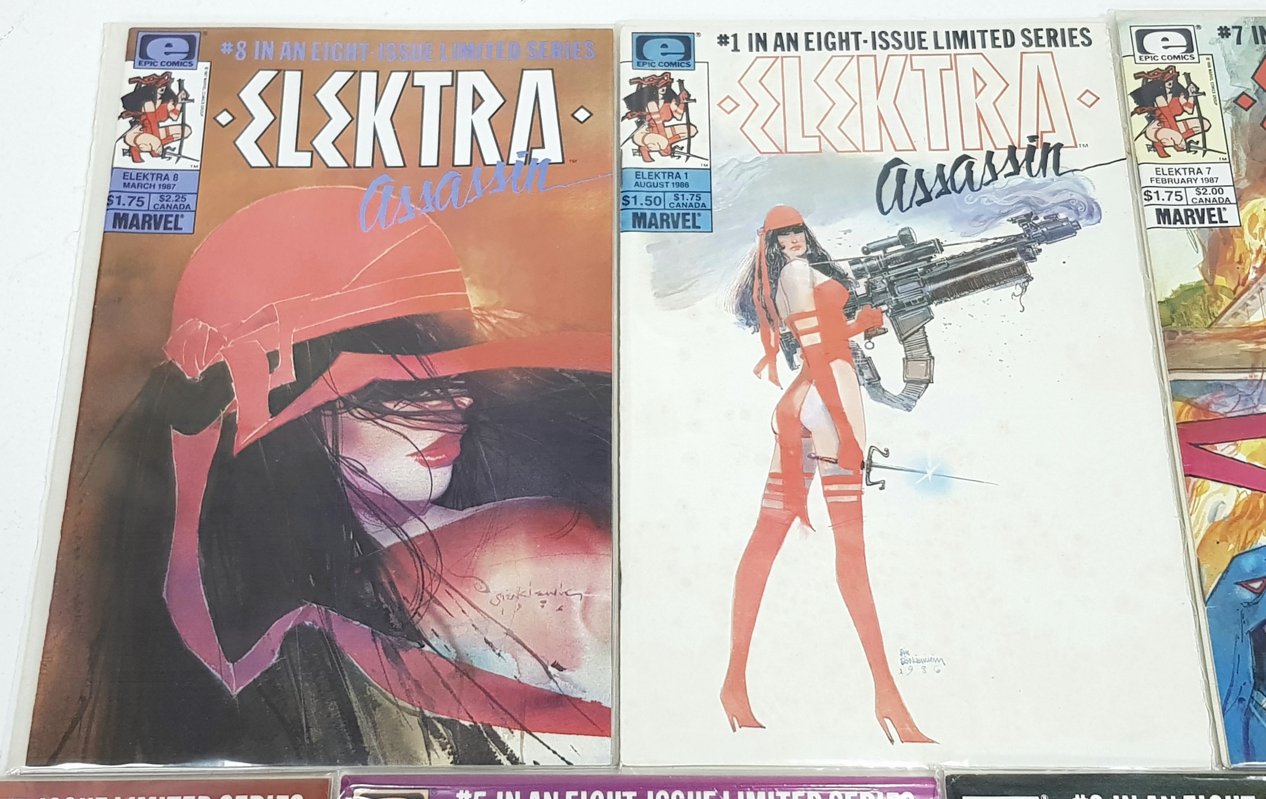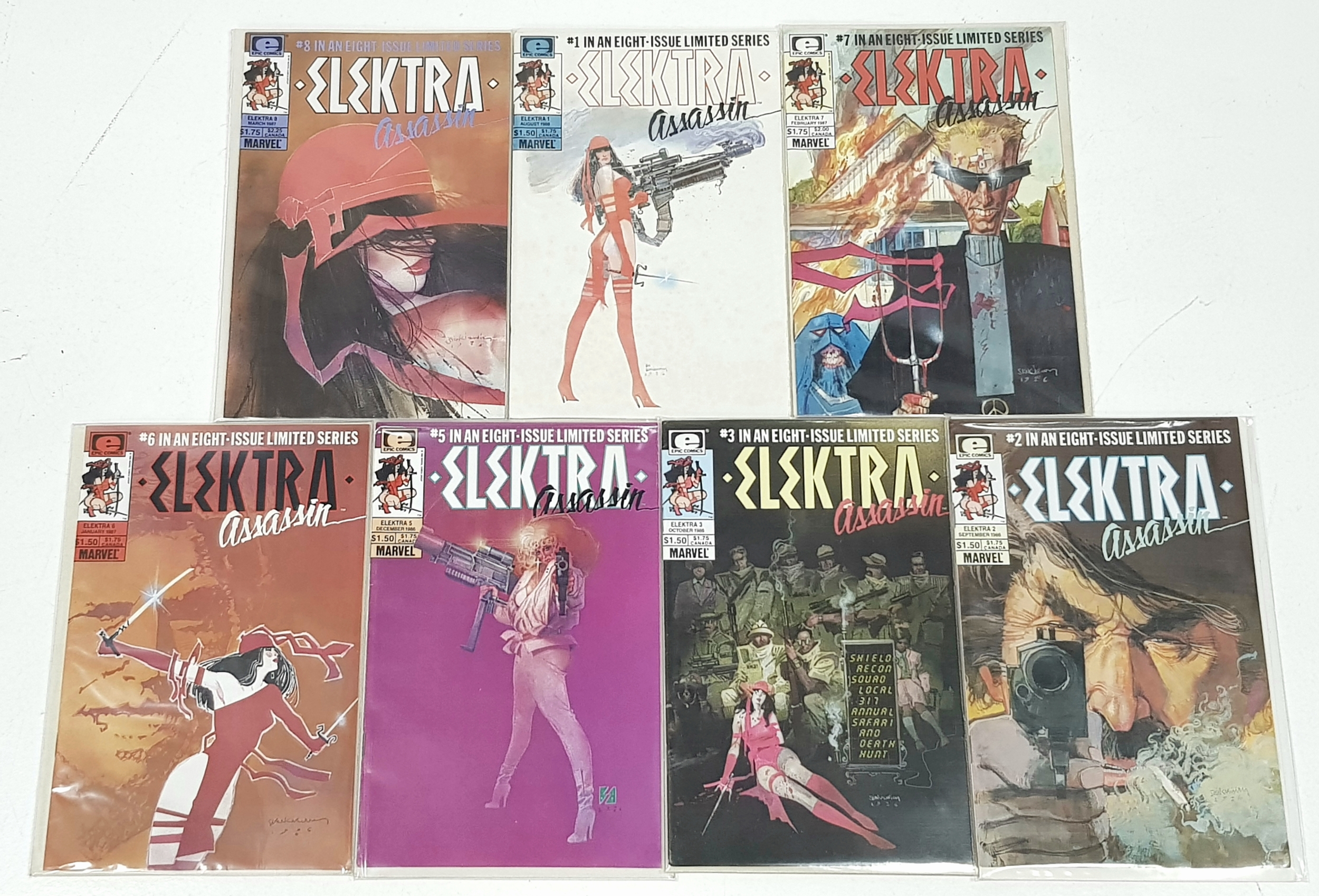 An Incredible Collection of Marvel 1980s Elektra Comics. Limited Series 1-8.Written by Frank Miller with artwork by Bill Sienkiwicz. Unfortunately no.4 of this collection is missing but still an impressive collection. High grade but please refer top photos. Each individually plastic wrapped and board backed.
