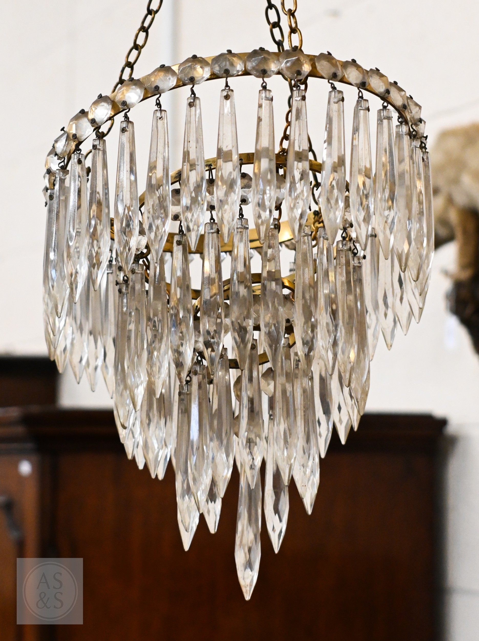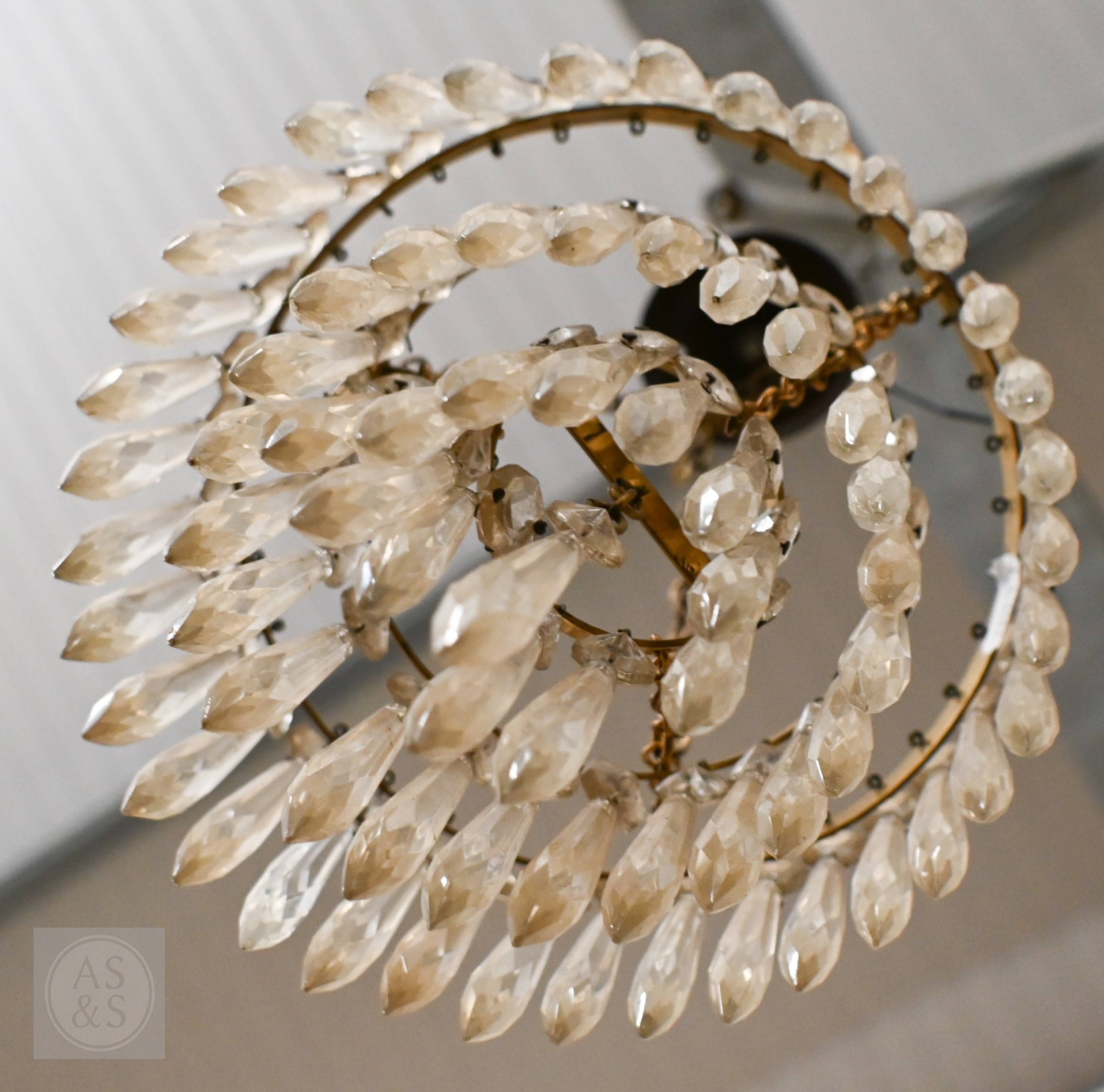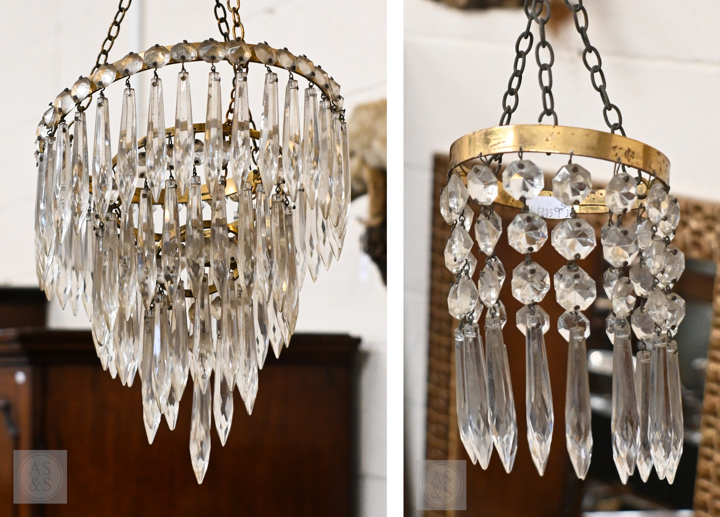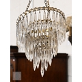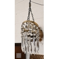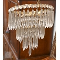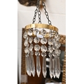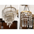 A vintage three-tier ceiling light shade hung with lustre drops, to/w a similar single tier example (2)