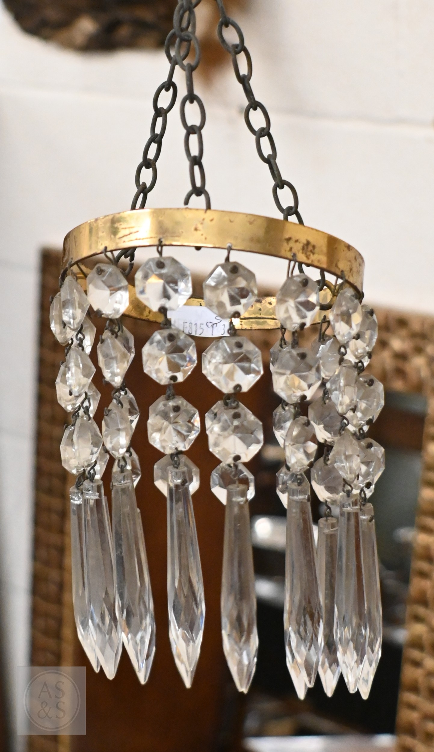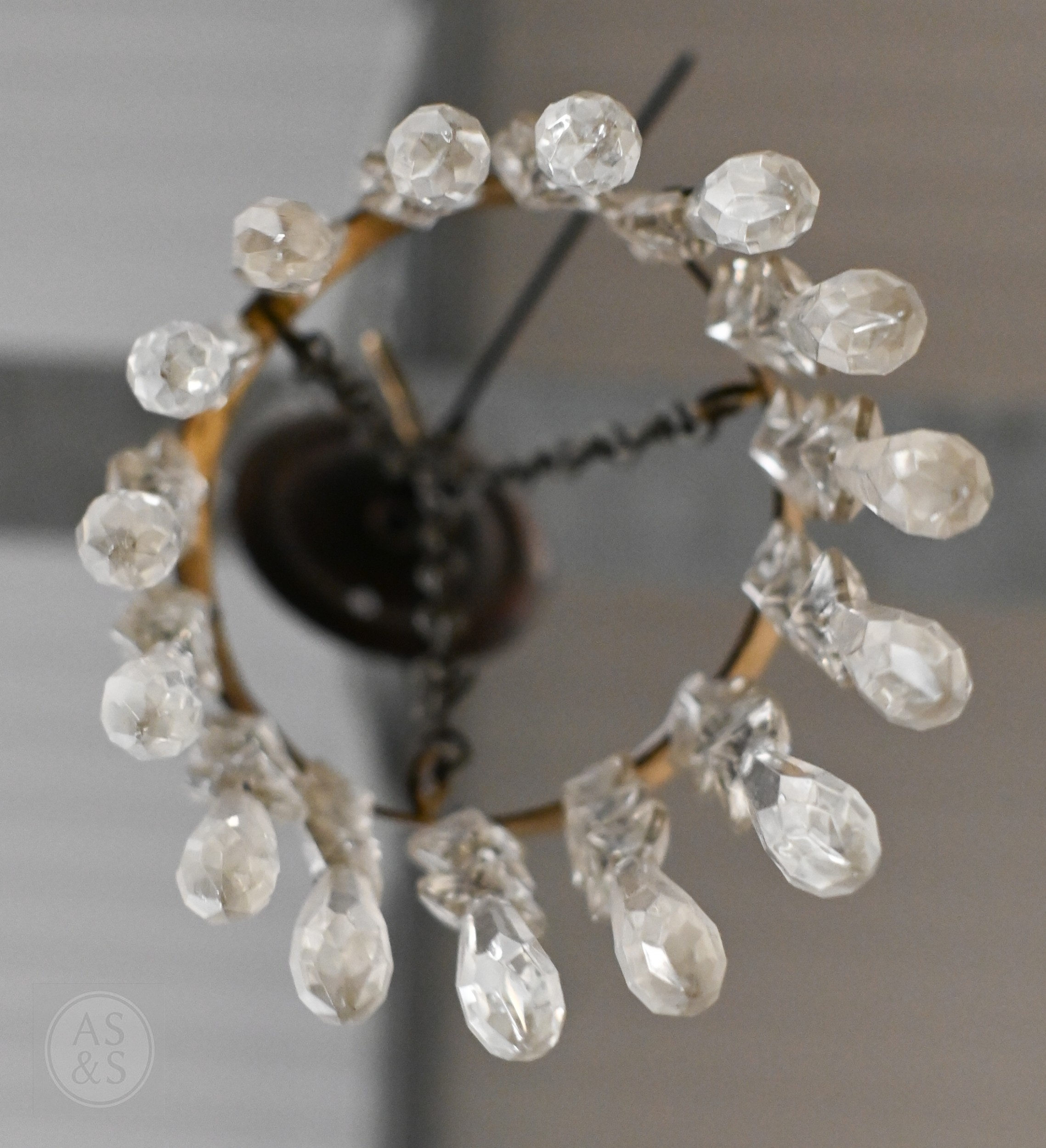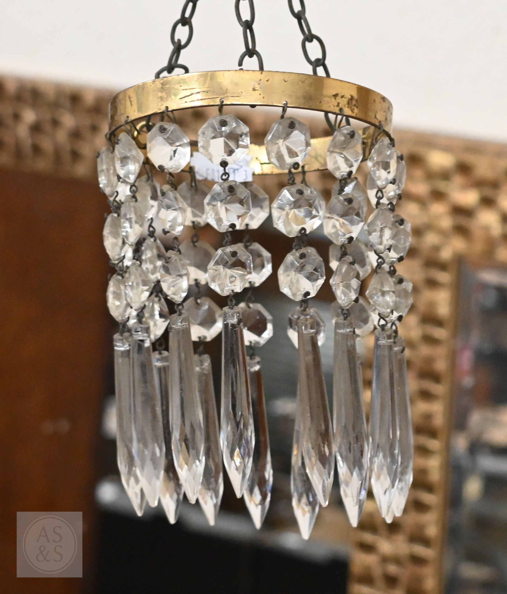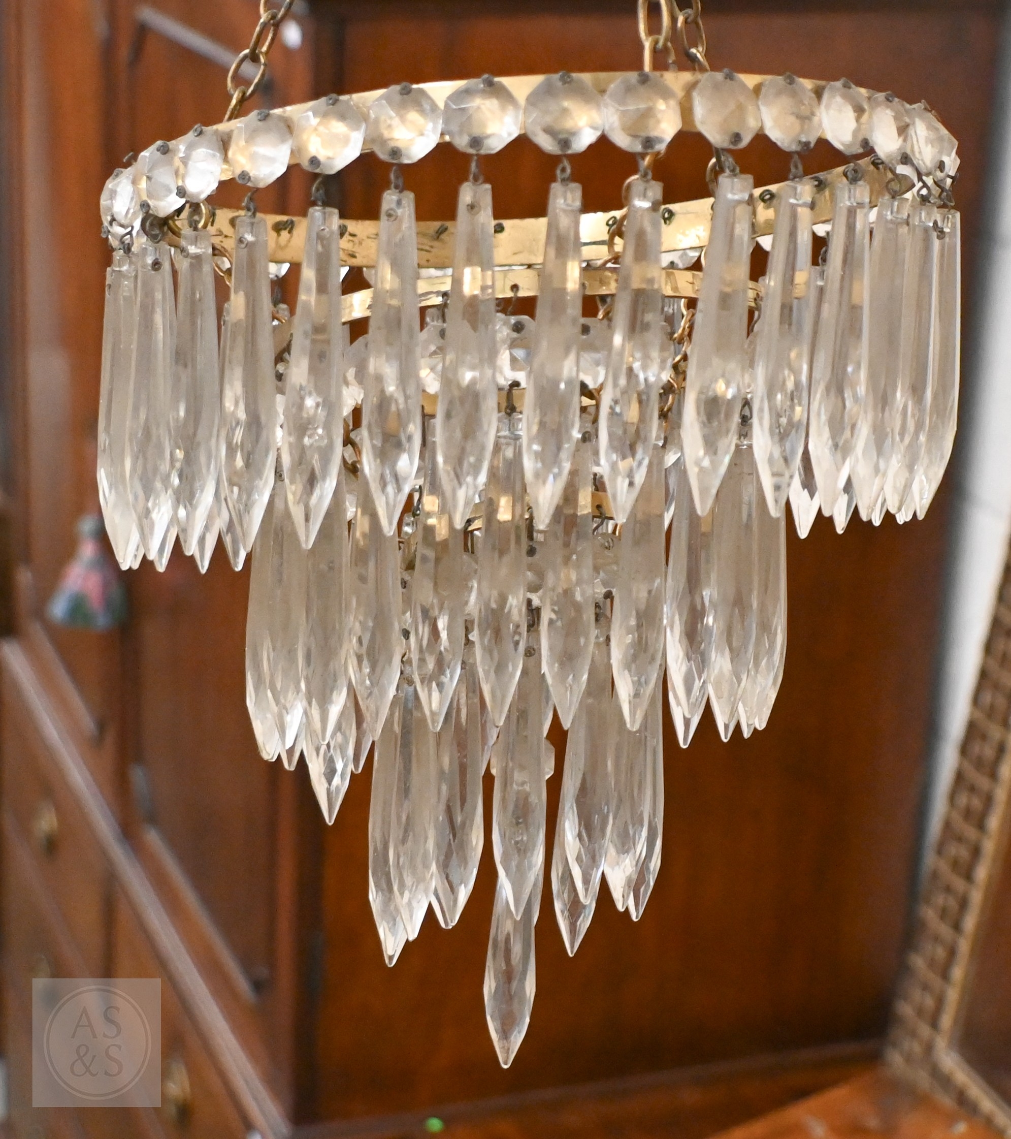 A vintage three-tier ceiling light shade hung with lustre drops, to/w a similar single tier example (2)