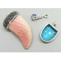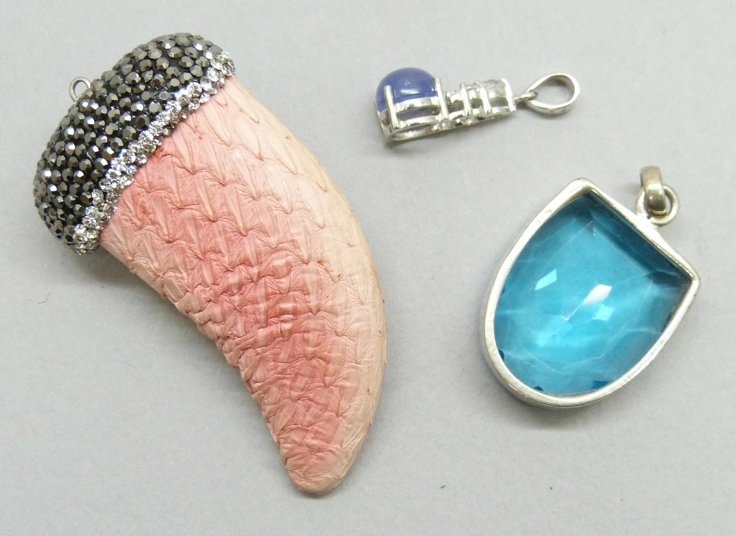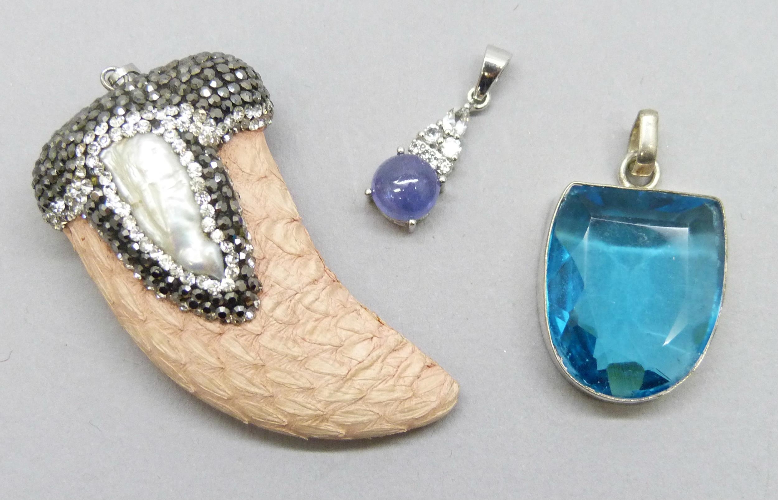A silver and purple stone pendant, 2.4cm including bail, a blue stone pendant and a plated pendant
