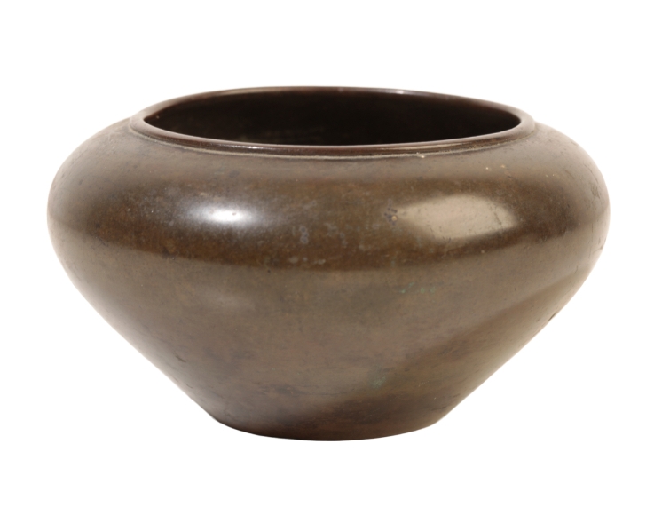 A CHINESE BRONZE CENSER, of plain form with rounded shoulder...