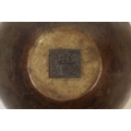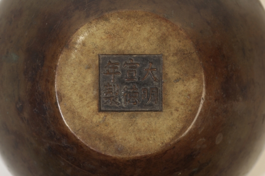 A CHINESE BRONZE CENSER, of plain form with rounded shoulders, the base with a finely-cast six character mark of Xuande, 16cm dia.