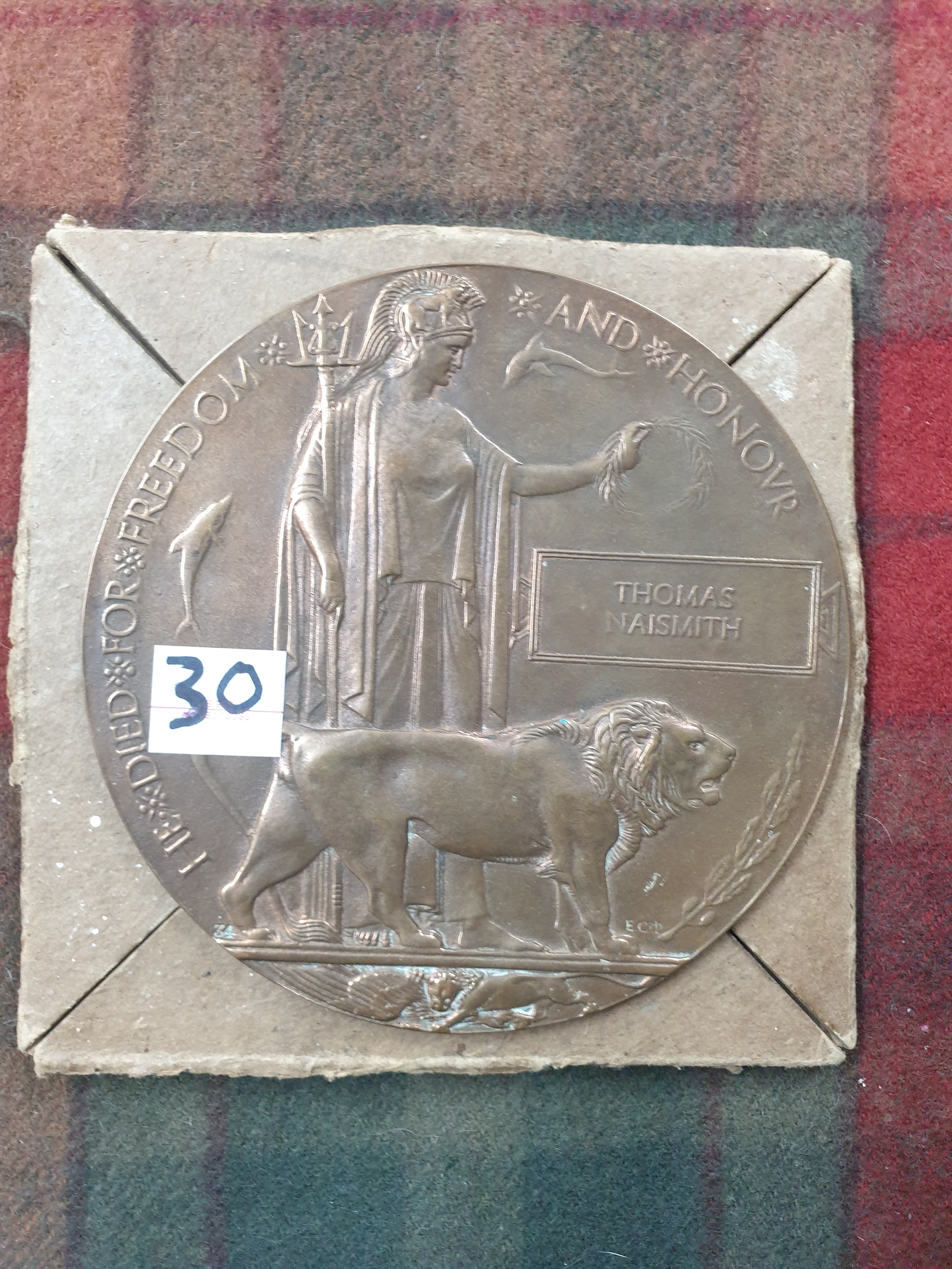 WW1 Death Plaque with Presentation to Thomas Naismith With Original Box