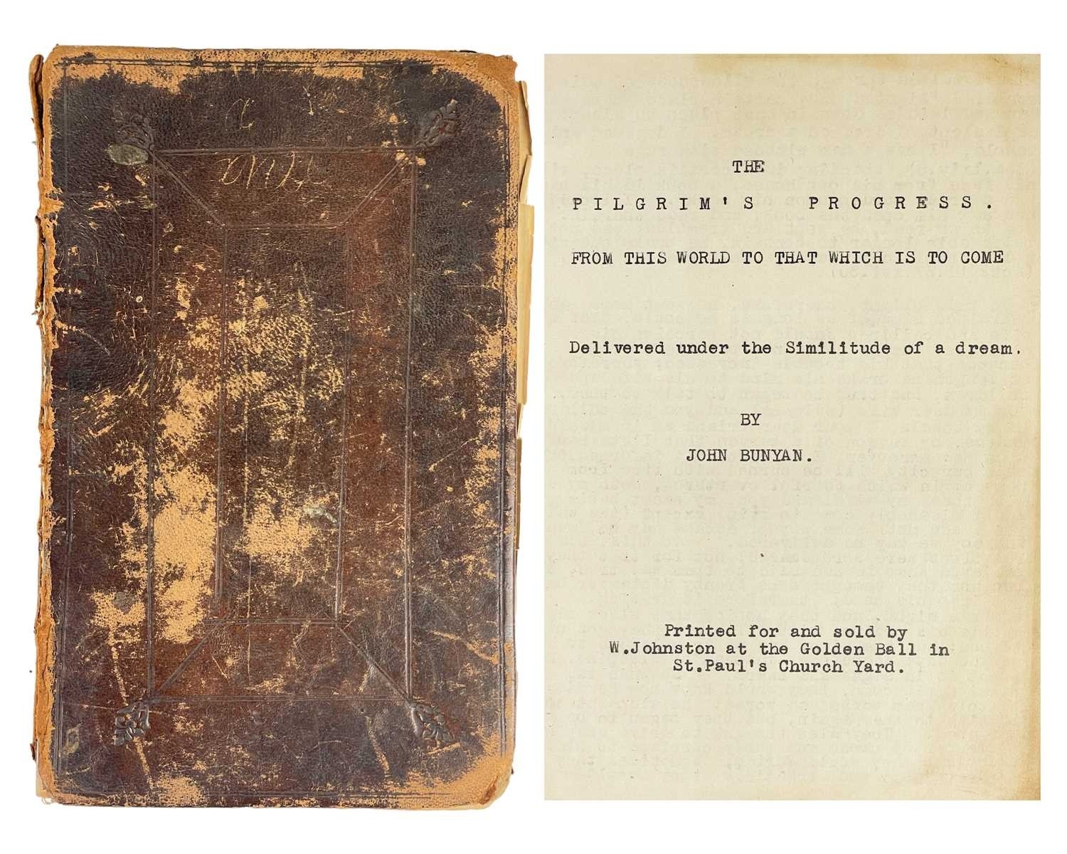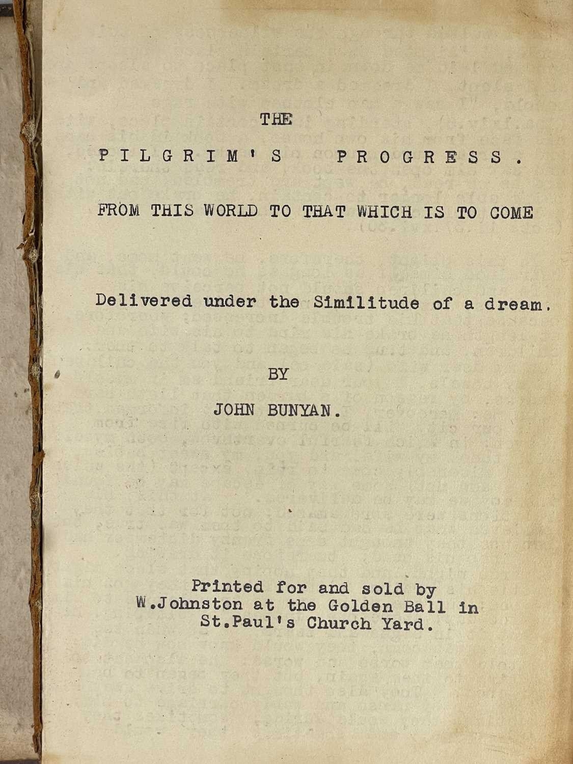[John Bunyan] [The Pilgrim's Progress. From This World To That Which Is To Come] Full embossed calf, front board de-bound, lacks title page and first leaf being a facsimile, title page for book two, 16 plates, a little grubby internally, good, first facsimile title states W. Johnston at the Golden Ball, with Book II titlepage stating Edinburgh, 1759.