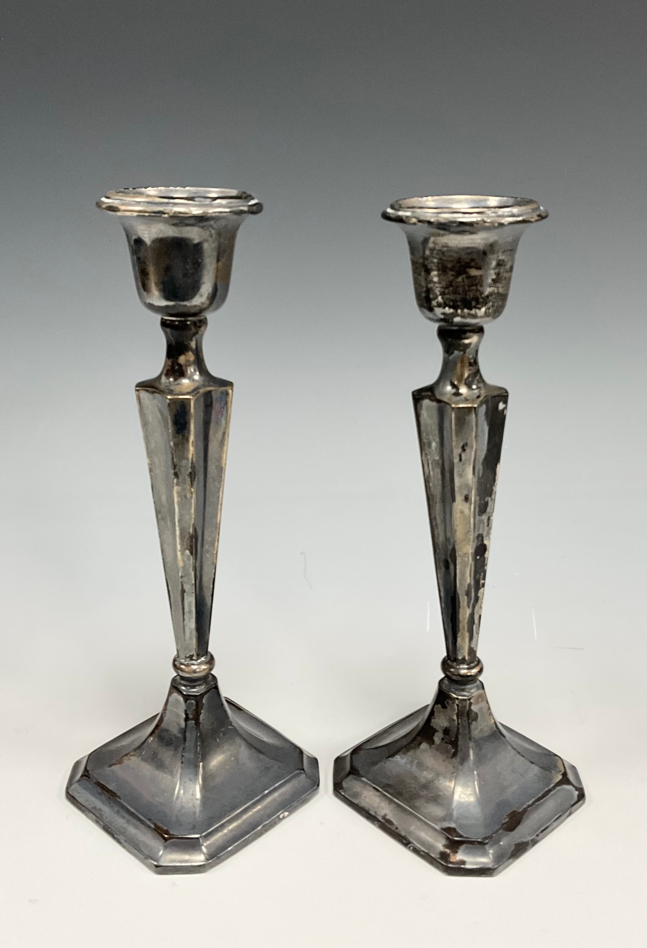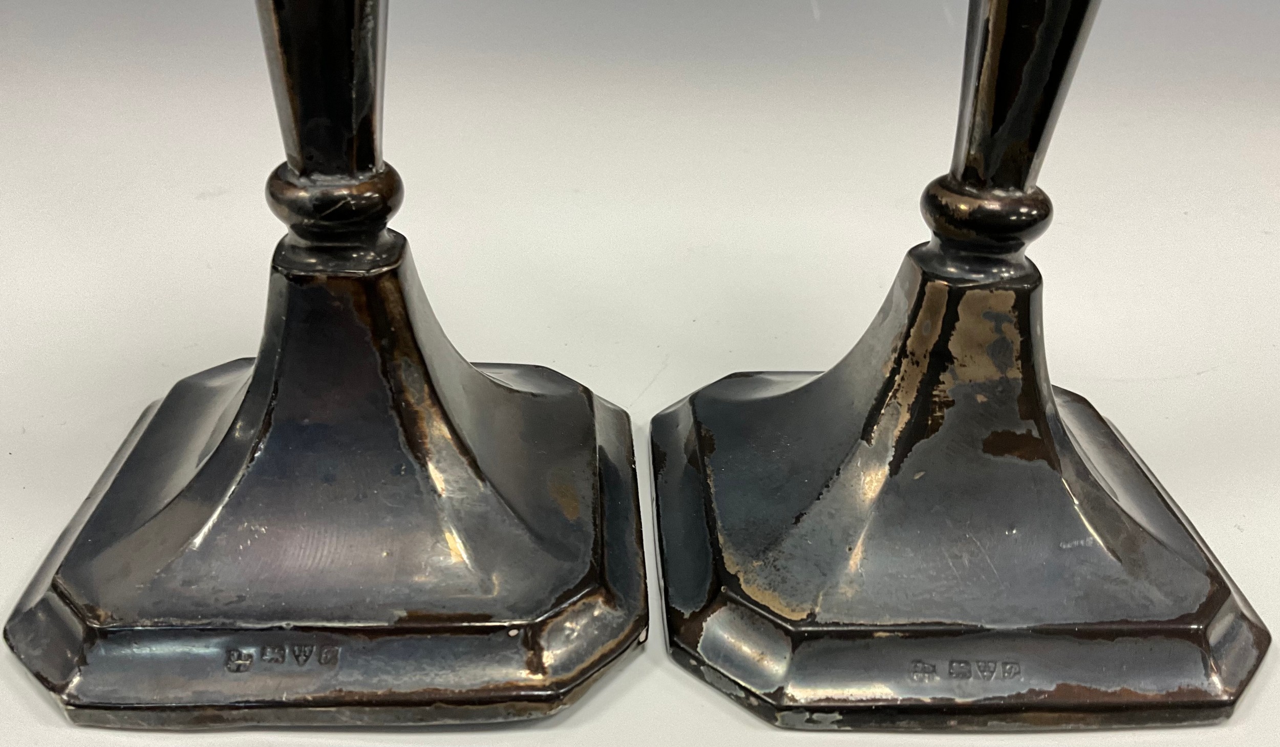 A pair of George V silver candlesticks, weighted bases, 19.7cm high, Chester 1915, 435.4g gross (2)