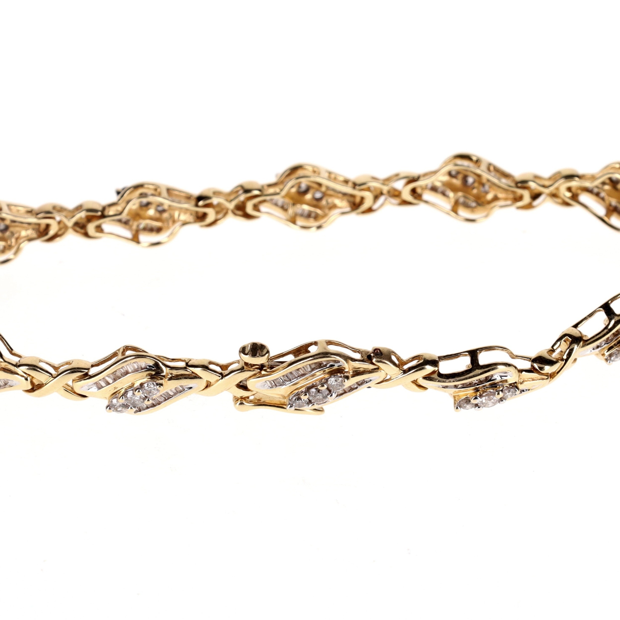 Vari-Cut Diamond 14ct Gold Bracelet. This bracelet is set with round brilliant and baguette-cut diamonds. This piece is stamped 14ct gold on the clasp. Measures approximately 19.5cm in length. Weighs in total 11.9g.