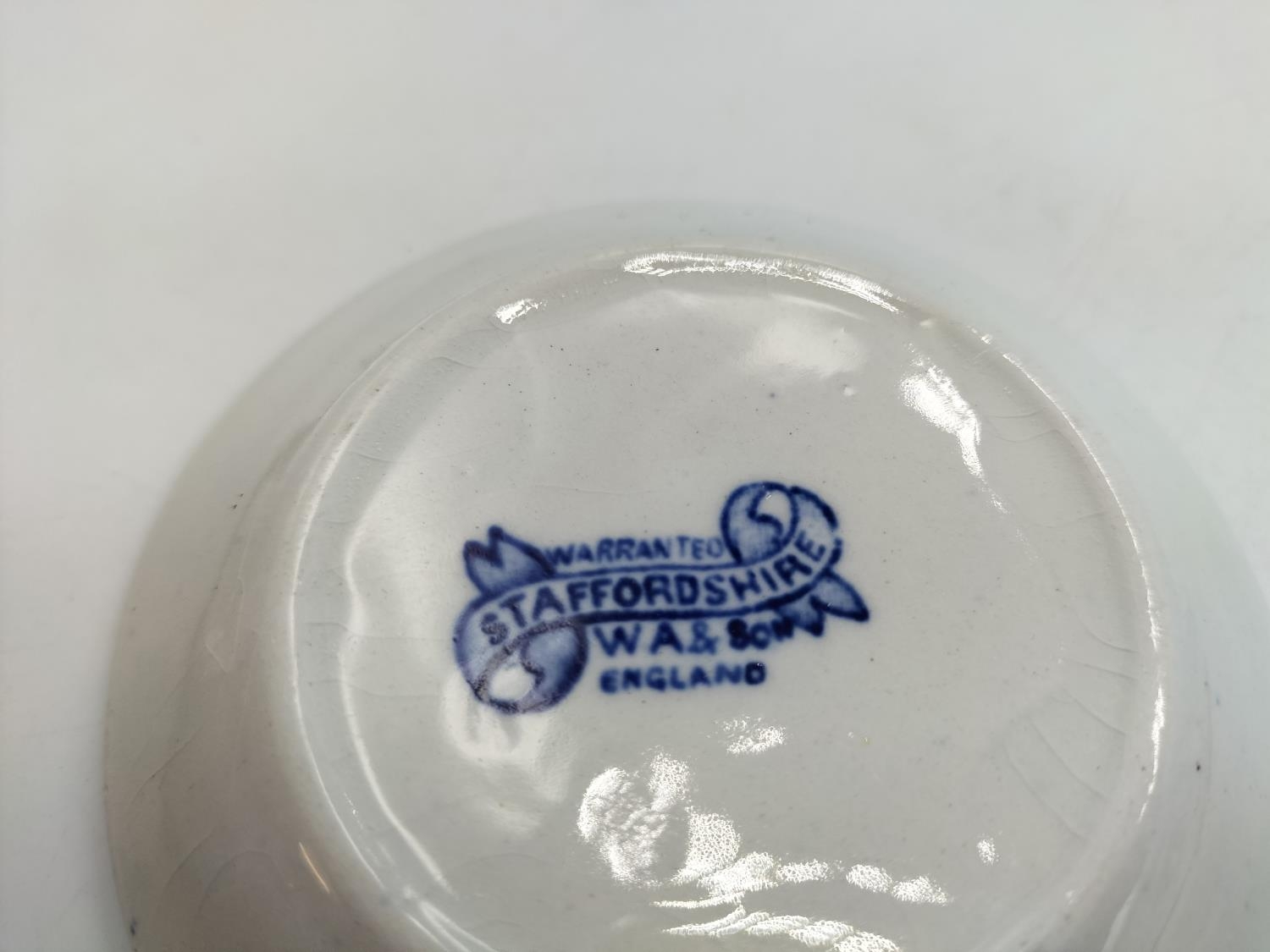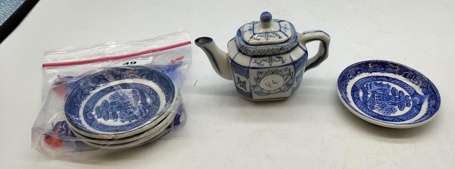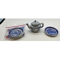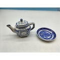 4 x Small 8cm Diameter Staffordshire Blue and White Dishes plus Miniature Teapot, 8cm High.