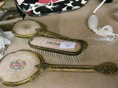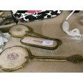 A VINTAGE FILIGREE GILT LADIES DRESSING HAND MIRROR, MATCHING HAIRBRUSH AND CLOTHES BRUSH
