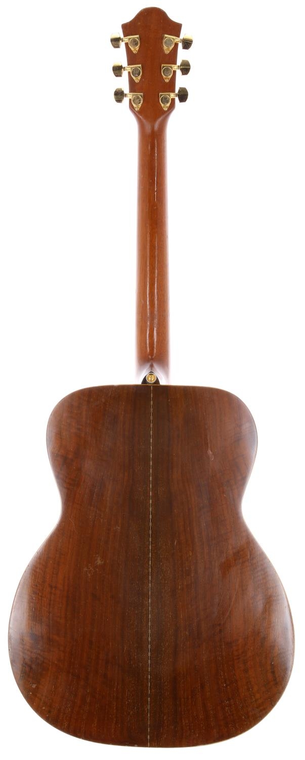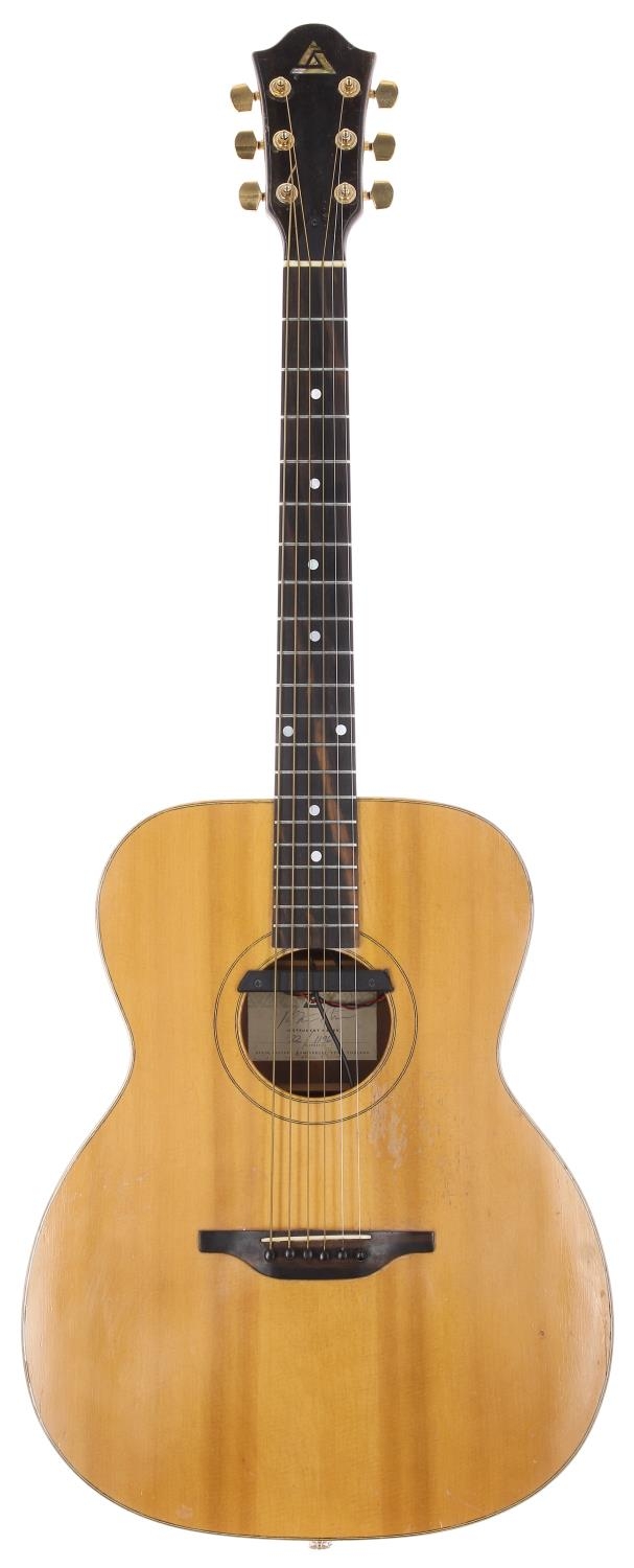 Late 1990s Atkin acoustic guitar, made in Canterbury, England; Back and sides: walnut, stable hairline to right hand side of upper bout, light checking throughout, further scratches and marks; Top: light checking throughout, slight lift to table at bridge towards the bass side, play wear to treble side of sound hole; Neck: mahogany, lacquer checking and various dings; Fretboard: ebony; Frets: good; Electrics: working, Mimesis sound hole pickup wired through to end pin; Case: Hiscox hard case; Overall condition: fair