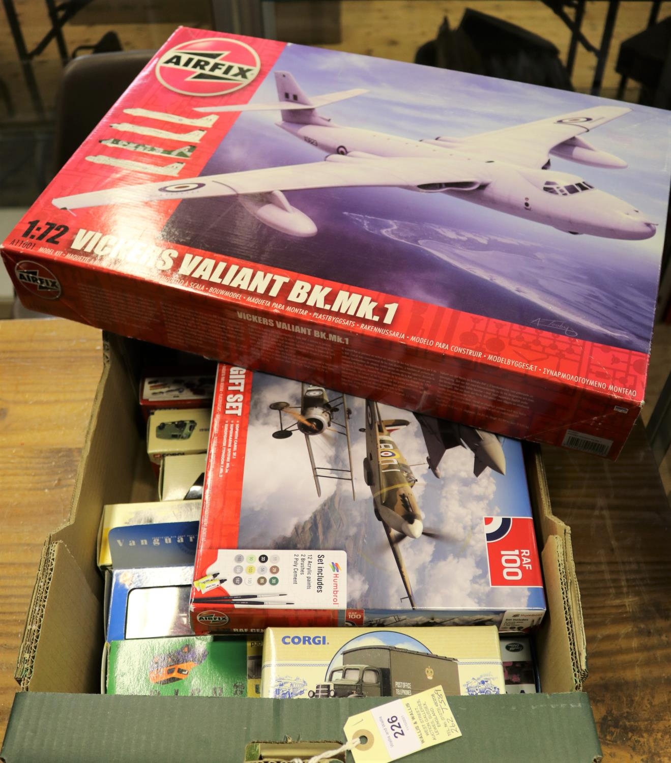 20 Various Makes. 2 unmade Airfix 1:72 kits. An RAF Centenary Gift Set comprising Sopwith Camel, Spitfire and a Eurofighter Typhoon. Plus a Vickers Valliant BK.MK1. Together with 11 Corgi- 2x Scammell Highwayman cranes, Southdown and Pickfords. Fowler crane engine and log trailer. Bedford 'O' series van, P.O. Telephones. Morris J van, Southdown. Bedford CA van, Cambrian News. Morris 1000 van, Co-Op. Morris J van, Friendly Assurance. Morris 1000 van and Mini van, P.O. Telephones. Plus a 1926 Renault truck, The Star Brewery. Together with 7 Vanguard- Ford Consul GT Police car, West Yorkshire. 2x Ford transit vans- Telecommunications set and a Post Office Telephones. Commer Dropside, Carlsberg. Bedford 'S' type van, Surf. Austin A40 van, Castrol and a Ford Popular van, Fordson. All boxed, minor wear to some. Contents VGC-Mint. £70-100