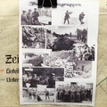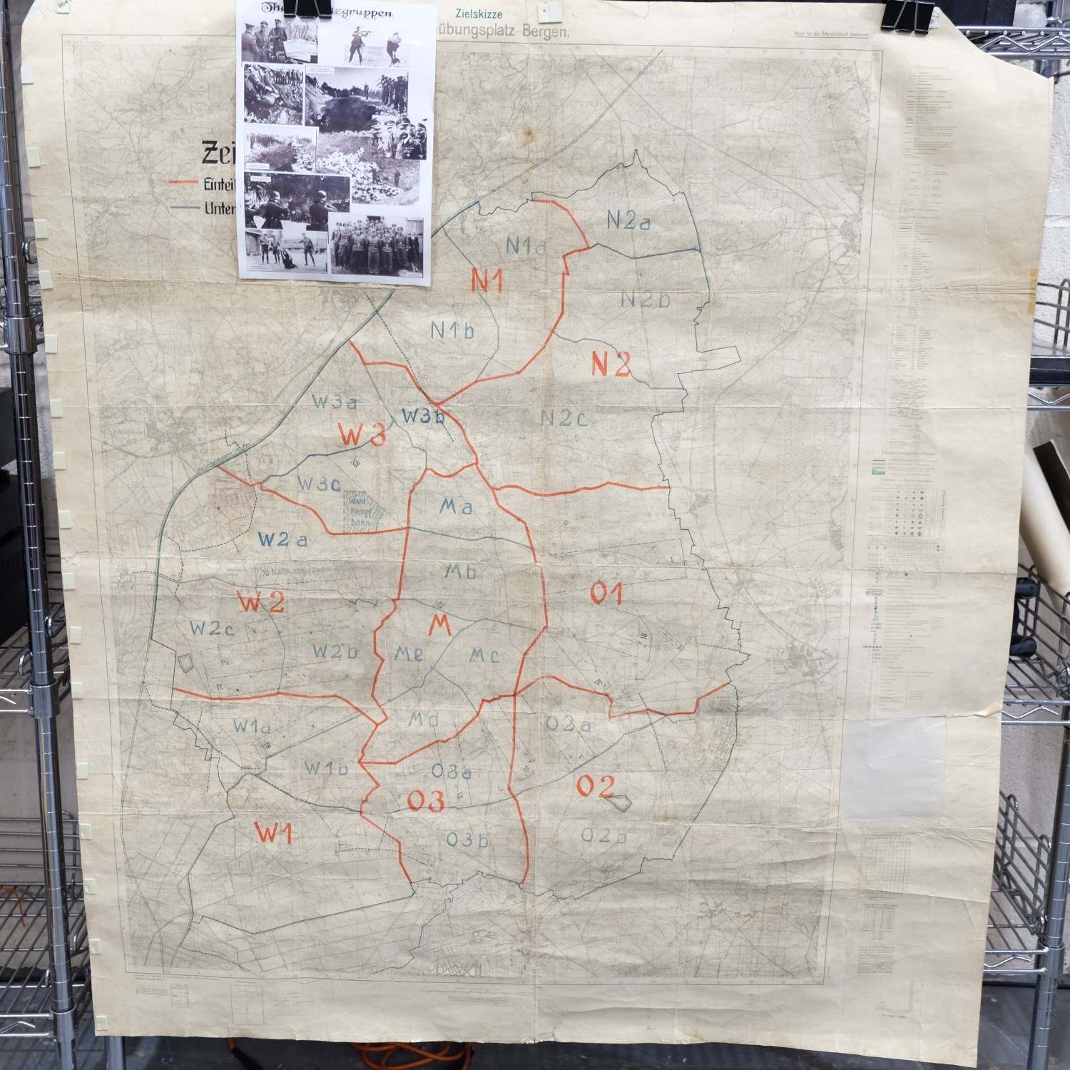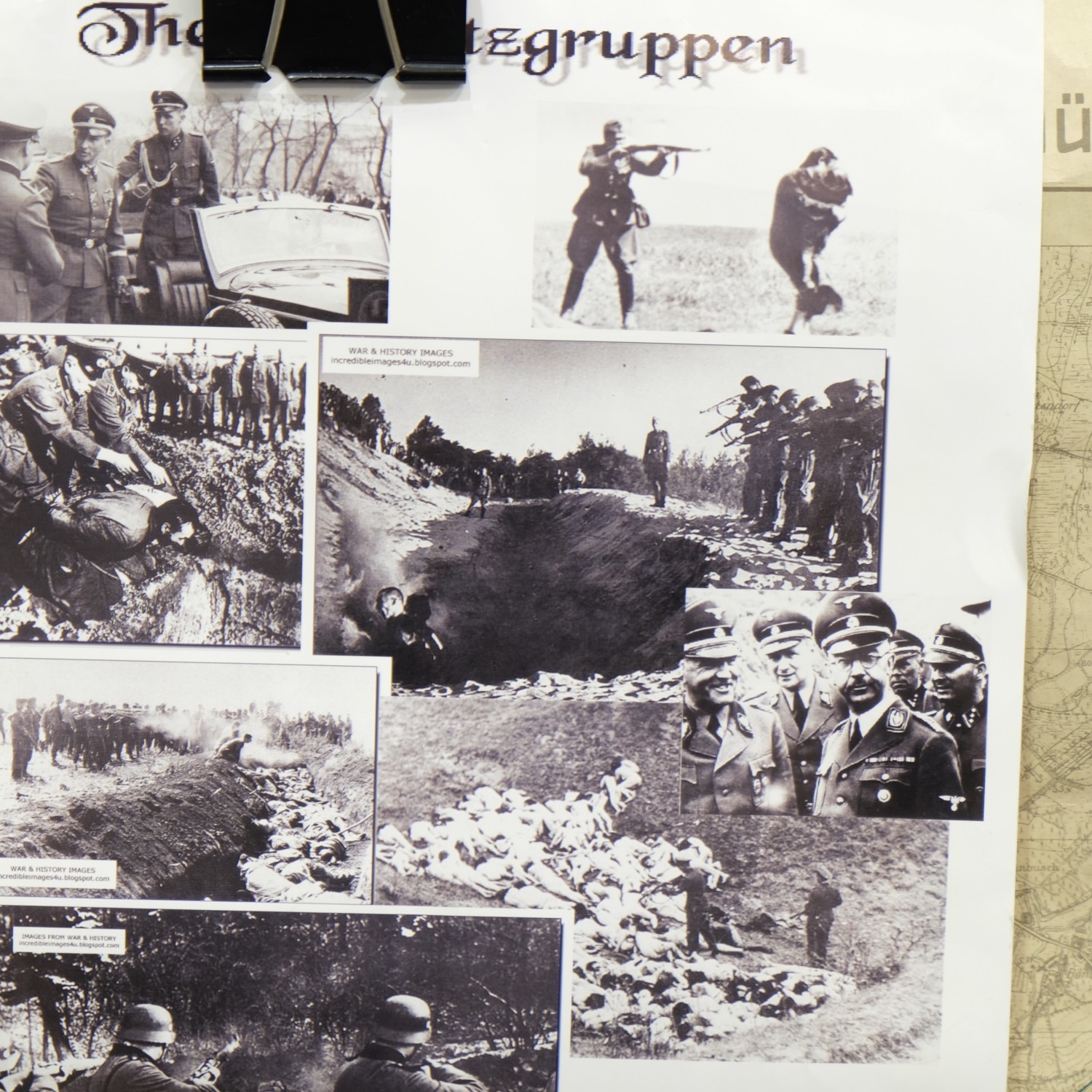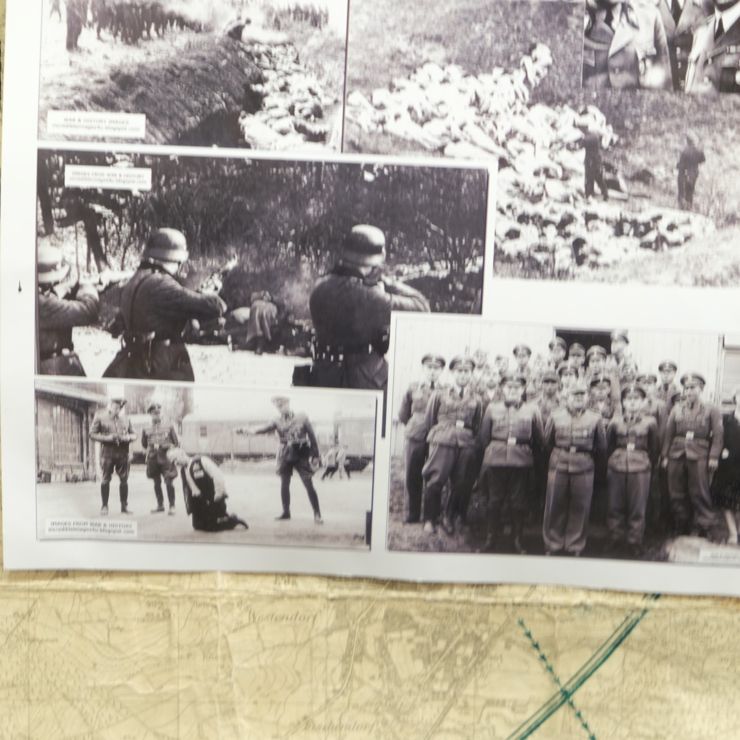 German WWI-II paper map, subdivided into sectors, with a photograph of collated images relating to the Einsatzgruppen Death Squad