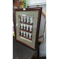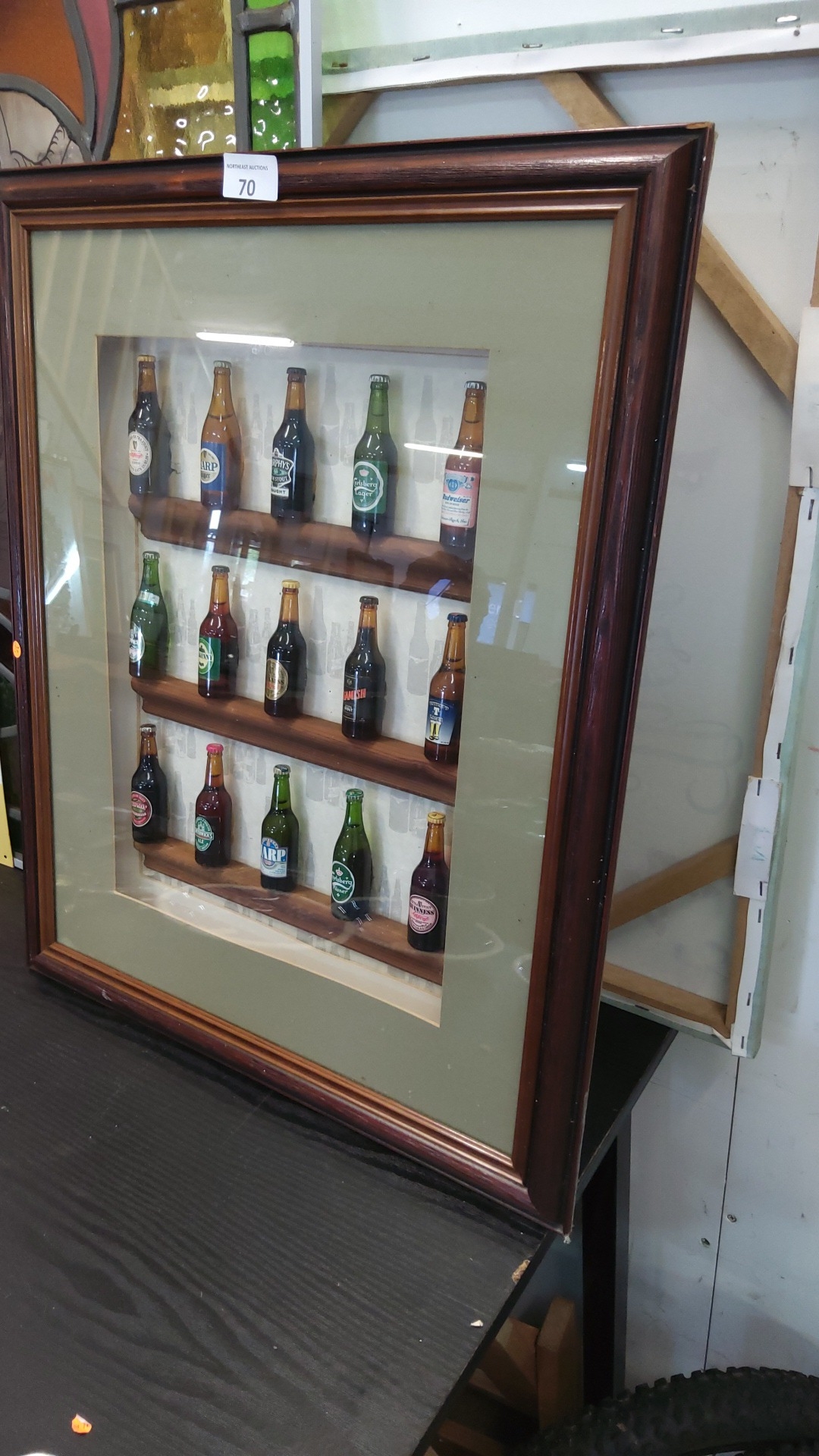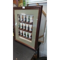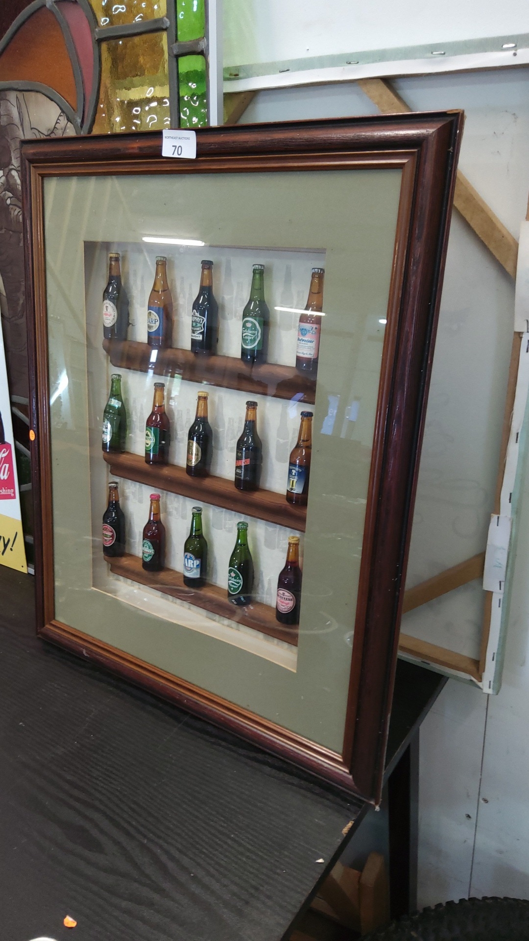 Shadow-boxed display of 15 miniature glass beer bottles with assorted brewery labels, mounted on three wooden shelves within a glazed wooden frame, late 20th century.