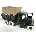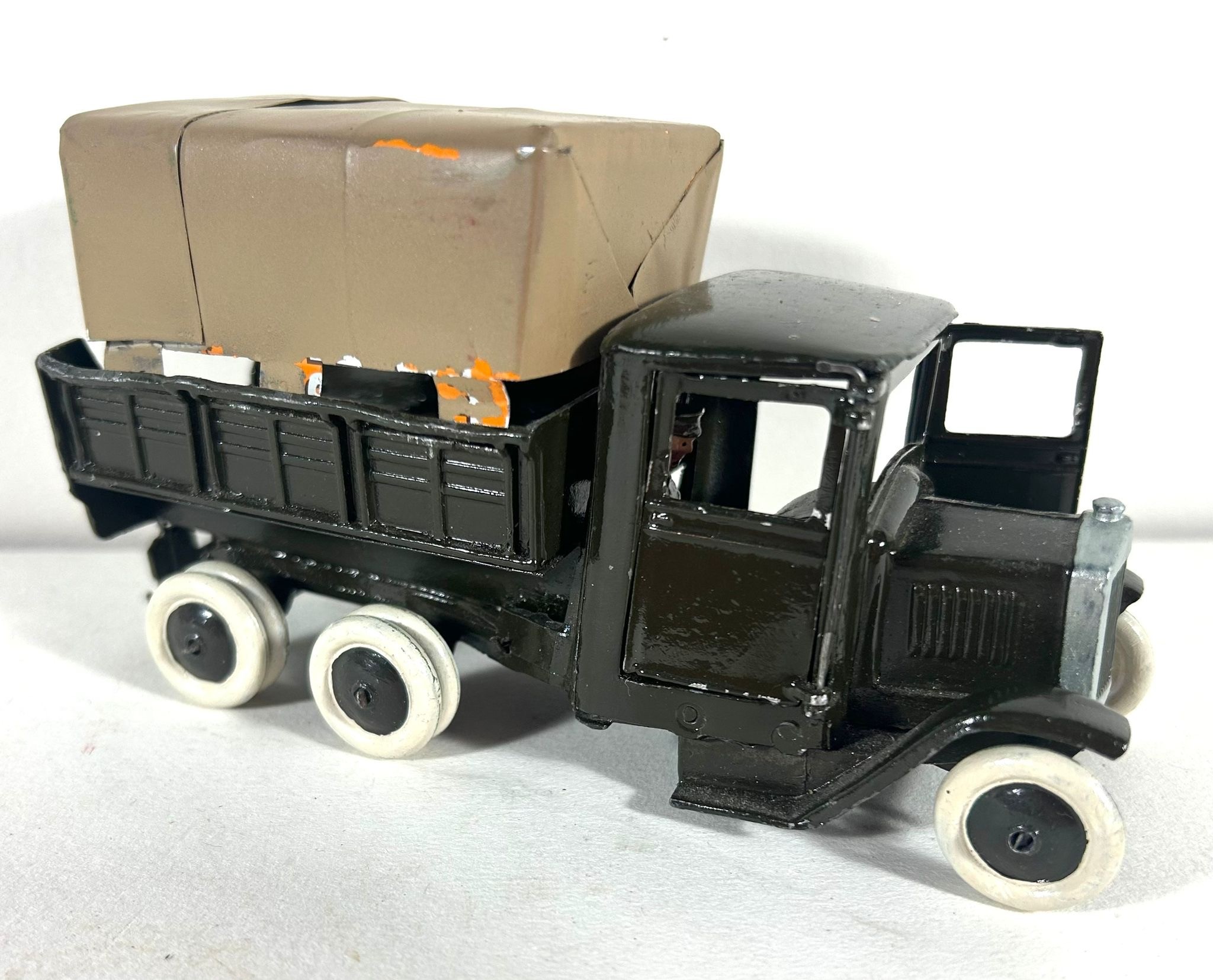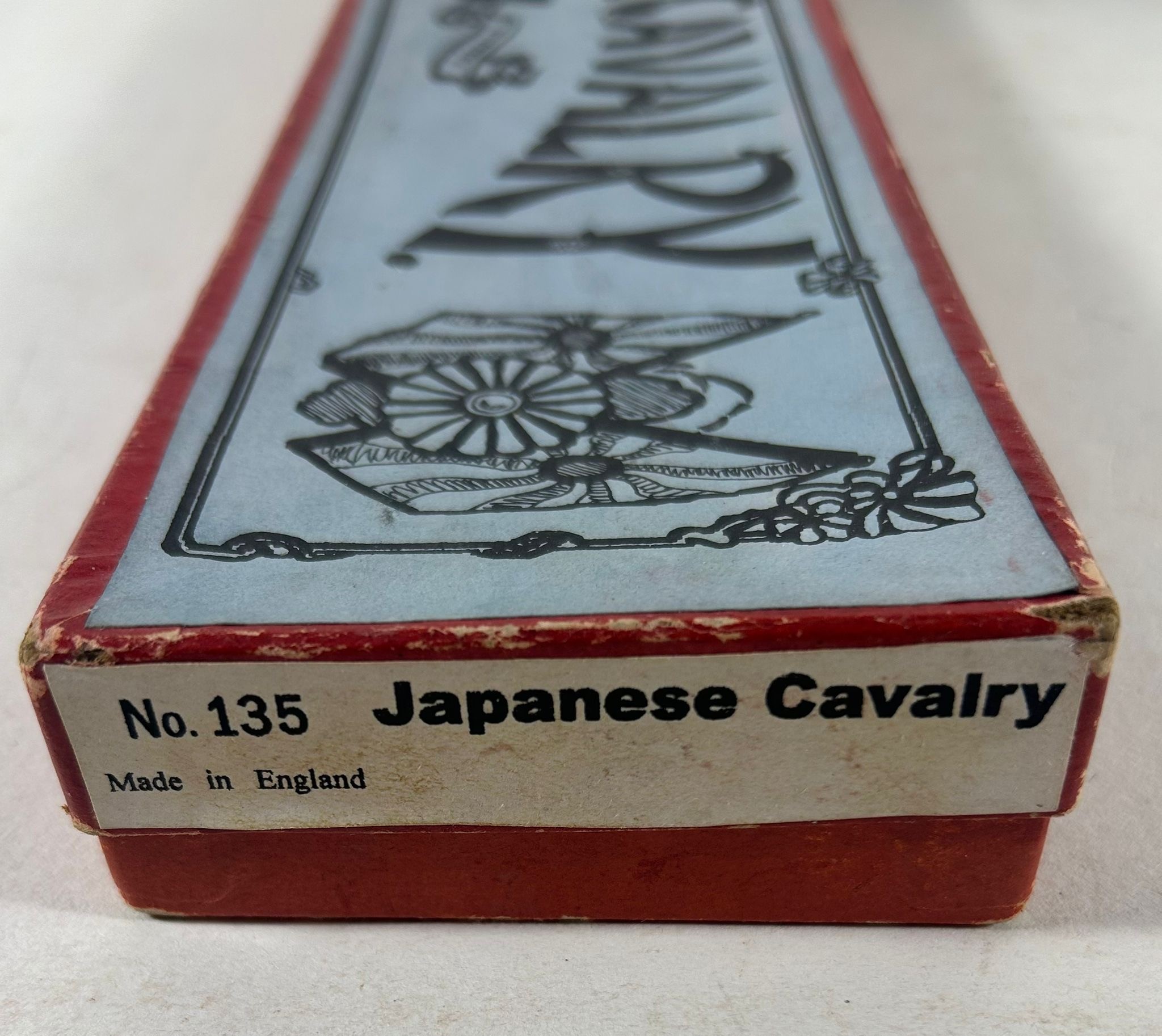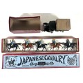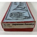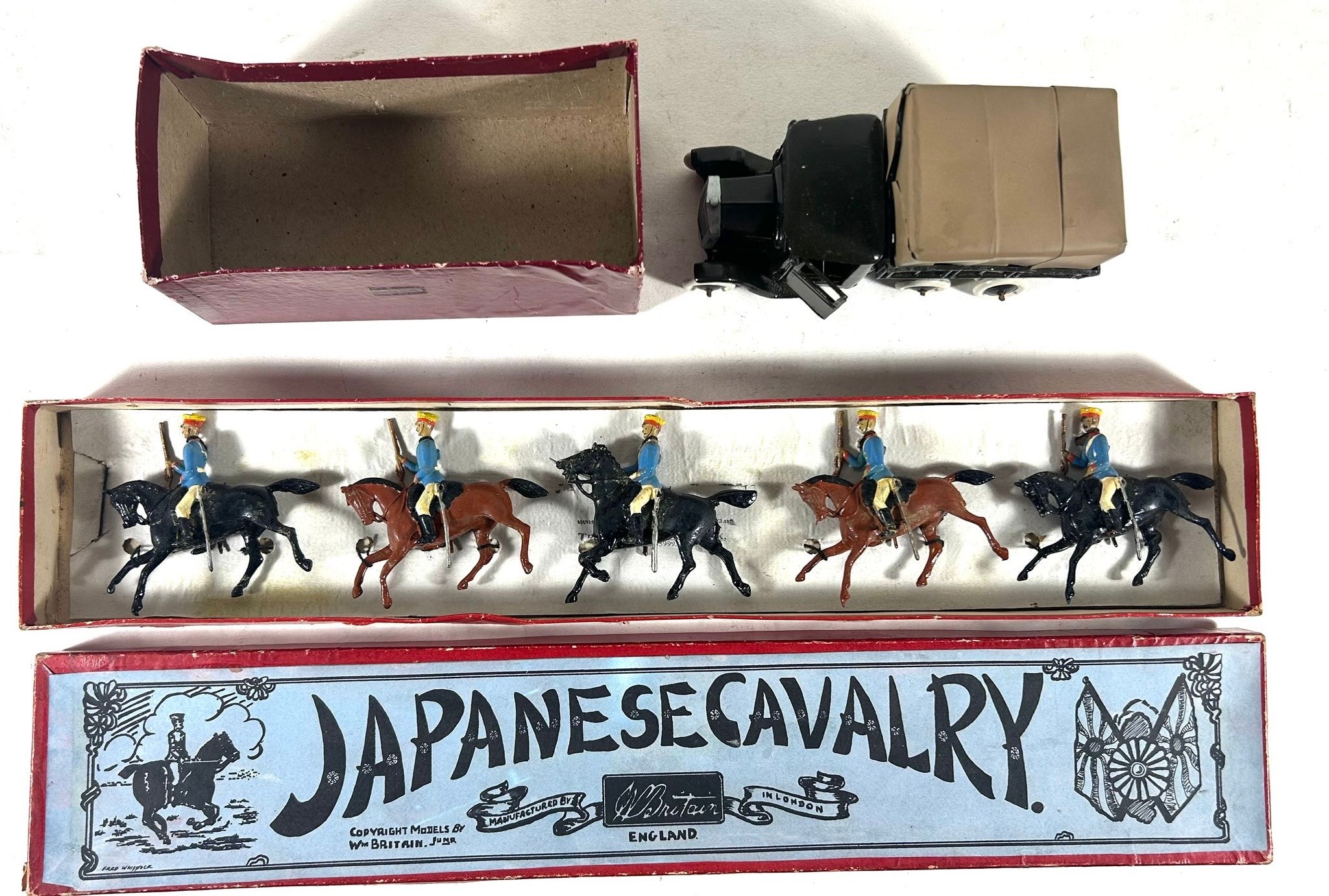 A Britains Japanese Cavalry. Set 135. 5 mounted soldiers, Officer with sword, 4 troopers with carbines all at the trot. Remounted in an original Fred Whisstock box. Together with a restored 10 wheeled 3 axle army lorry, in deep olive green with replacement tin tilt in tan. Complete with driver. GC