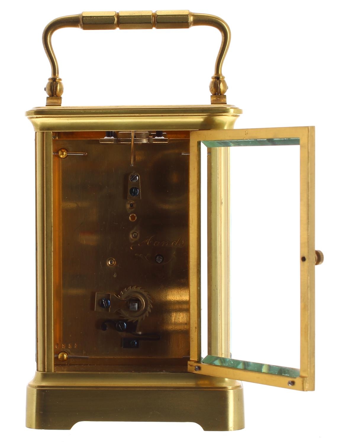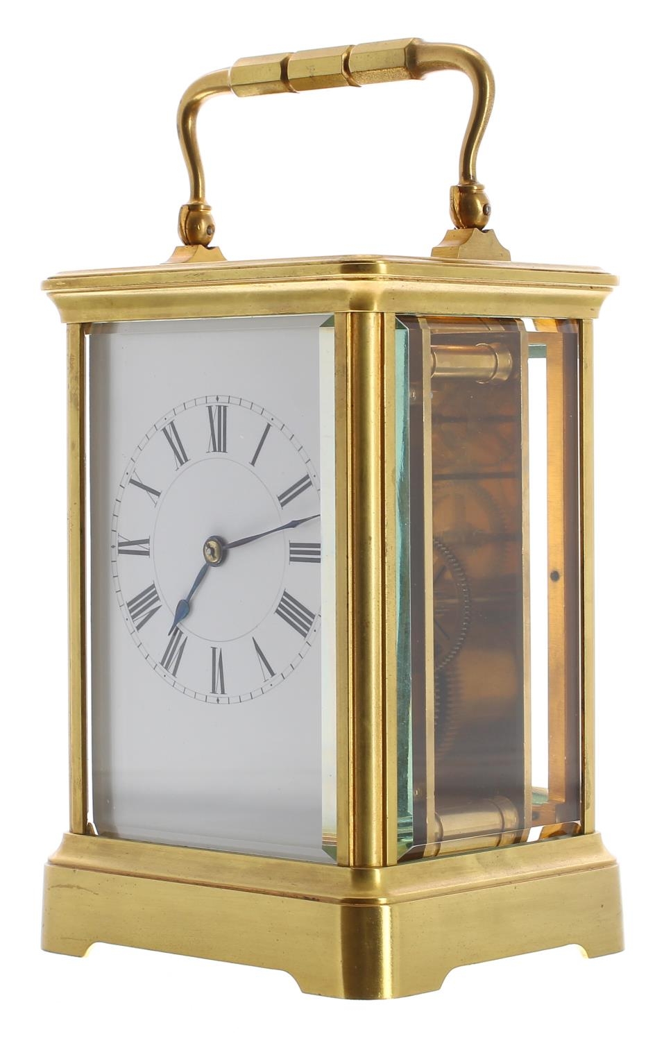 Carriage clock timepiece, the movement back plate stamped no. 6351, within a corniche gilded brass case, 7.25" high