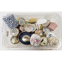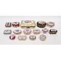 Collection of Limoges and French porcelain gilt-metal mounted snuff and patch boxes, early 20th century and later, printed and painted marks, variously decorated with bouquets of flowers, in sizes, together with a yellow ground casket painted with flowers 13 cm and a blue-ground Sevres-style oval casket decorated with lovers, most approx. 6-7 cm wide (15)