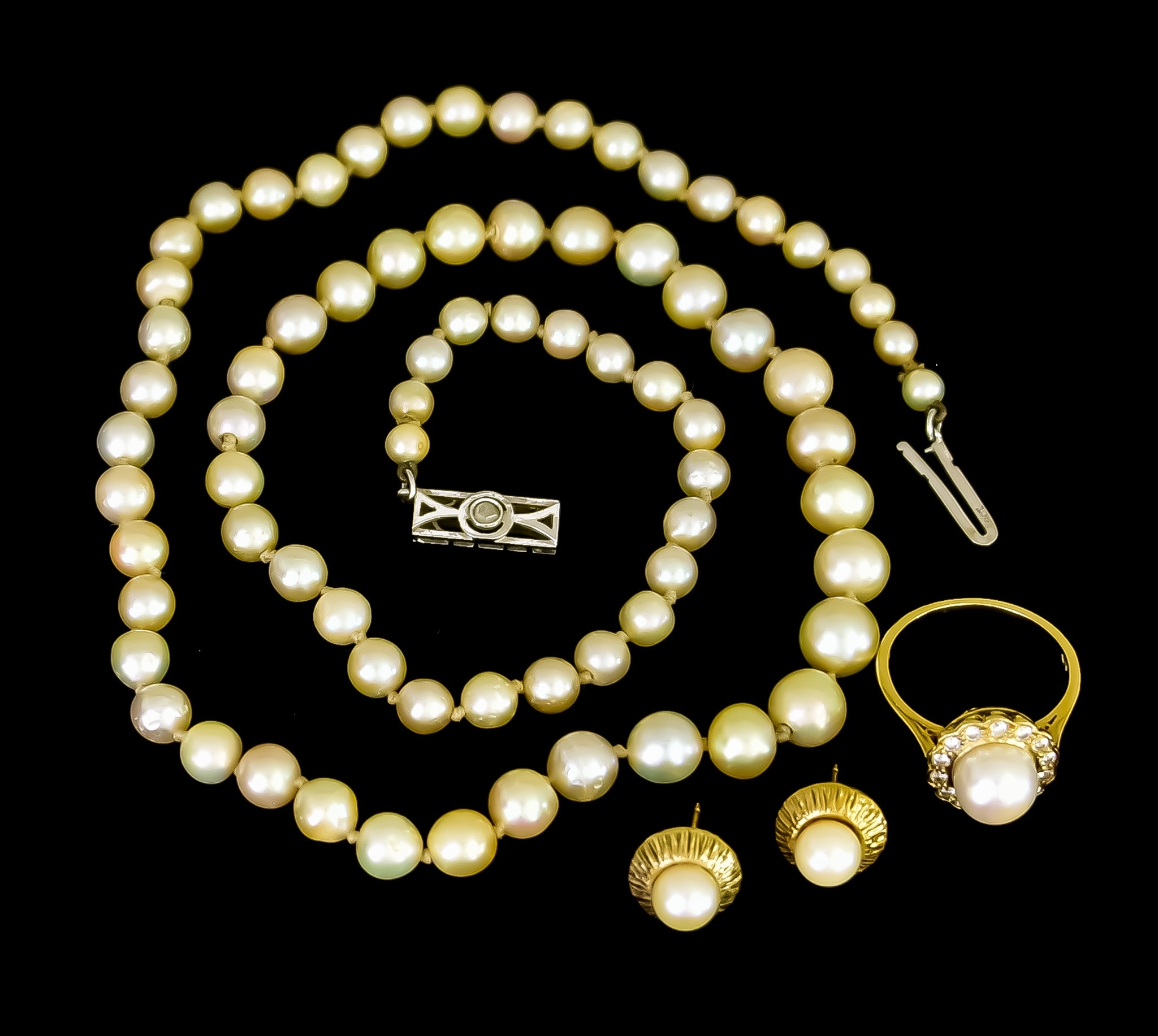 A Cultured Pearl Suite, comprising - graduated string of pearls, approximately 480mm in length with silvery metal clasp, an 18ct gold ring set with centre cultured pearl surrounded by small diamonds, gross weight 3.8g, a matching pair of 18ct gold earrings for pierced ears set with cultured pearls, gross weight 2.3g, total gross weight 23.8g