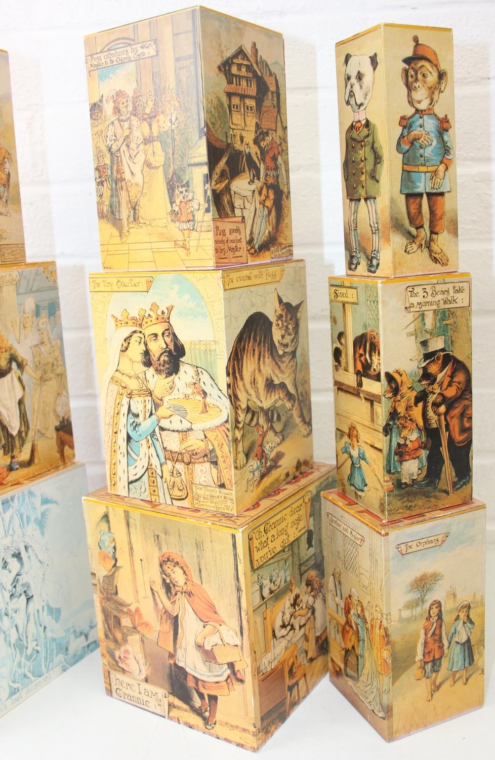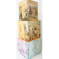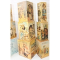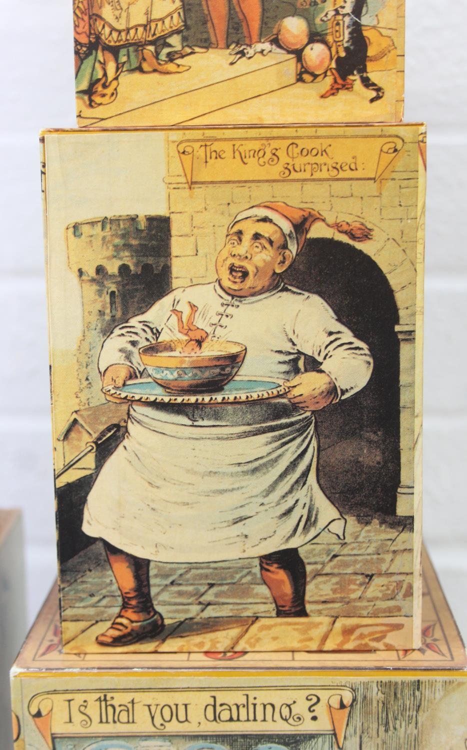 Gates Incorporated of West Peterborough, New Hampshire, a good quality reproduction of a set of antique wooden toy stacking boxes decorated with classic nursery rhymes etc, 9 boxes, the largest a 17cm cube