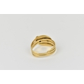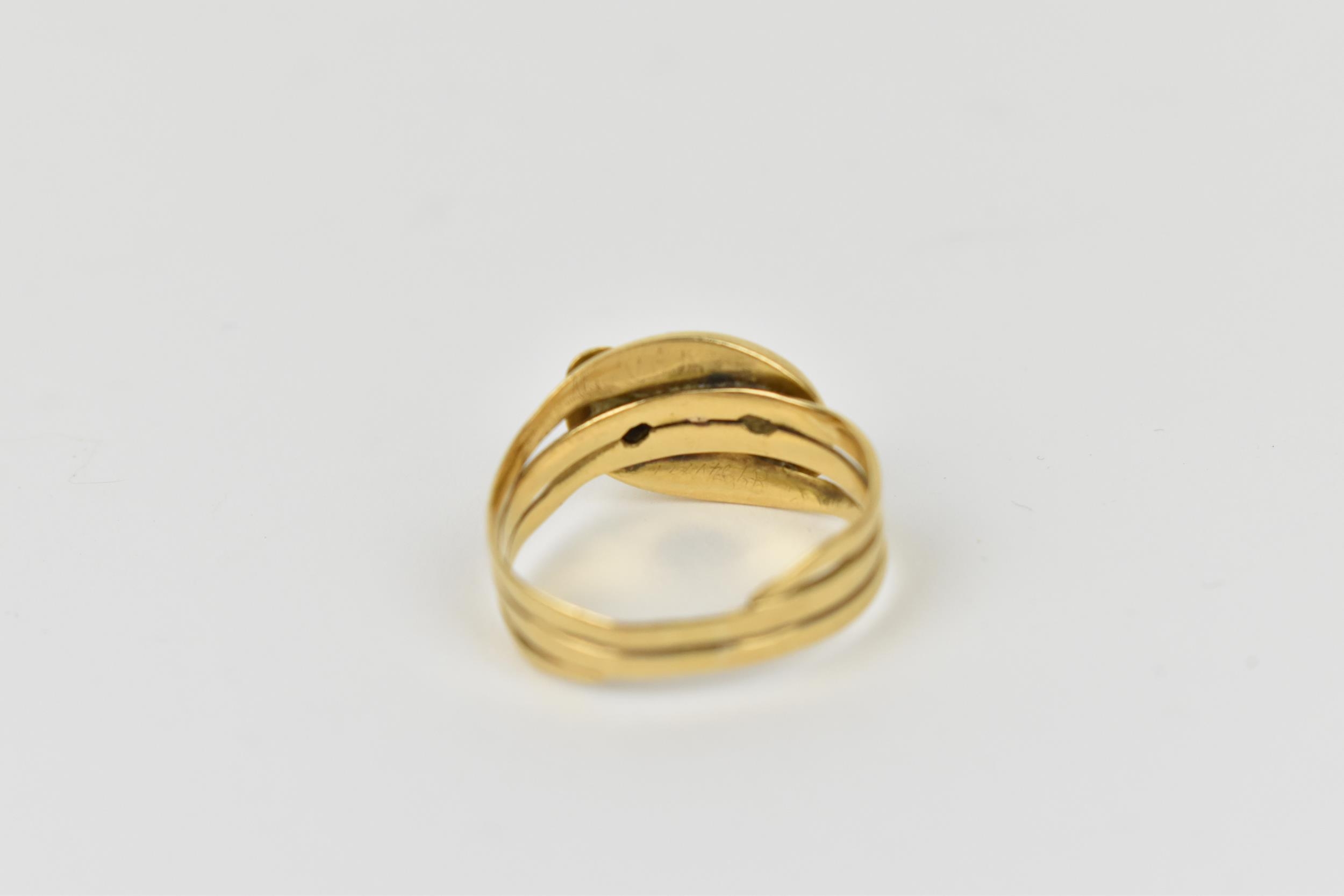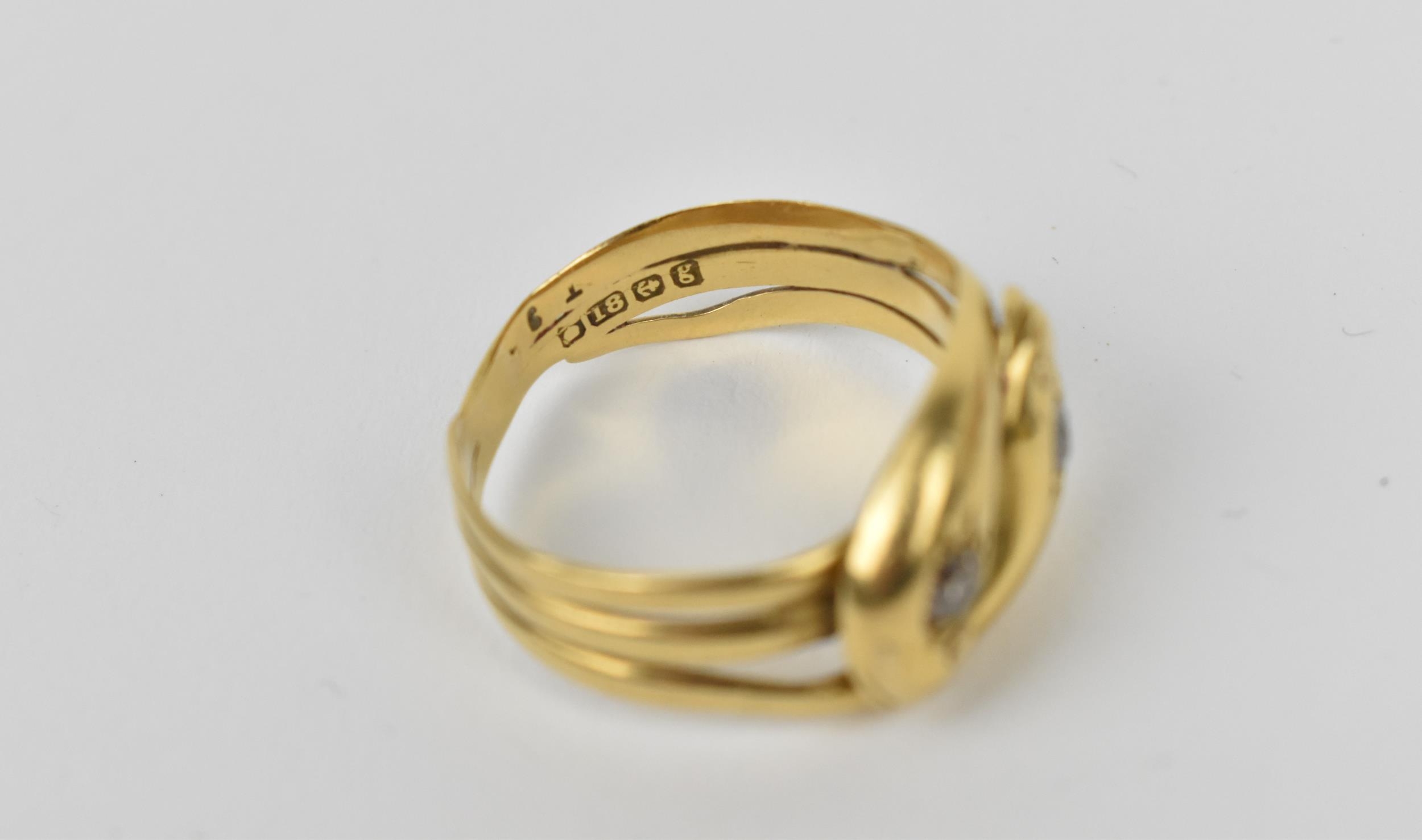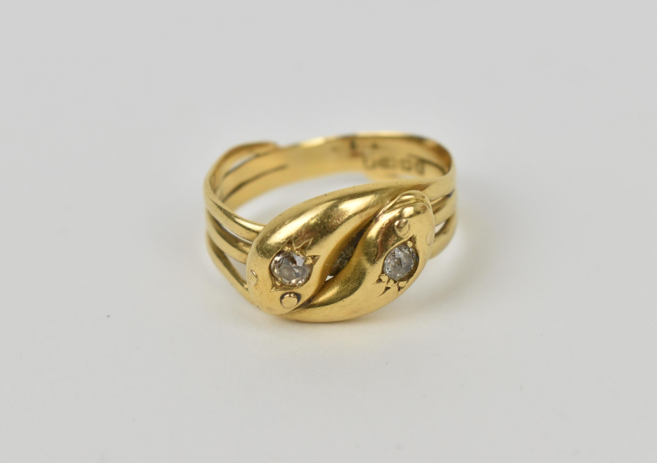 An 18ct yellow gold and diamond double snake ring, modelled as two entwined serpents, each head inset with a single cut diamond, size S, 6.74 grams