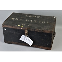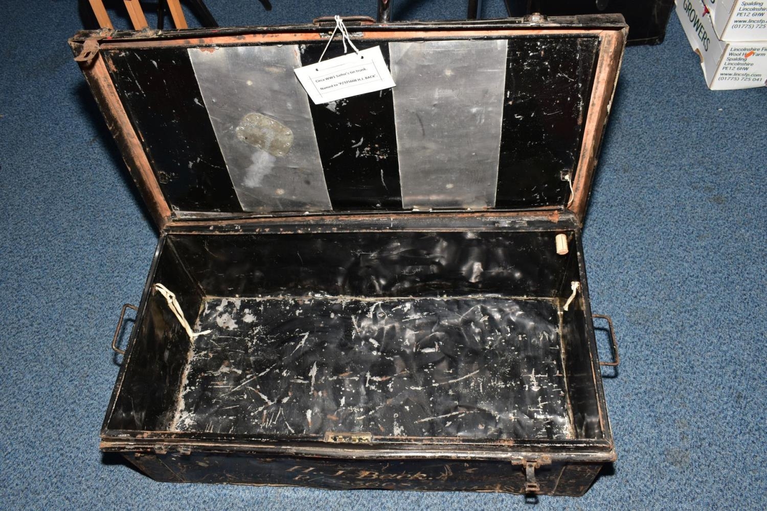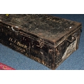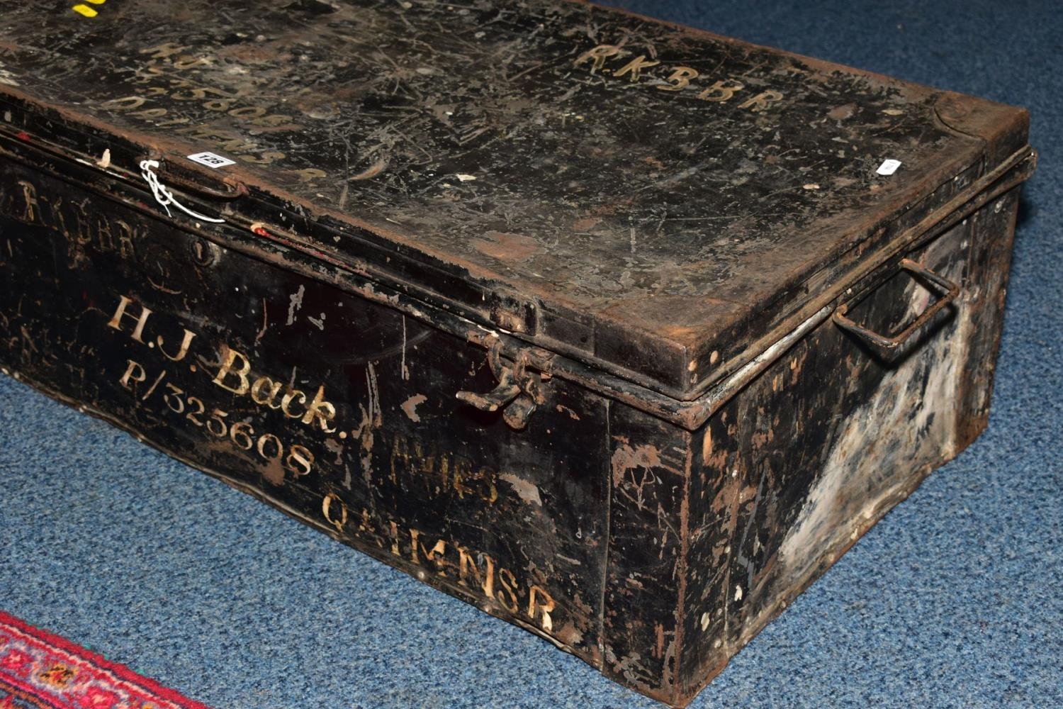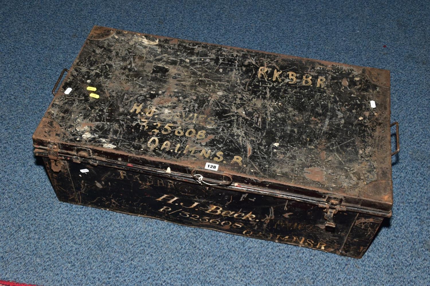 A LARGE TIN TRUNK, approximately 88cm x 29cm x 46cm, black in colour with the following painted on P/325608 H.J. BACK, also painted on is RKBBR & QAIMNSR (Queen Alexandras Imperial Military Nursing Service (Reserve), also painted on is another service member H.J. Davies, also a sister
