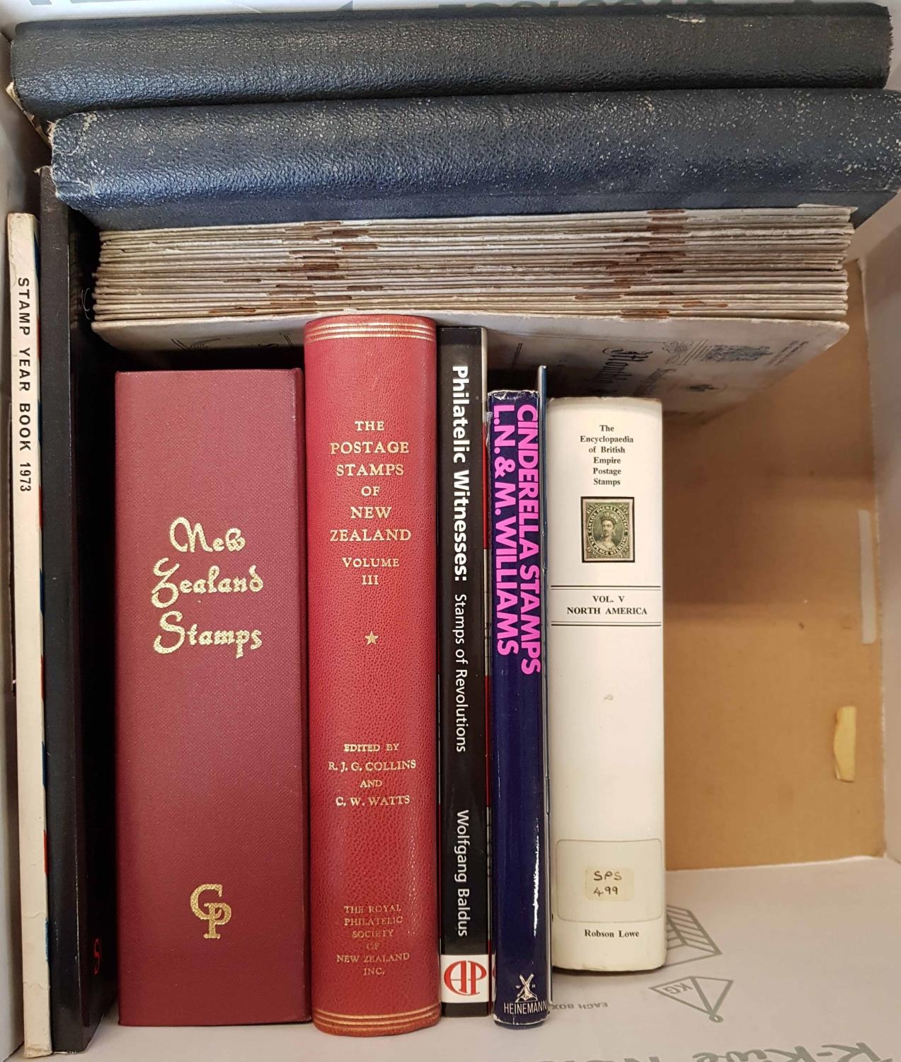 NEW ZEALAND & CANADA: A box containing a small eclectic group of books inc. The Postage Stamps of NZ Vol. 3 by Collins & Watts, NZ Stamps by Campbell Paterson (contains 1997 supplements but not checked for others), The Encyclopaedia of British Empire Postage Stamps Vol. 5 North America by Lowe, Philatelic Witnesses: Stamps of Revolution by Baldus, Cinderella Stamps by Williams, a run of SG Monthly Journal 1925-27 (loose with original covers) & 1931-33 (in springback albums without original covers). All in fine condition. (7 books + journals) Cross Reference: NEW ZEALAND, CANADA
