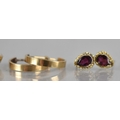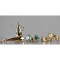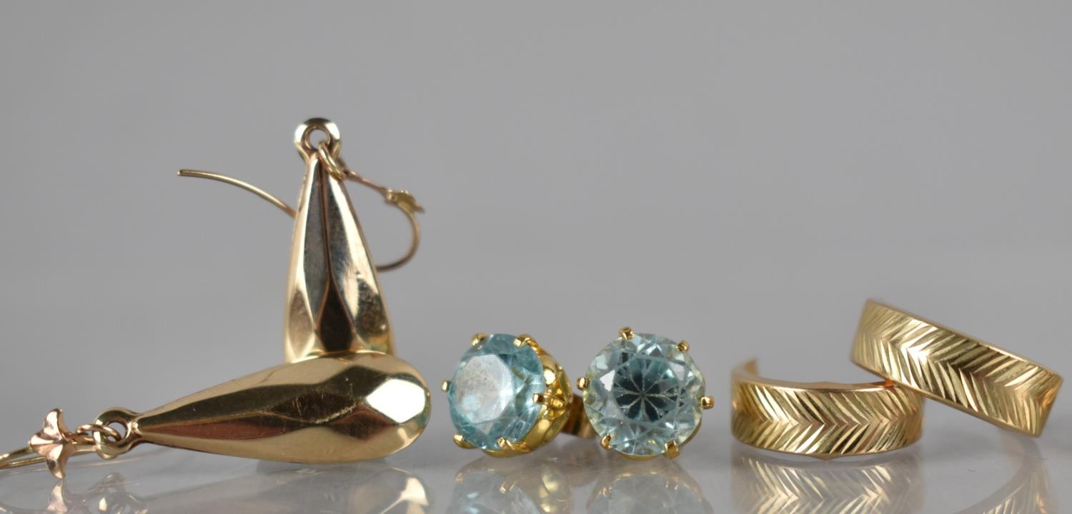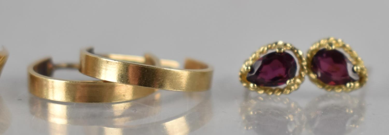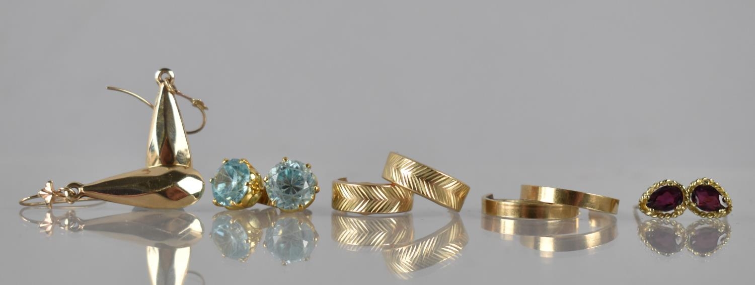 A Collection of Gold and Gold Coloured Metal Earrings to include 9ct Gold Hooped Earrings, 9ct Gold and Garnet Earrings, Unmarked Yellow Metal and Blue Stone Earrings (Testing as Sapphires) and Two Pairs of Unmarked Yellow Metal Earrings to include Faceted Pear Shaped Drops and Hoops. 6.9gms Total