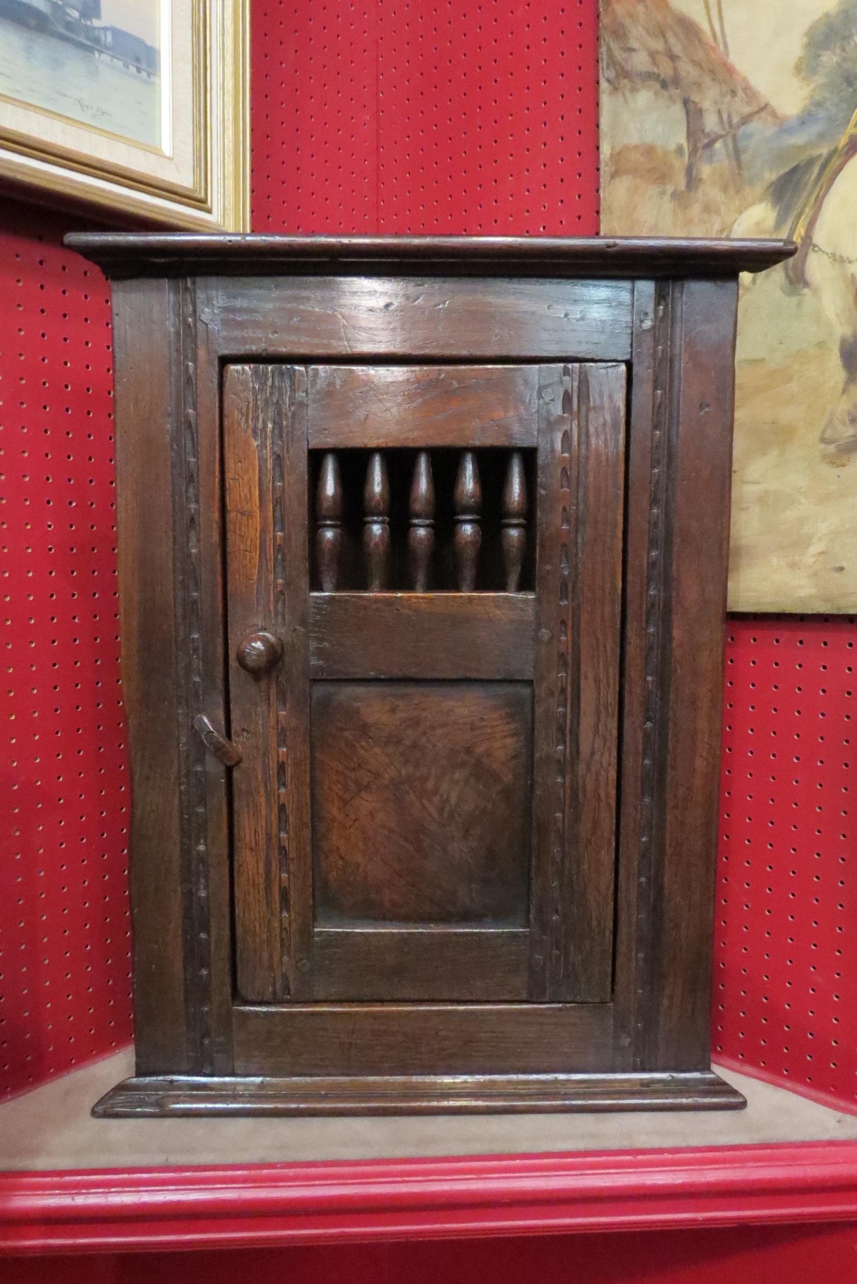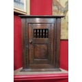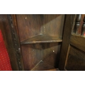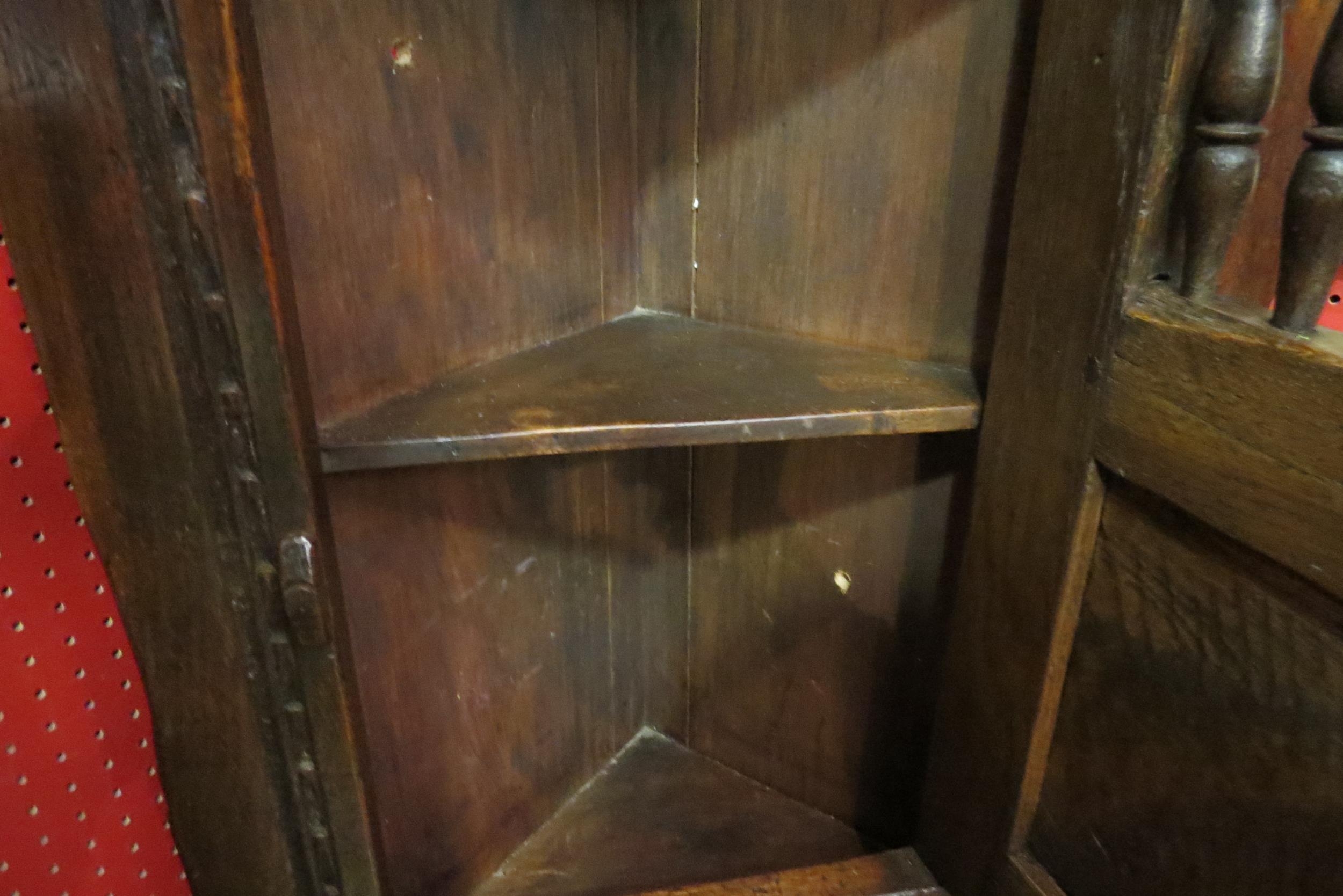 In the manner of "Titchmarsh & Goodwin", an oak corner "Dole" cupboard of small proportions with chip carved decoration and turned spindle door, 60cm tall x 47cm wide x 25cm deep