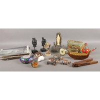An oak butlers tray with an assortment of collectables. To include two Rabone Chesterman Ltd, vintage wind-up tape measures, vintage wooden cotton reels (Sylko & Clark & Co) a cast metal horse, a large wooden ruler and bone carved necklace etc.