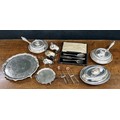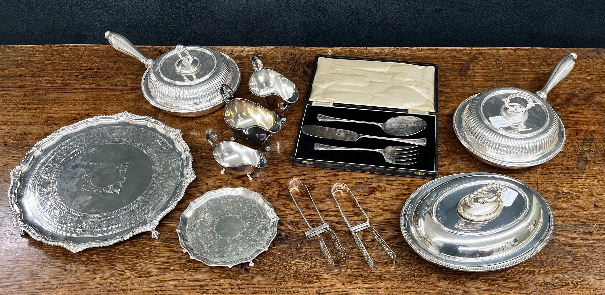 Collection of silver plated wares, comprising a salver with engraved decoration, three sauceboats, a waiter, oval entrée dish and cover, pair of circular serving dishes with side handles and two pairs of asparagus tongs