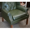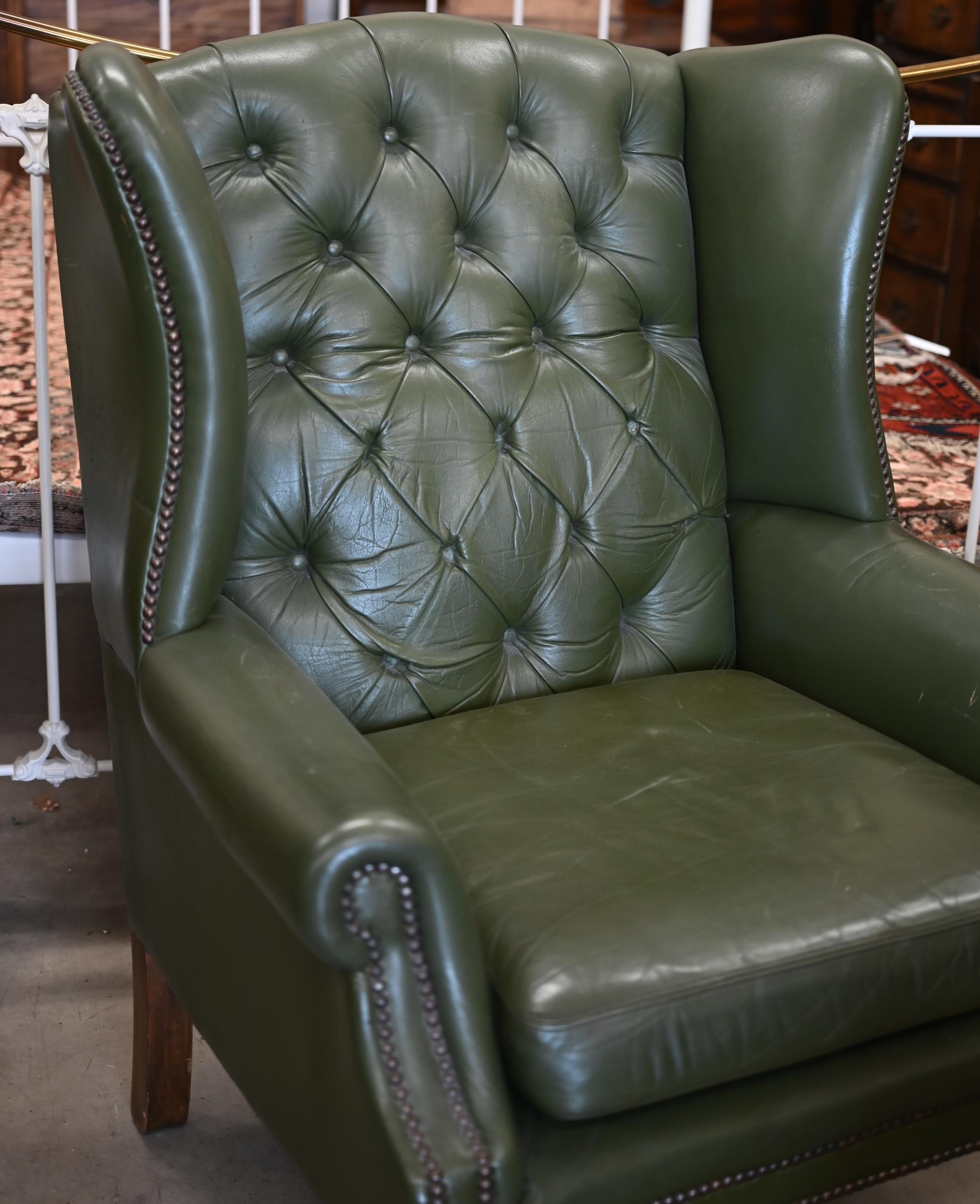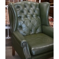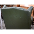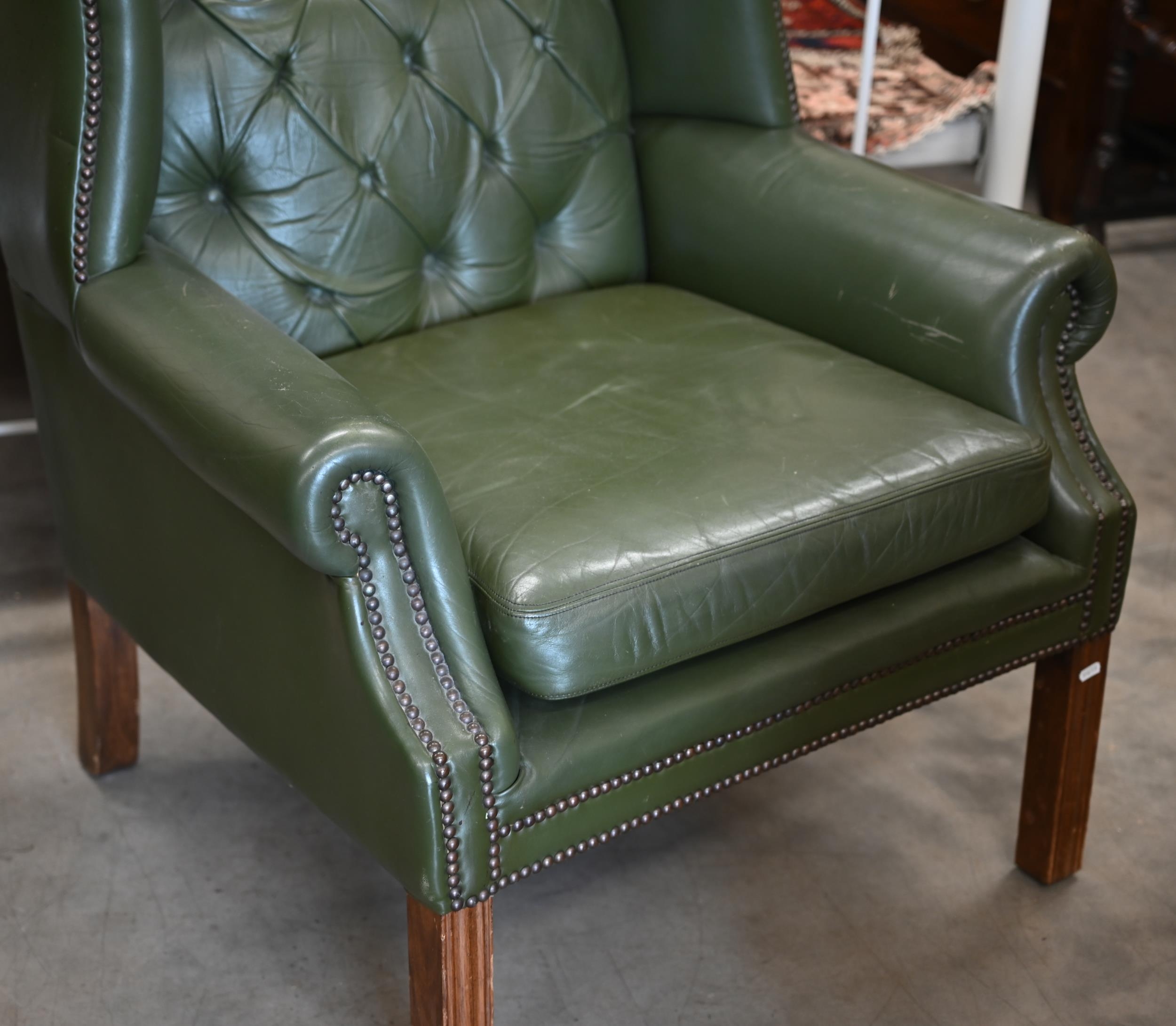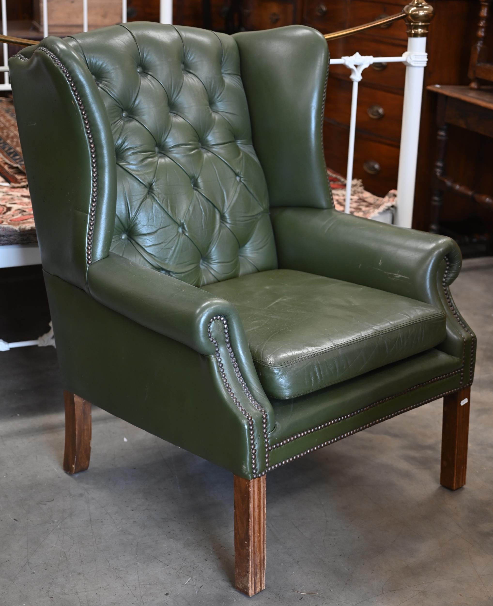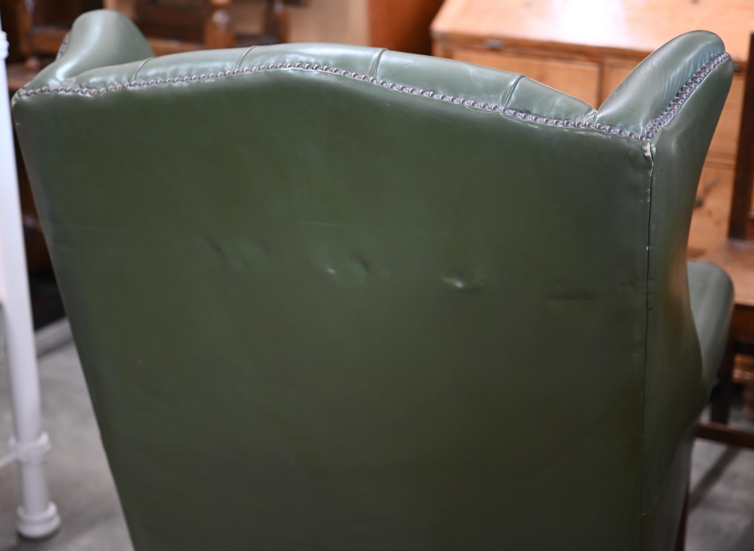 A Georgian style wingback armchair, studded button back green leather upholstery on moulded legs