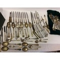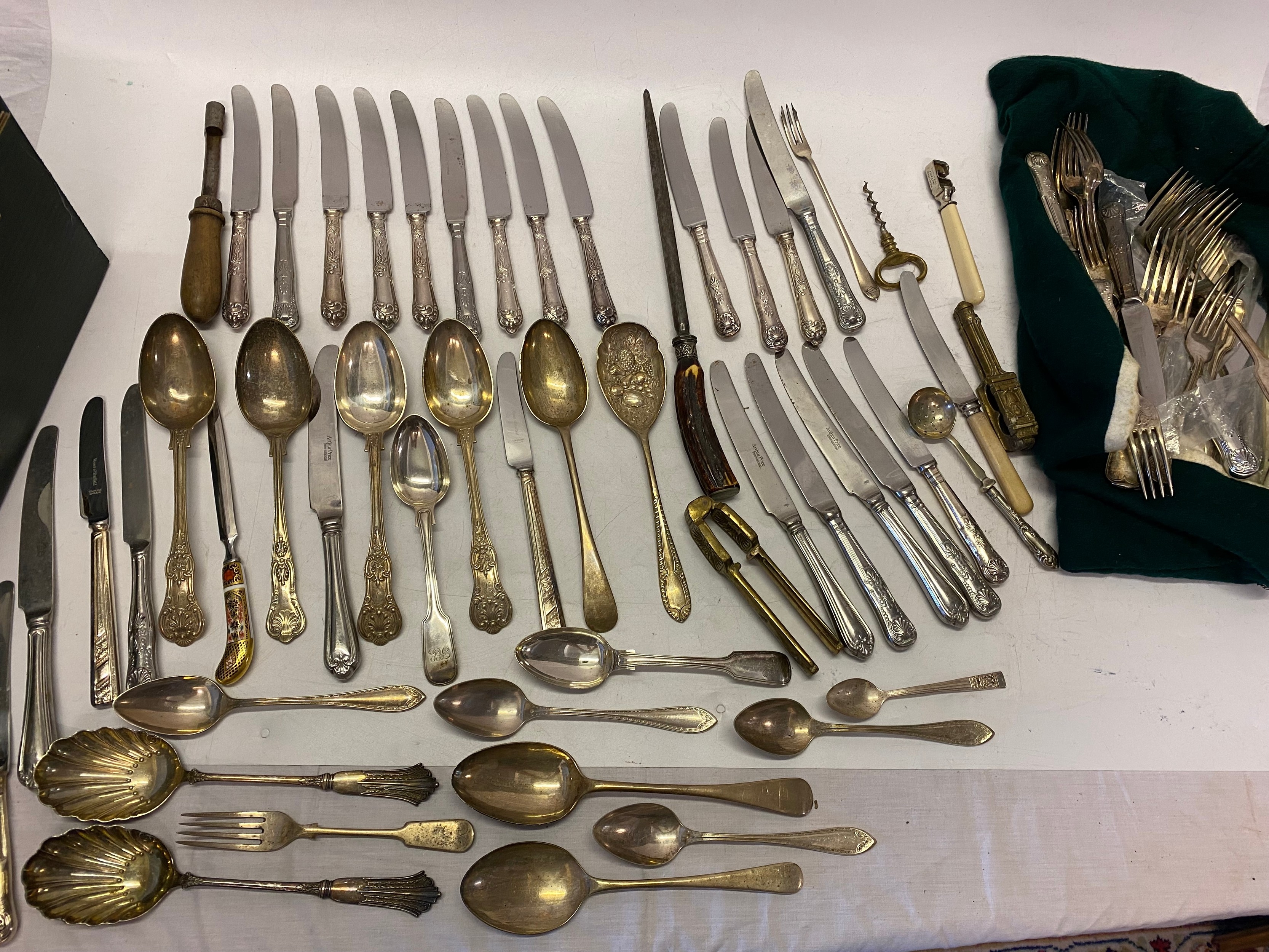 A selection of silver plated flatware including dessert knives with Kings pattern handles, two pairs of brass nut crackers, berry spoons, carving steel with antler handle, apple corer etc..