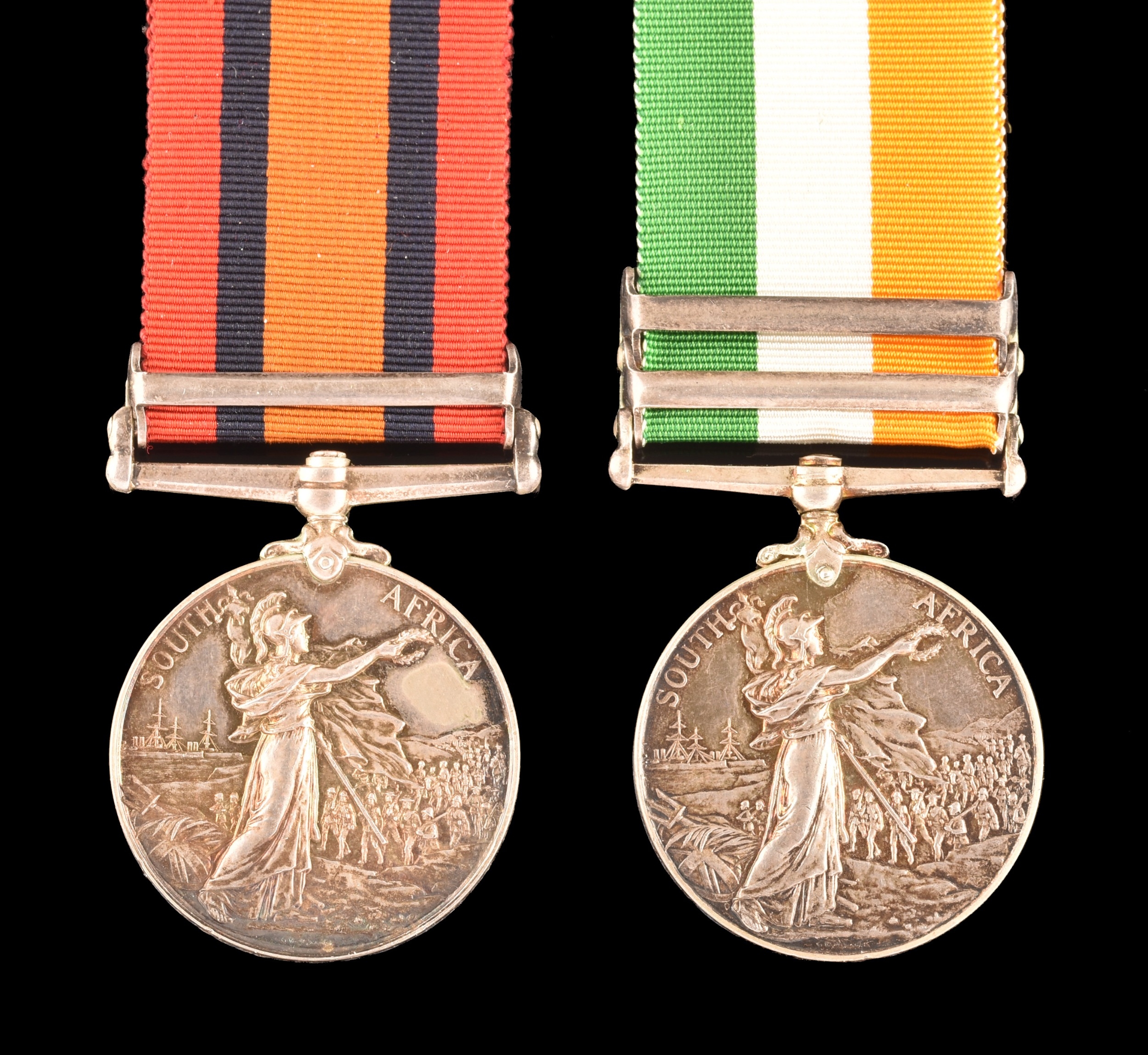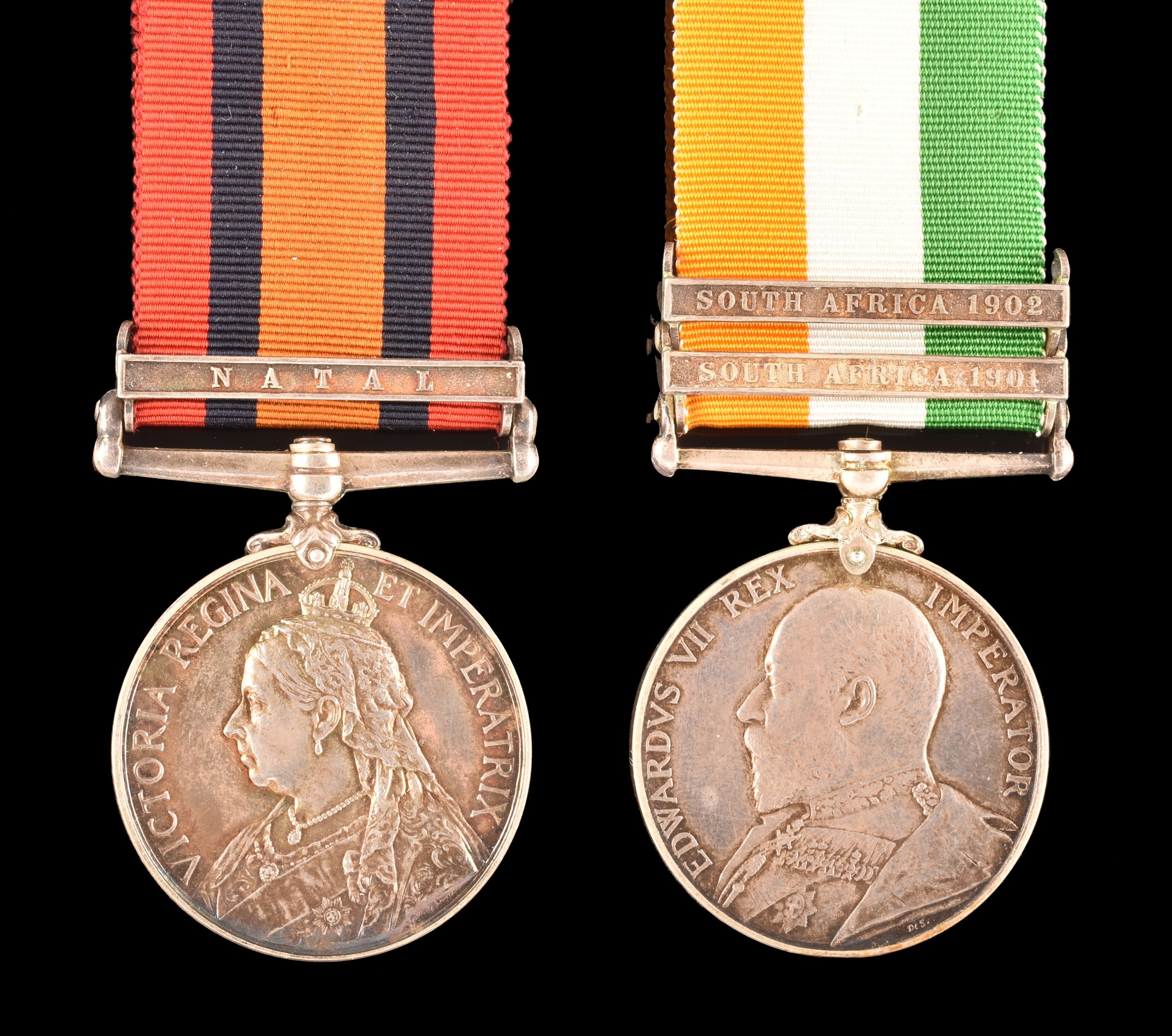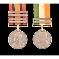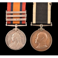 A Boer War medal pair awarded to: 471 Sergeant C. Jenkins, Army Pay Corps. Comprising: a QSA Queen’s South Africa medal with 1 clasp Natal (471 Serjt. C. Jenkins, A.P.C.); and a KSA King's South Africa medal with 2 clasps South Africa 1901 and South Africa 1902 (471 Corpl. C. Jenkins, A.P.C.).