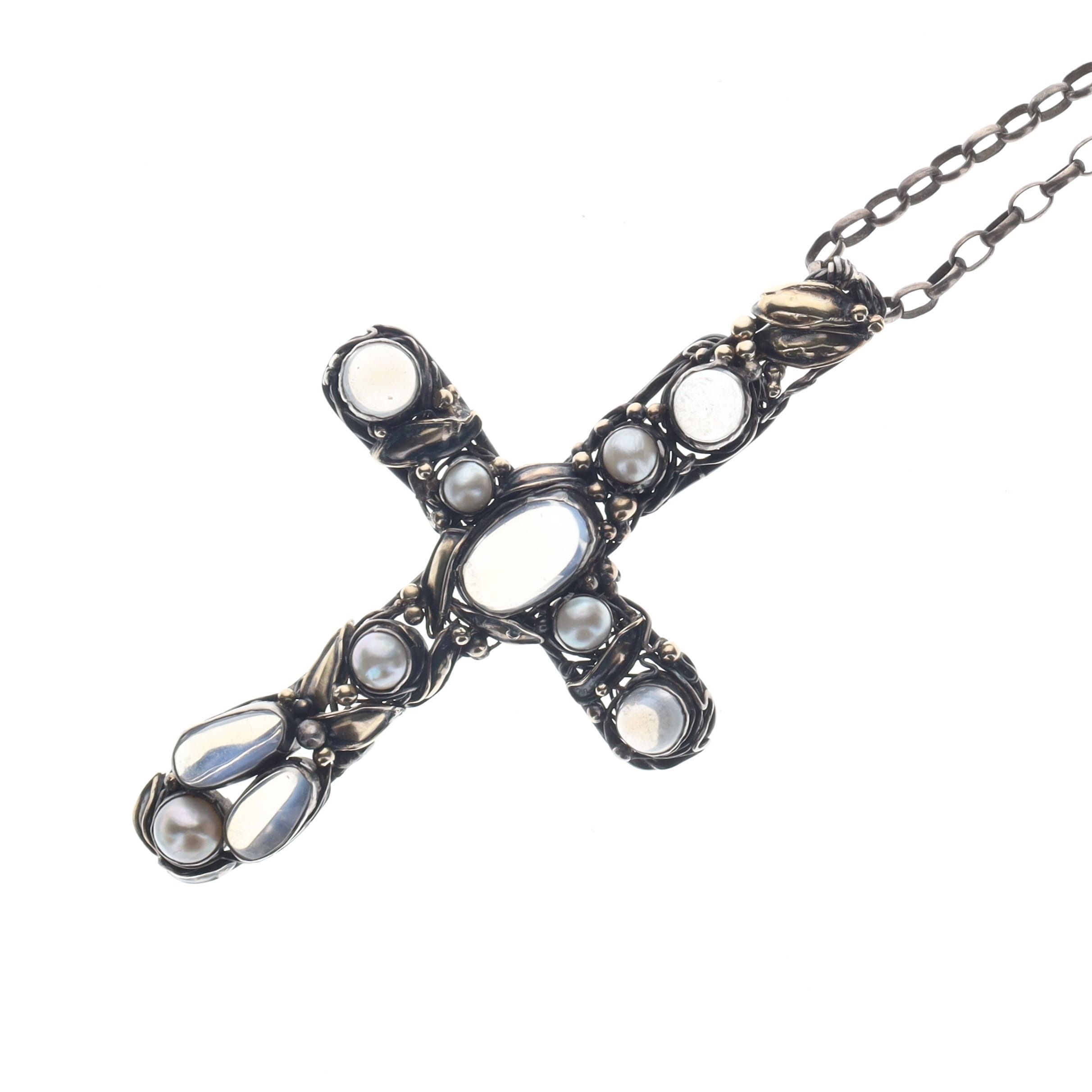 Moonstone and Pearl Silver Cross Pendant Necklace with Gold Accents