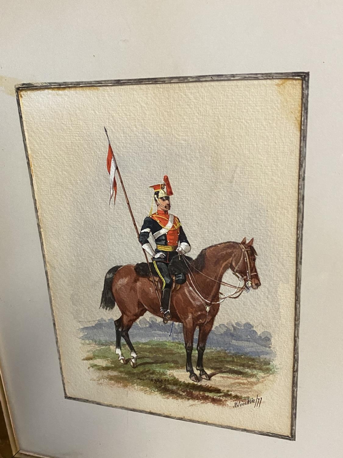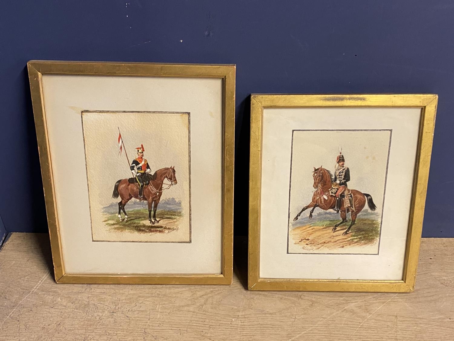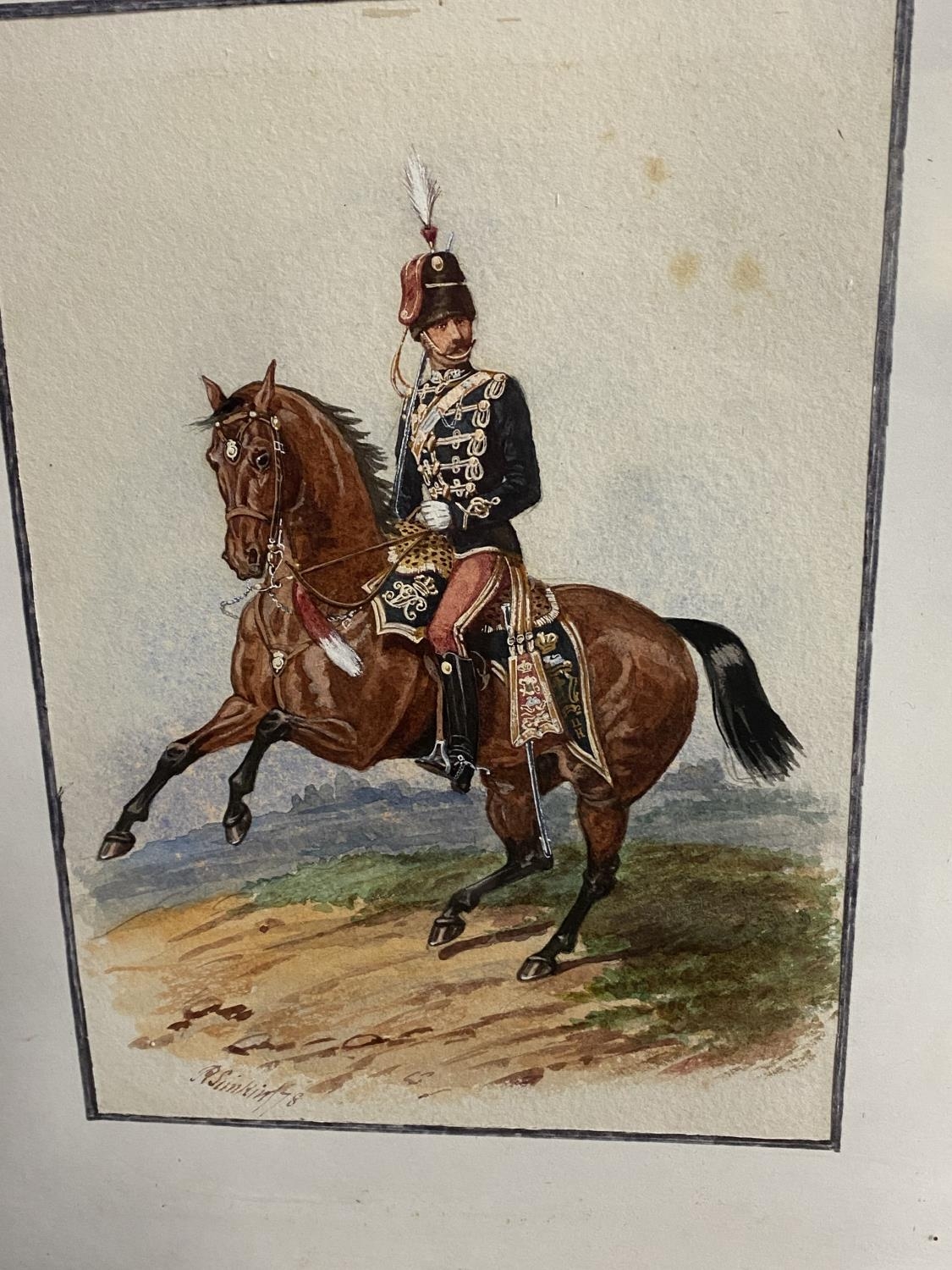 Richard Simkin (1840-1926), pair of watercolours "Cavalry officers mounted" signed lower left and right (1877 and 1878) 20 x 14, 22 x 16 framed and glazed (Provenance: local country house clearance, originally the Miss Calley, Burderop Park Estate, Wroughton) ( Condition, some light foxing generally good.