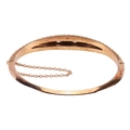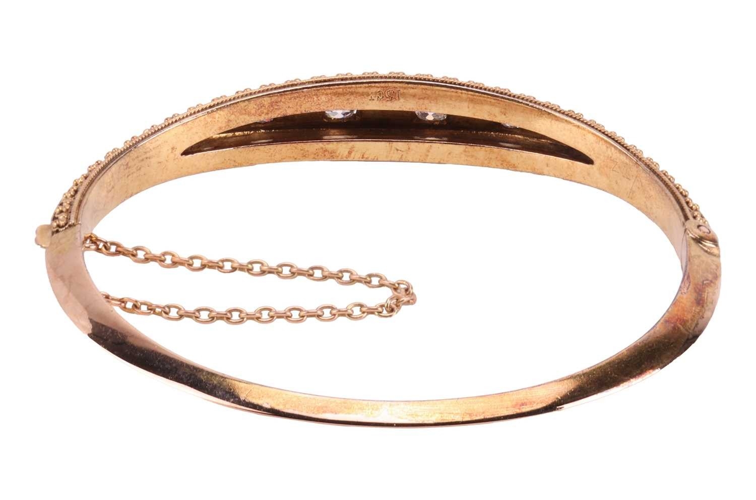 A Victorian diamond and pearl-set hinged bangle, with one half of Etruscan revival design, centrally-set with an alternating row of graduated old-cut diamonds and split pearls, the largest diamond measuring approximately 4.2mm x 4mm x 2.8mm, bordered with trefoil beading and millegrain detailing, the other bangle half of knife-edge design, leading to a concealed push-bar clasp and safety chain, in yellow metal stamped ‘15ct’, inner diameter measuring approximately 58mm; 14.0 grams.