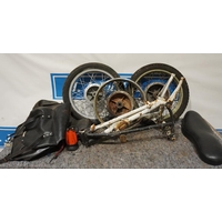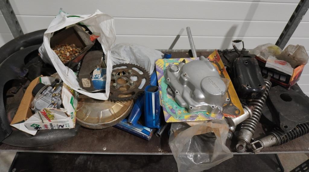 Shelf of mostly Italian motorcycle spares
