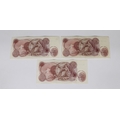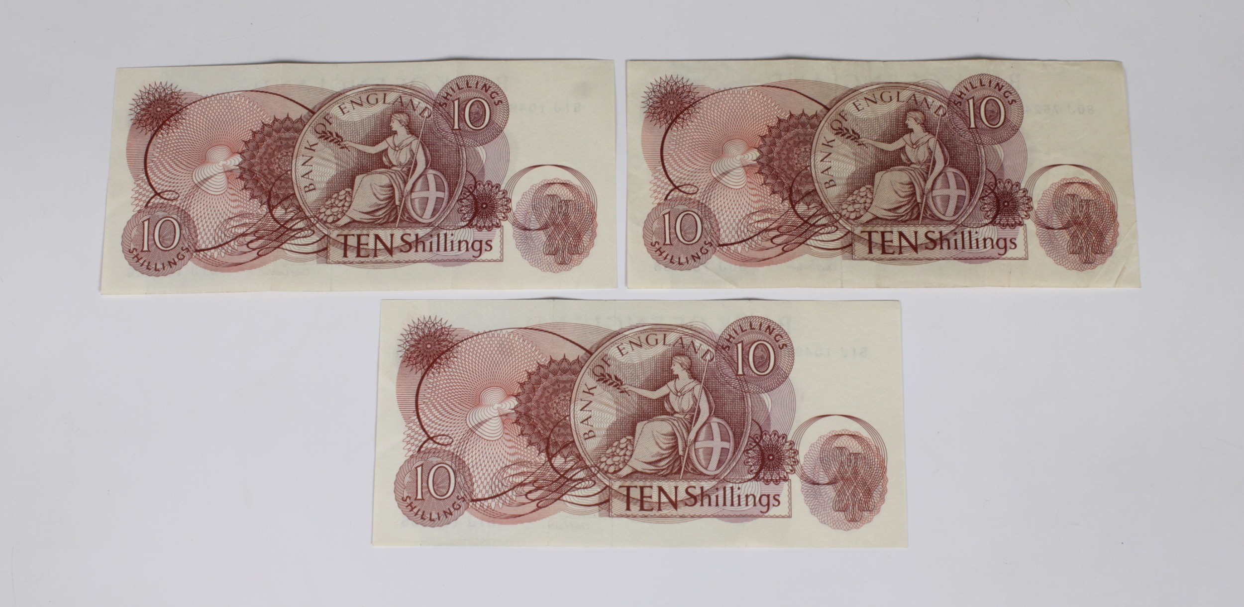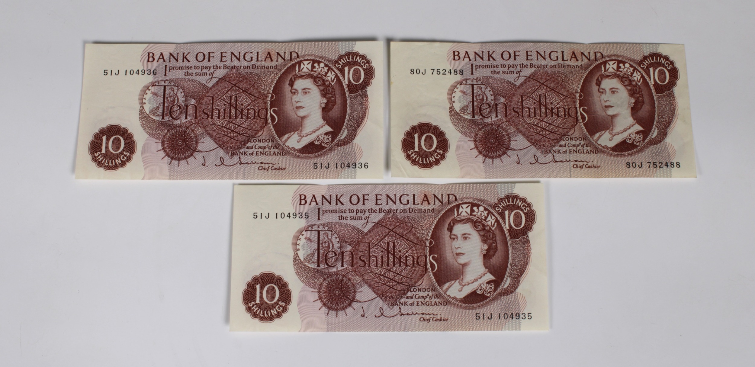 British Banknotes - Bank of England Ten Shillings consecutive pair c.1963, Signatory J. Q. Hollom, serial numbers 51J 104935 & 51J 104936, together with 80J 752488, very fine, pressed. (3)