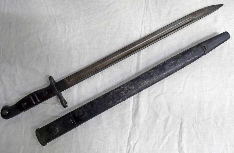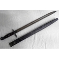 BRITISH 1913 PATTERN BAYONET WITH VARIOUS MARKS INCLUDING ISSUE DATE MARCH 1917/W 43 CM BALDE & STEEL MOUNTED LEATHER SCABBARD