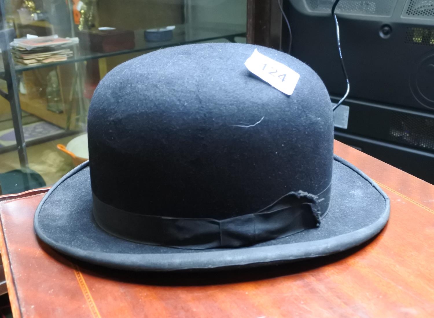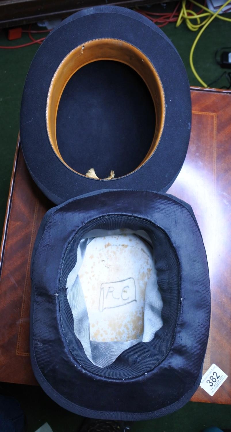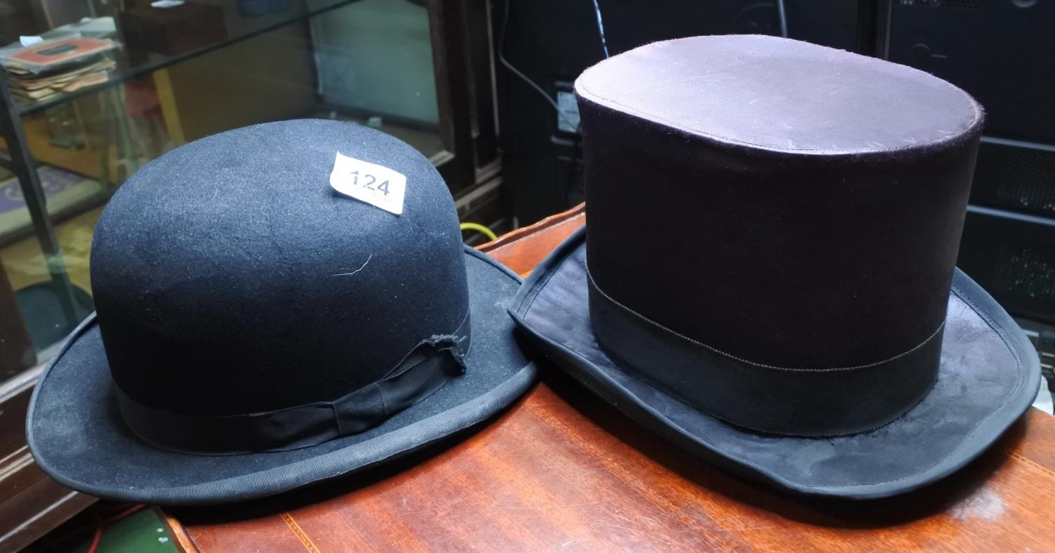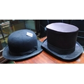 A vintage top hat along with a bowler hat.