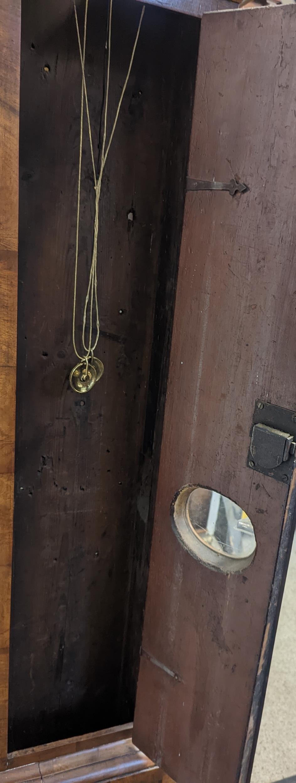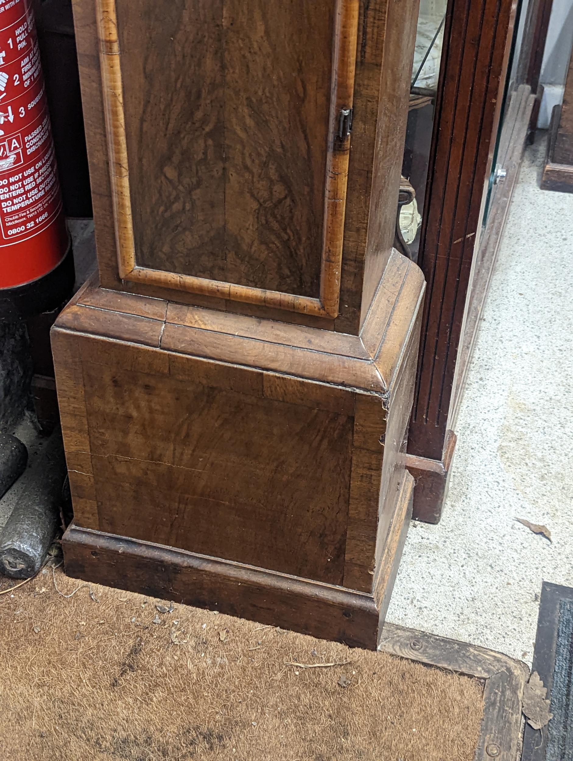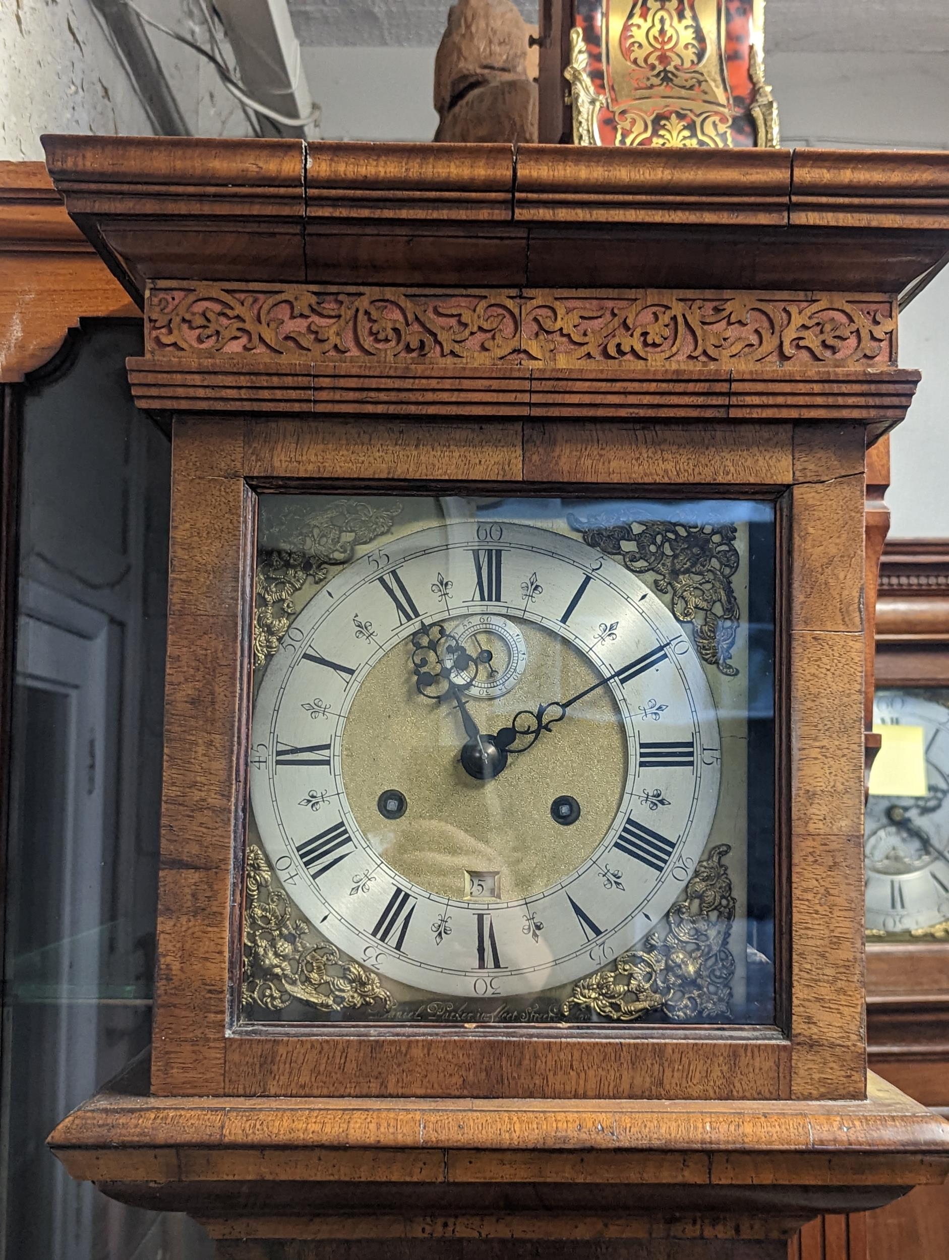 An early 18th century and later walnut veneered longcase clock, the gilt dial signed 'Daniel Parker in Fleet Street London' and having a matted centre, subsidiary seconds dial, silvered chapter ring with Roman numerals and gilt metal spandrels, the case having a stepped cornice with pierced fretwork and door having pendulum viewing window, the 8 day five pillar movement striking on a single bell, 200.5cm high x 40cm wide Location:FOYER