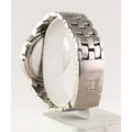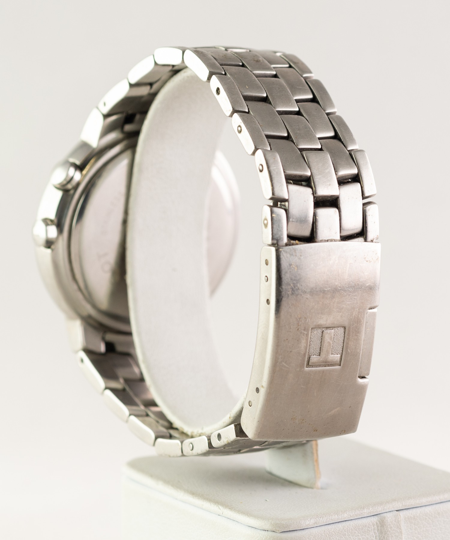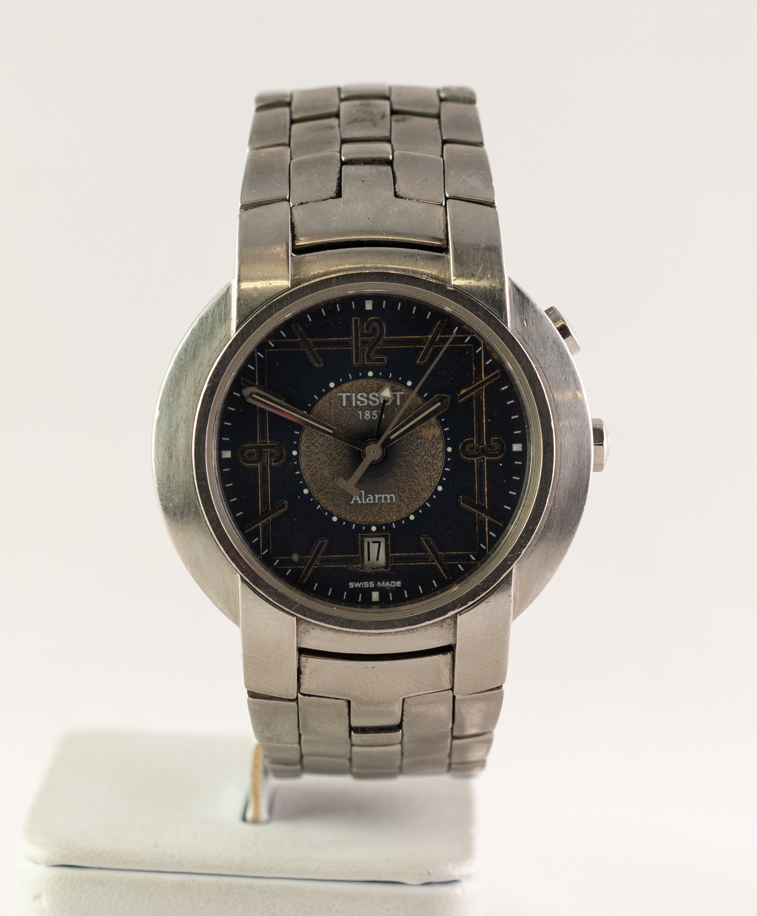 TISSOT VINTAGE CIRCA 1970s GENT'S STAINLESS STEEL ALARM WRISTWATCH having dial with black chapter ring, arabic numerals and batons, days aperture, centre seconds and alarm pointer, integral flexible bracelet, back plate numbered L871/971 OKS.JA - 11796, sapphire crystal