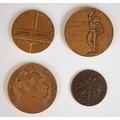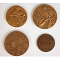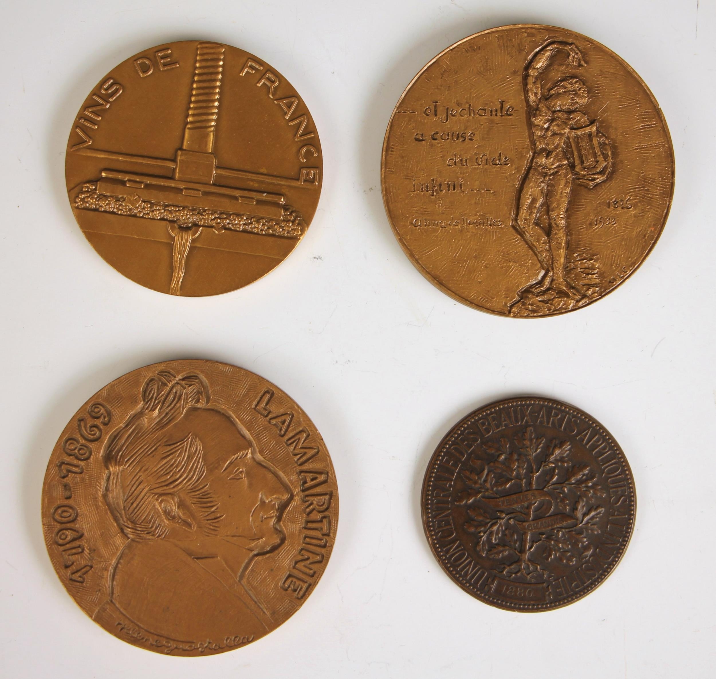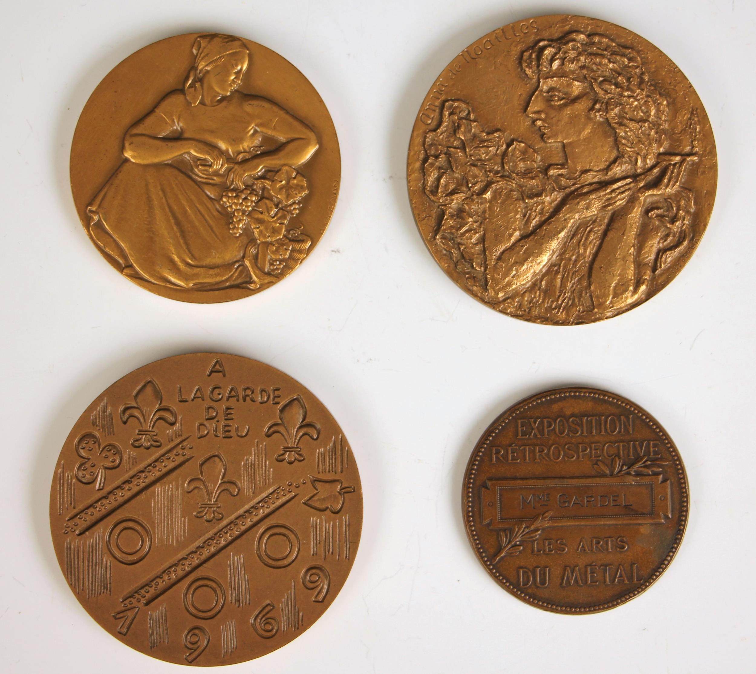 Four French bronze medallions, comprising; Exposition Retrospective Let Arts Du Metal, 1880, Vins De France by Guzman, A Lagarde De Dieu 1969, and a literature medal for Anna de Noailles (4)