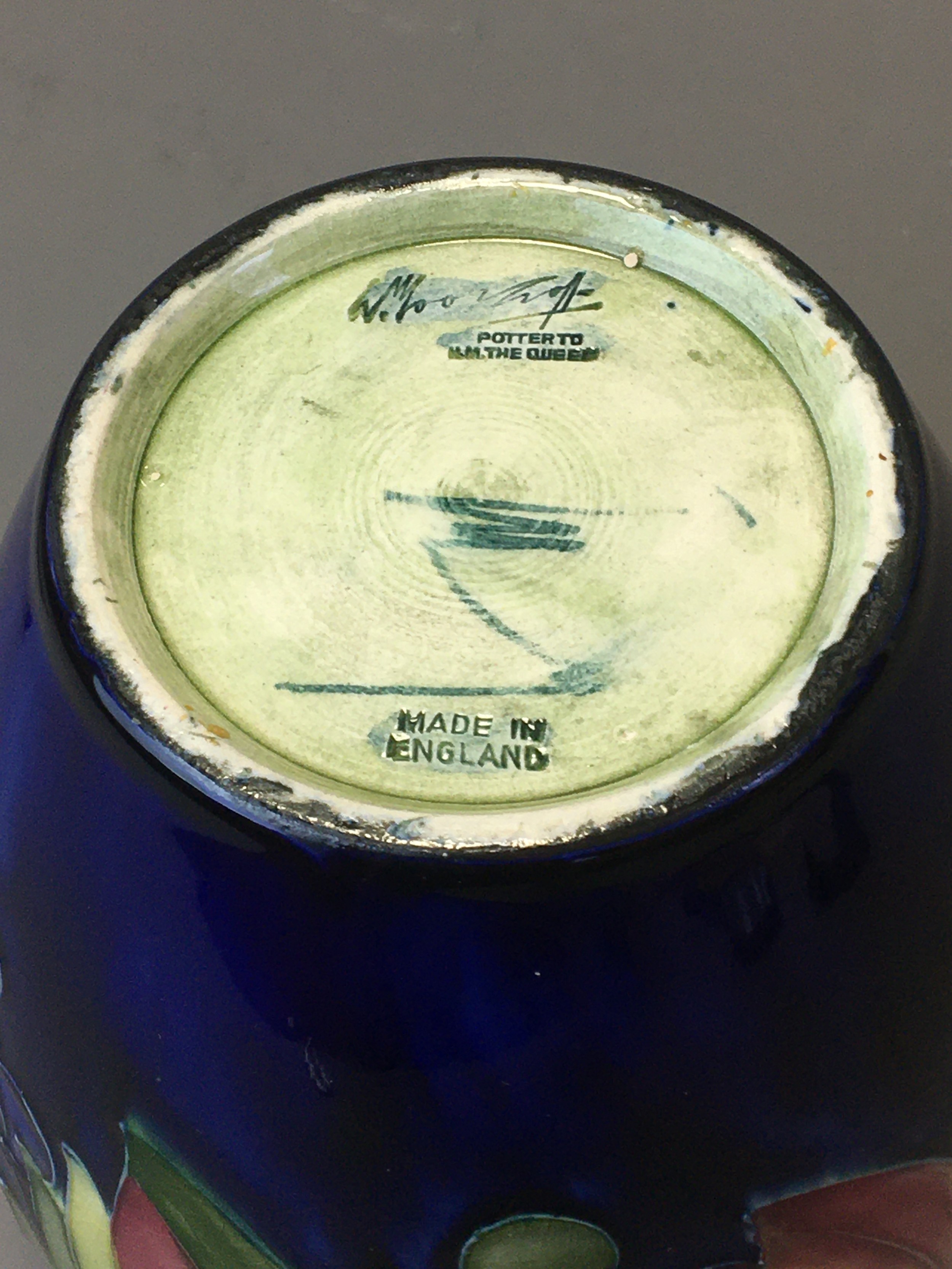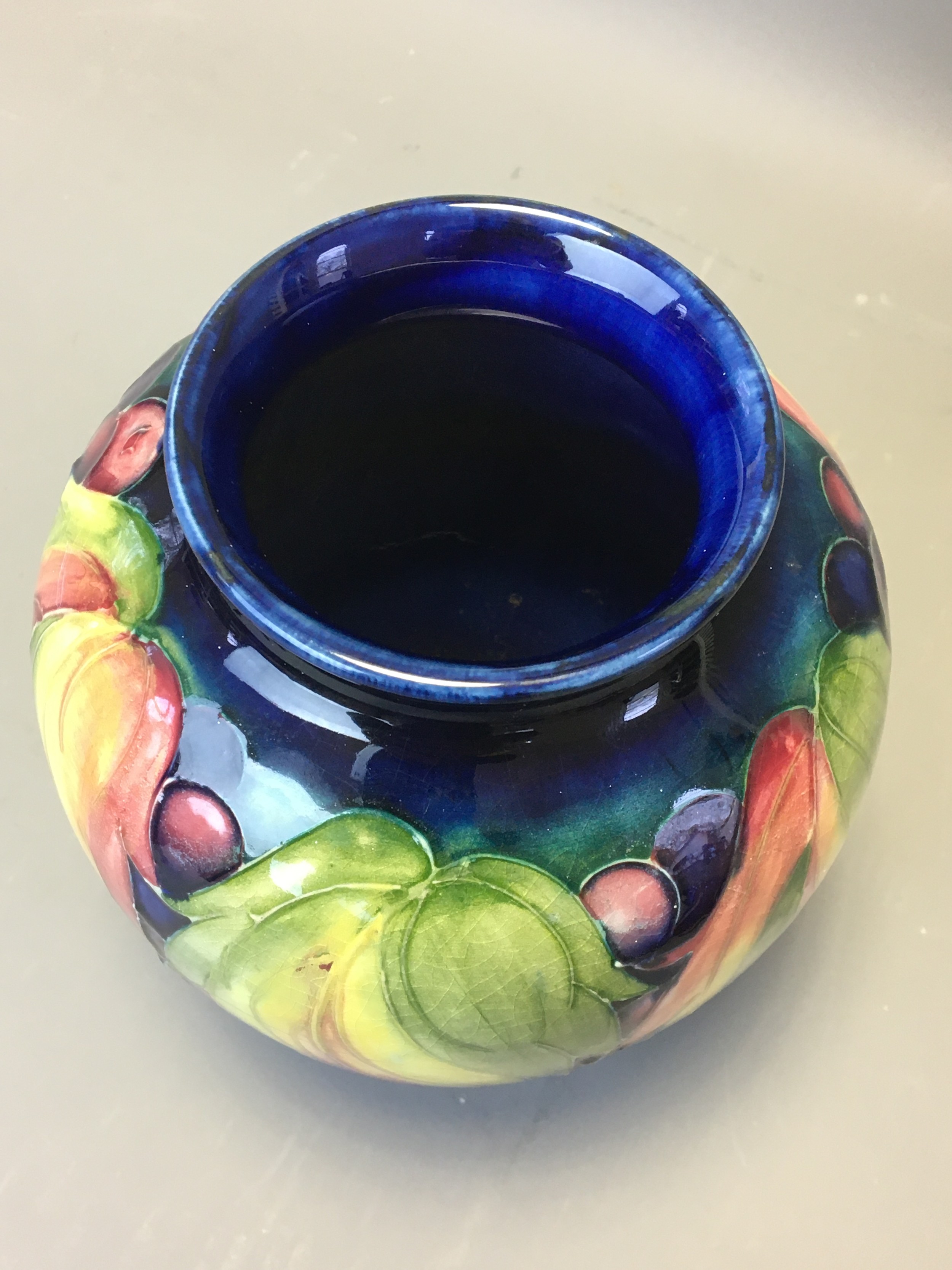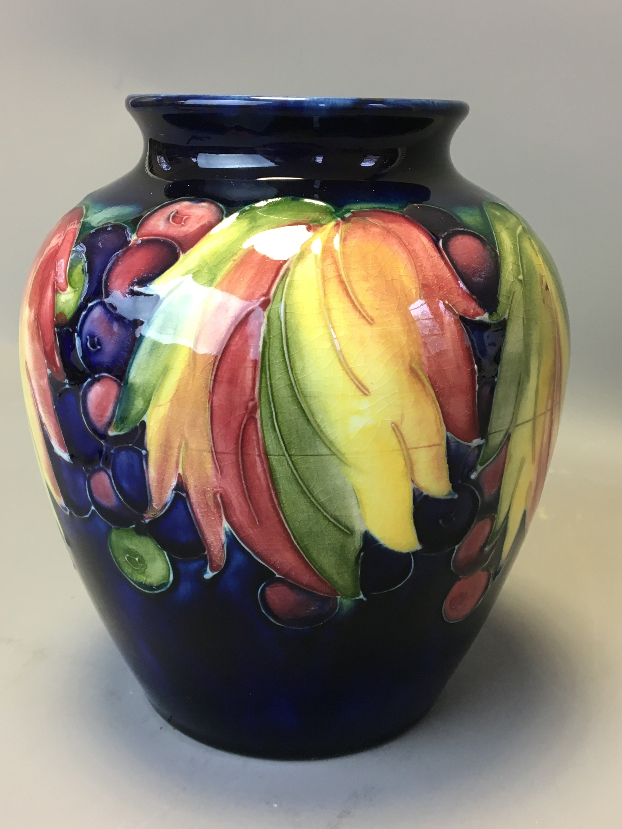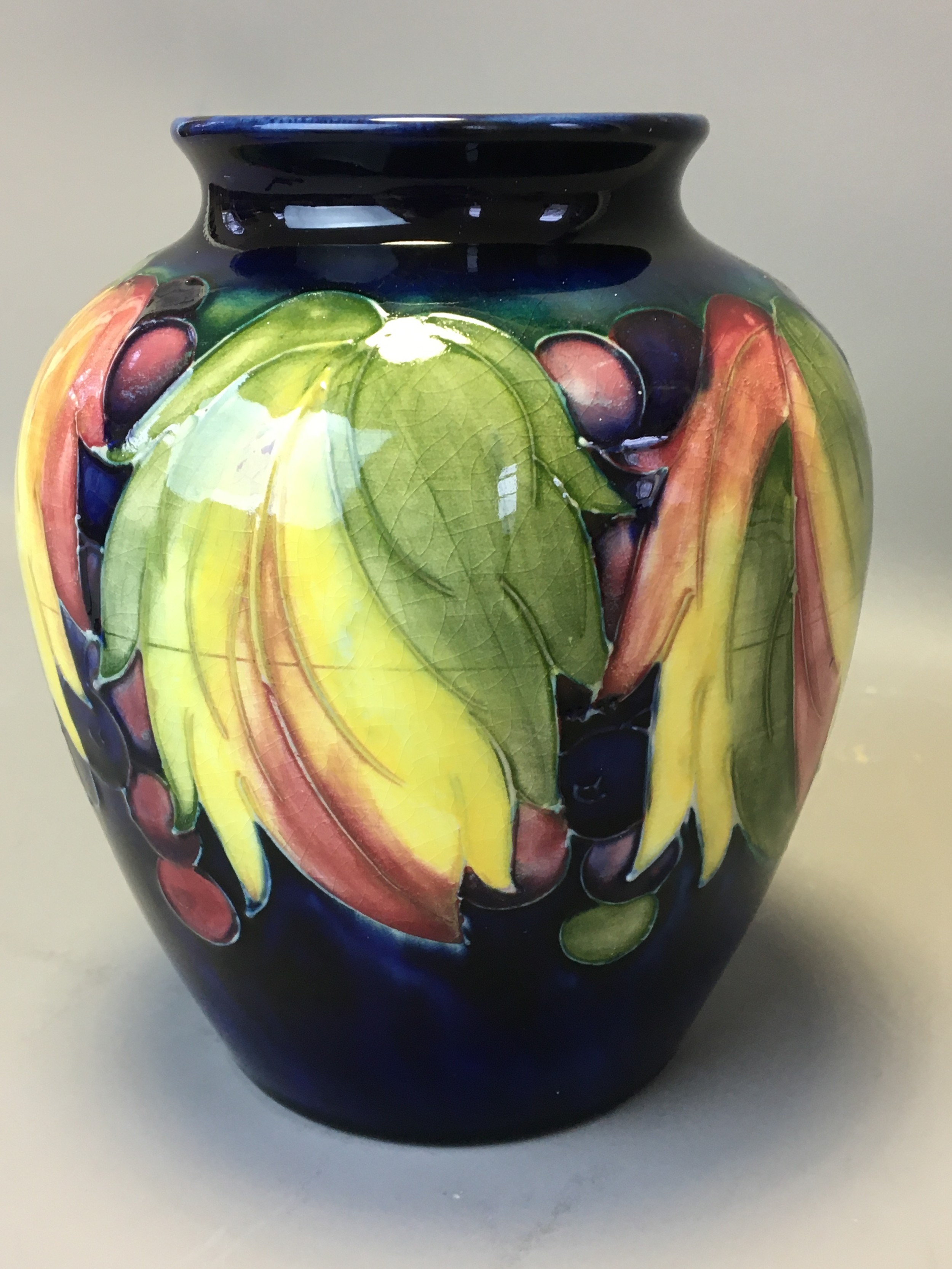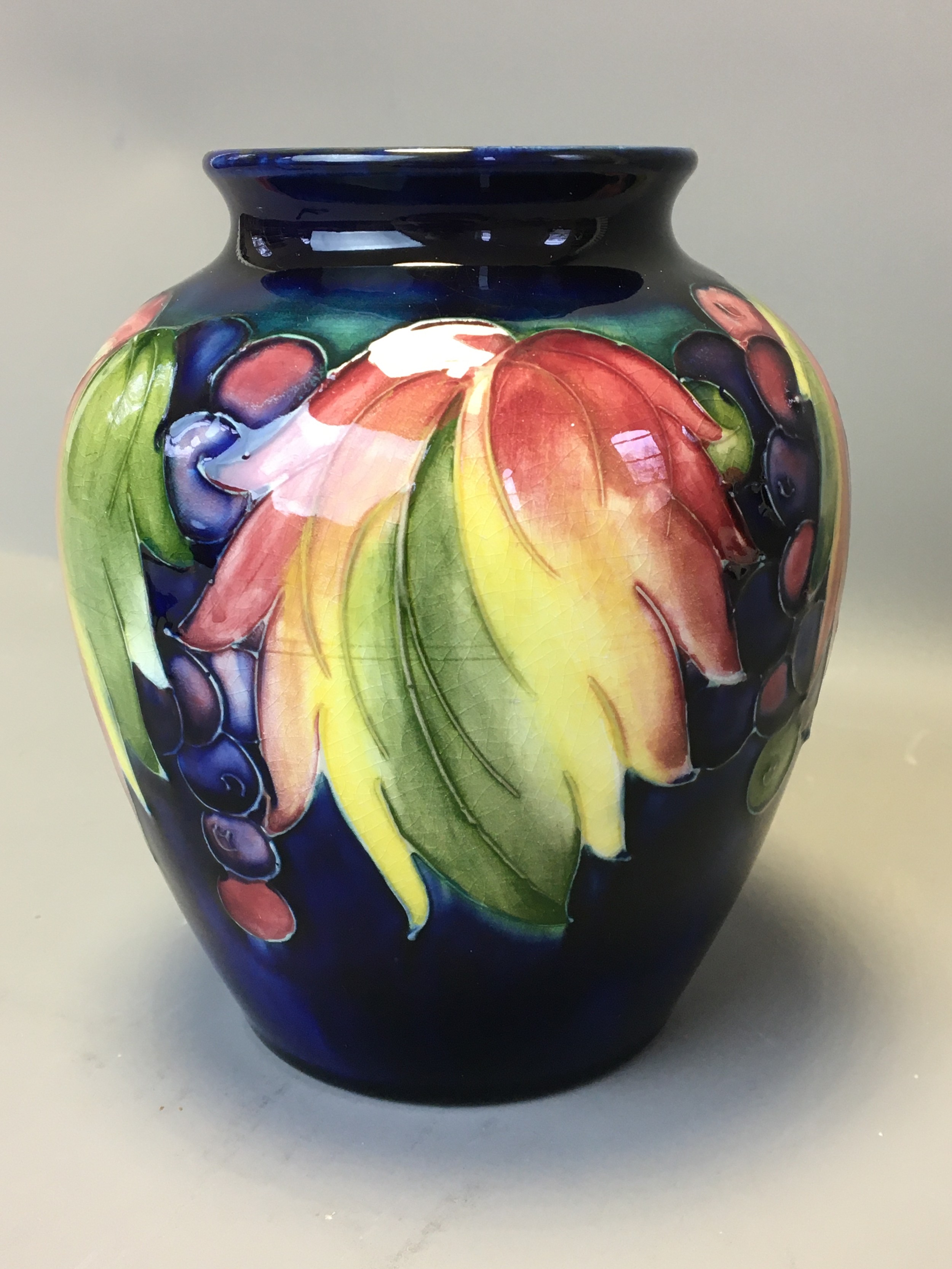 Period Moorcroft Good Sized Leaf and Berry Vase on Deep Blue Ground. Fully Signed to the base Potter to HM the Queen.