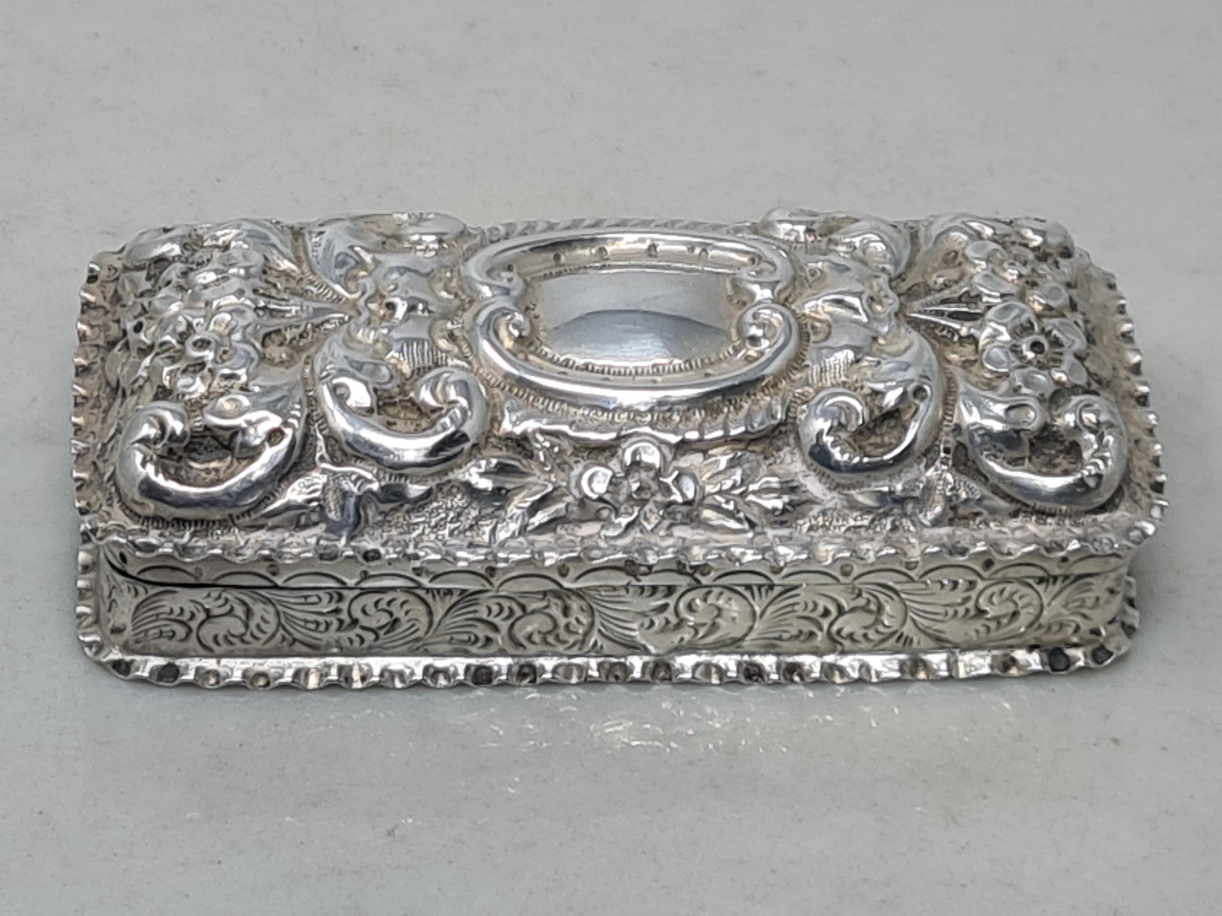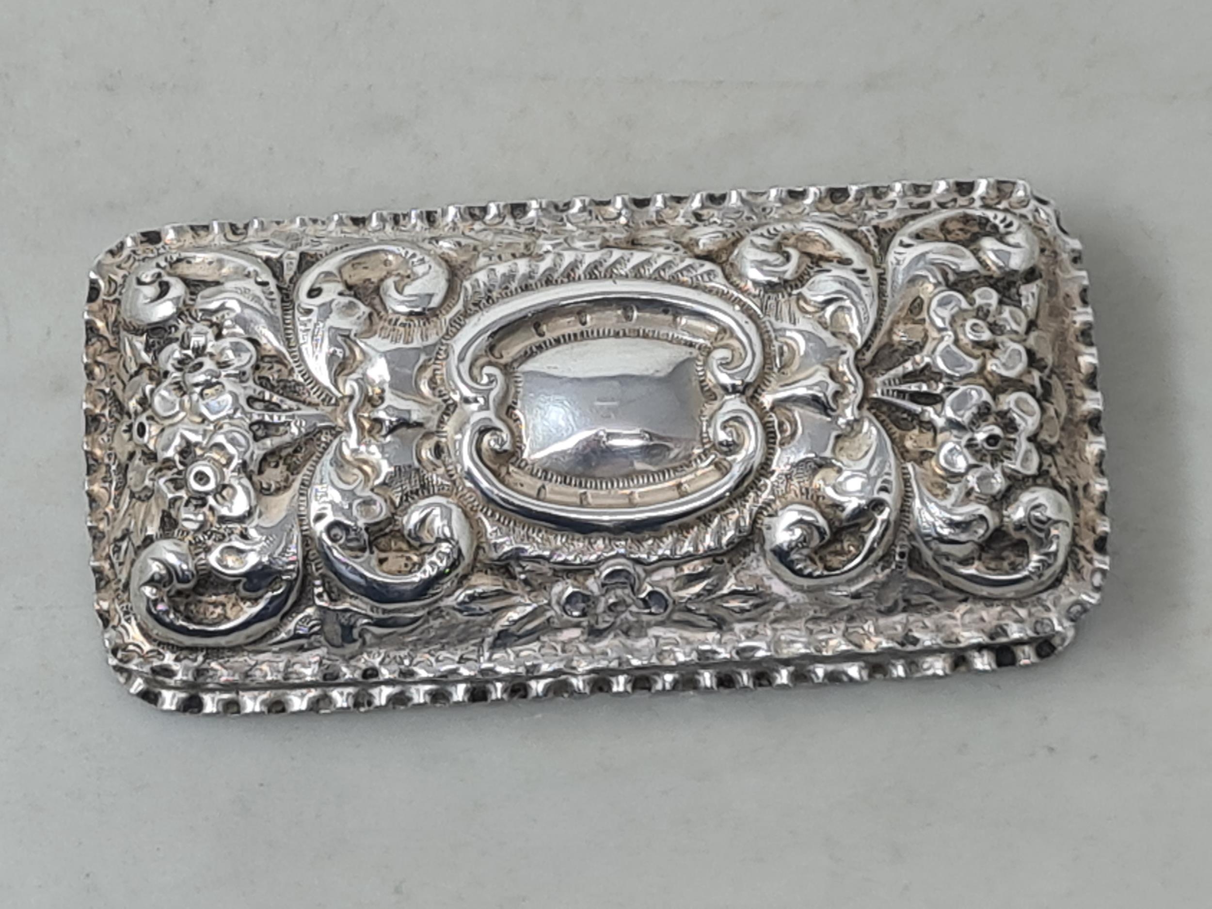 A Victorian silver rectangular Box with floral and scroll embossing, vacant cartouche, Birmingham 1897, 66gms