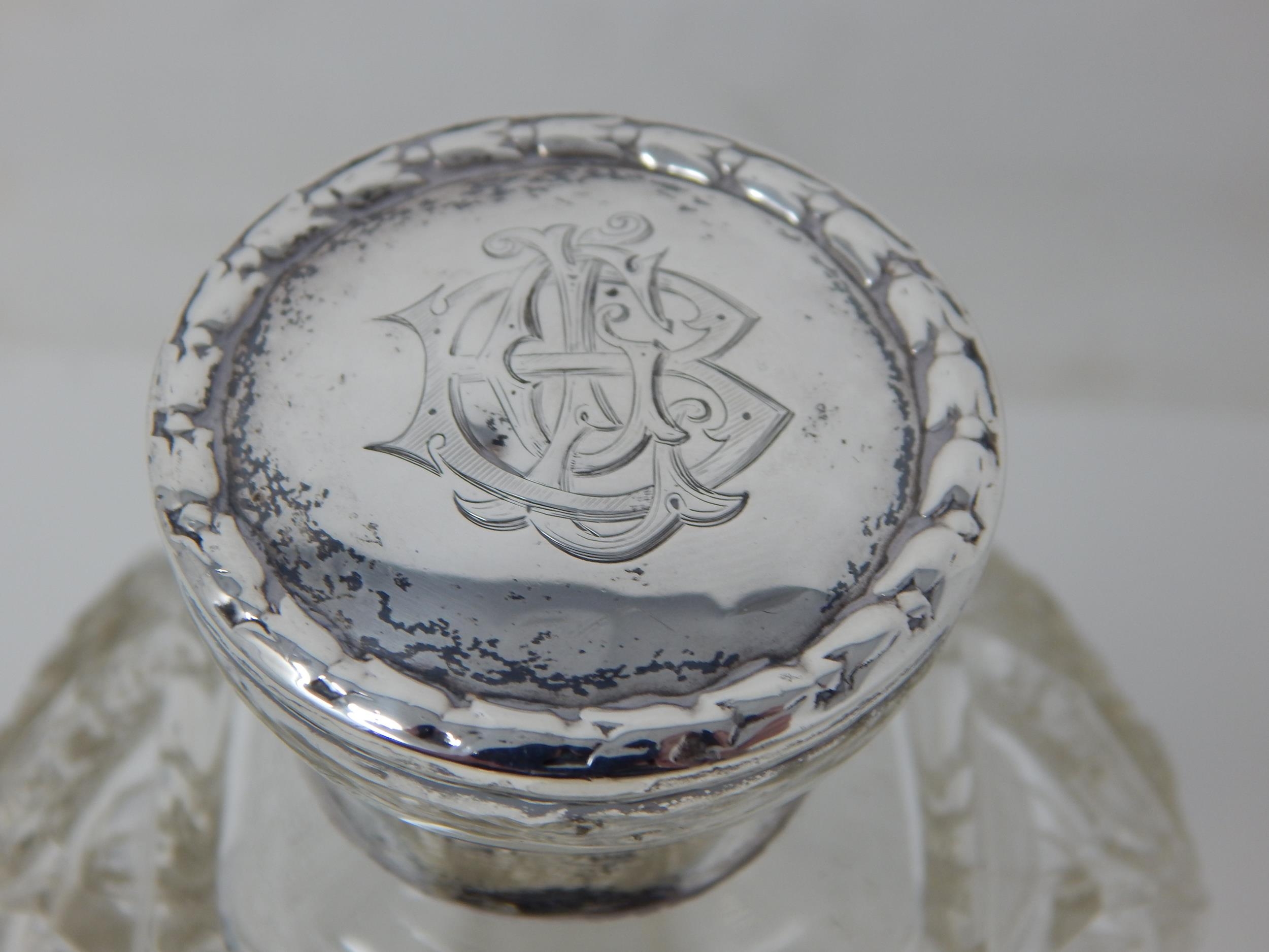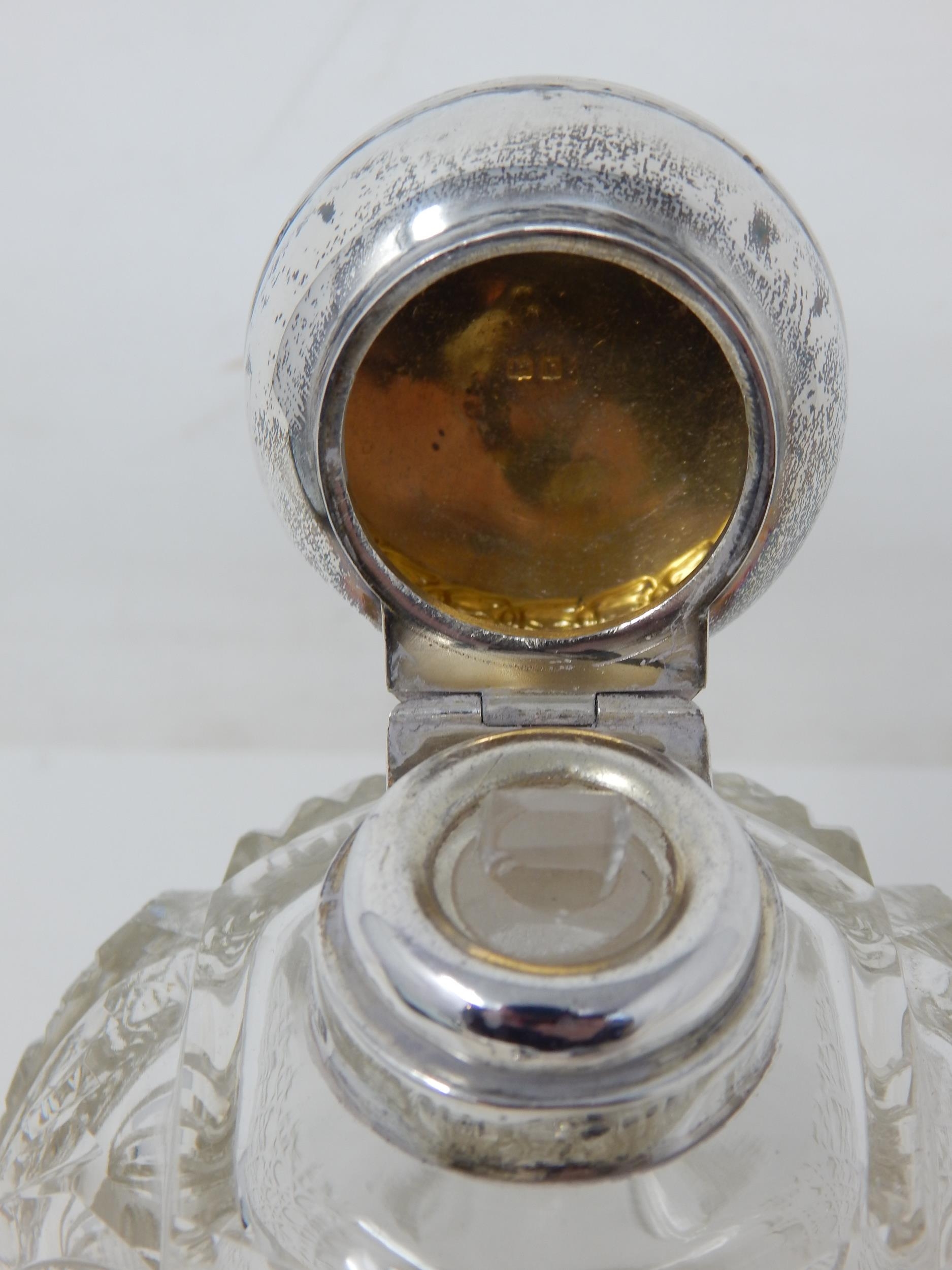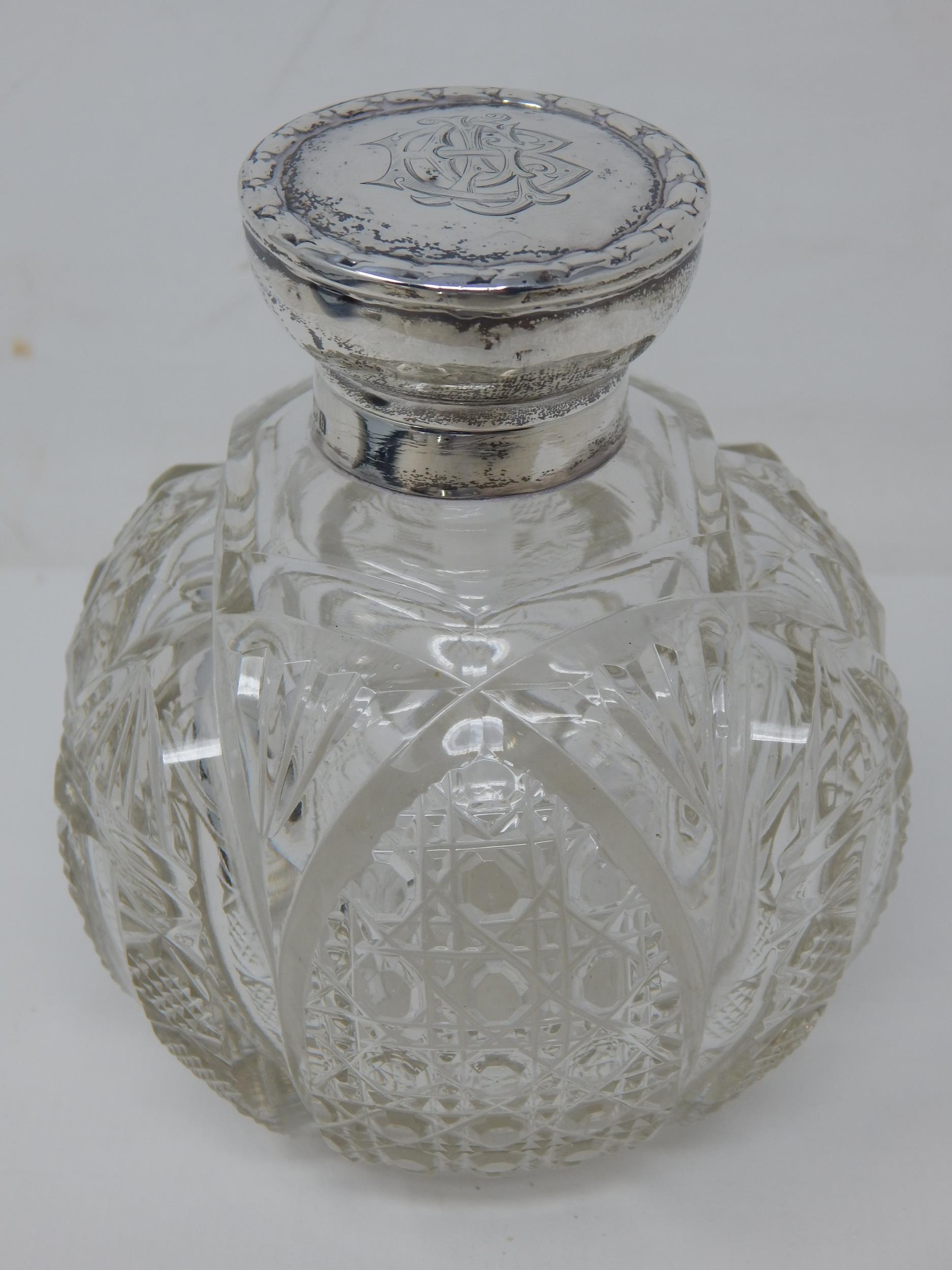 Edwardian Silver Mounted Perfume Bottle & Stopper with Cut Glass Body: Hallmarked Birmingham 1908: Measuring 11cm high