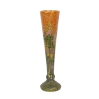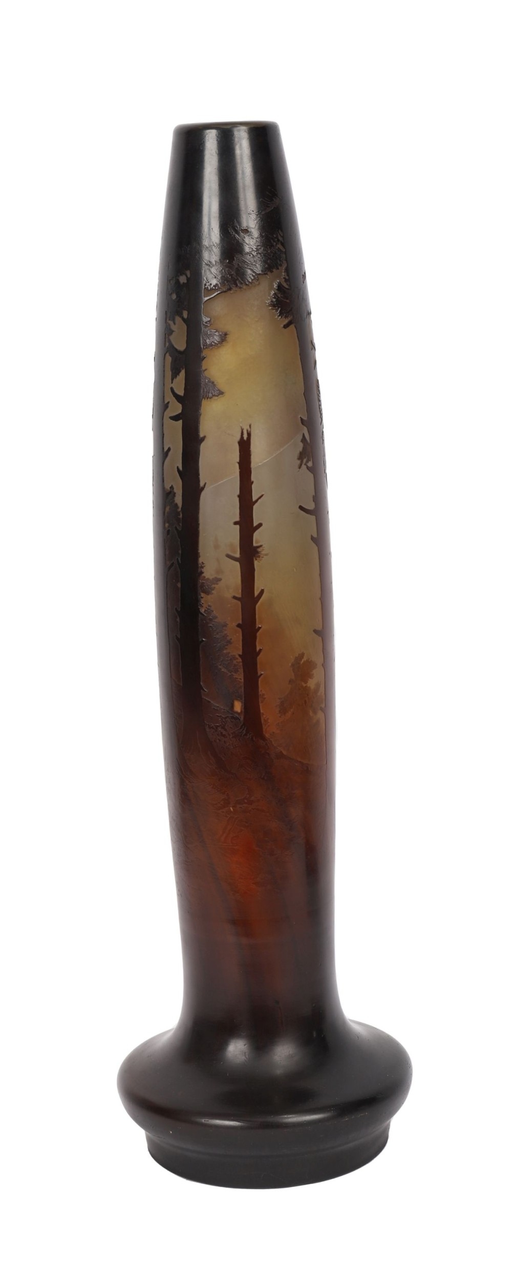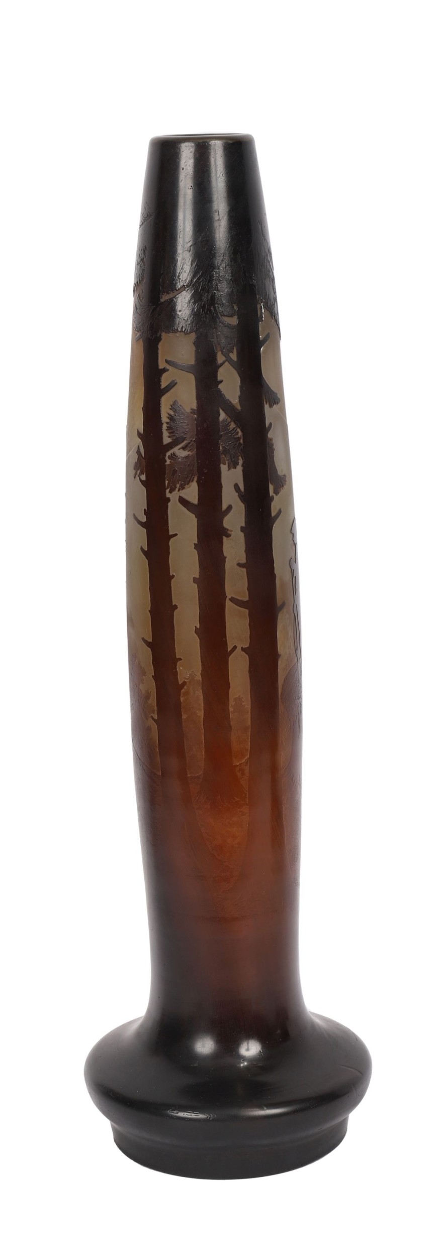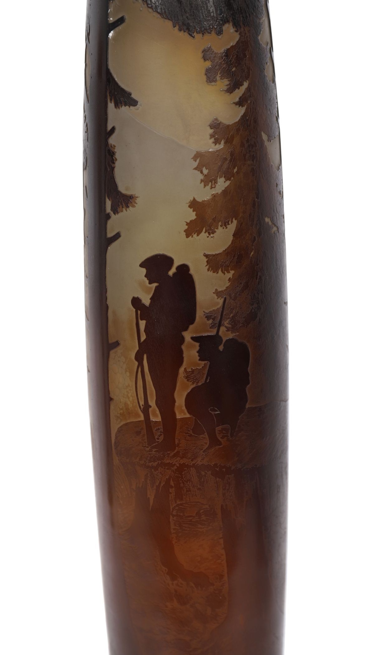 Circa 1915, A tall and finely worked Gallé cameo glass vase, acid-etched and wheel-carved with a sombre Vosges mountain forest scene, depicting two Chasseurs Alpins, one standing with rifle at rest and a second figure crouched beside him. The composition presents the quiet aftermath of battle rather than combat itself, the soldiers rendered as watchful presences within an idealised yet scarred fir woodland landscape.
