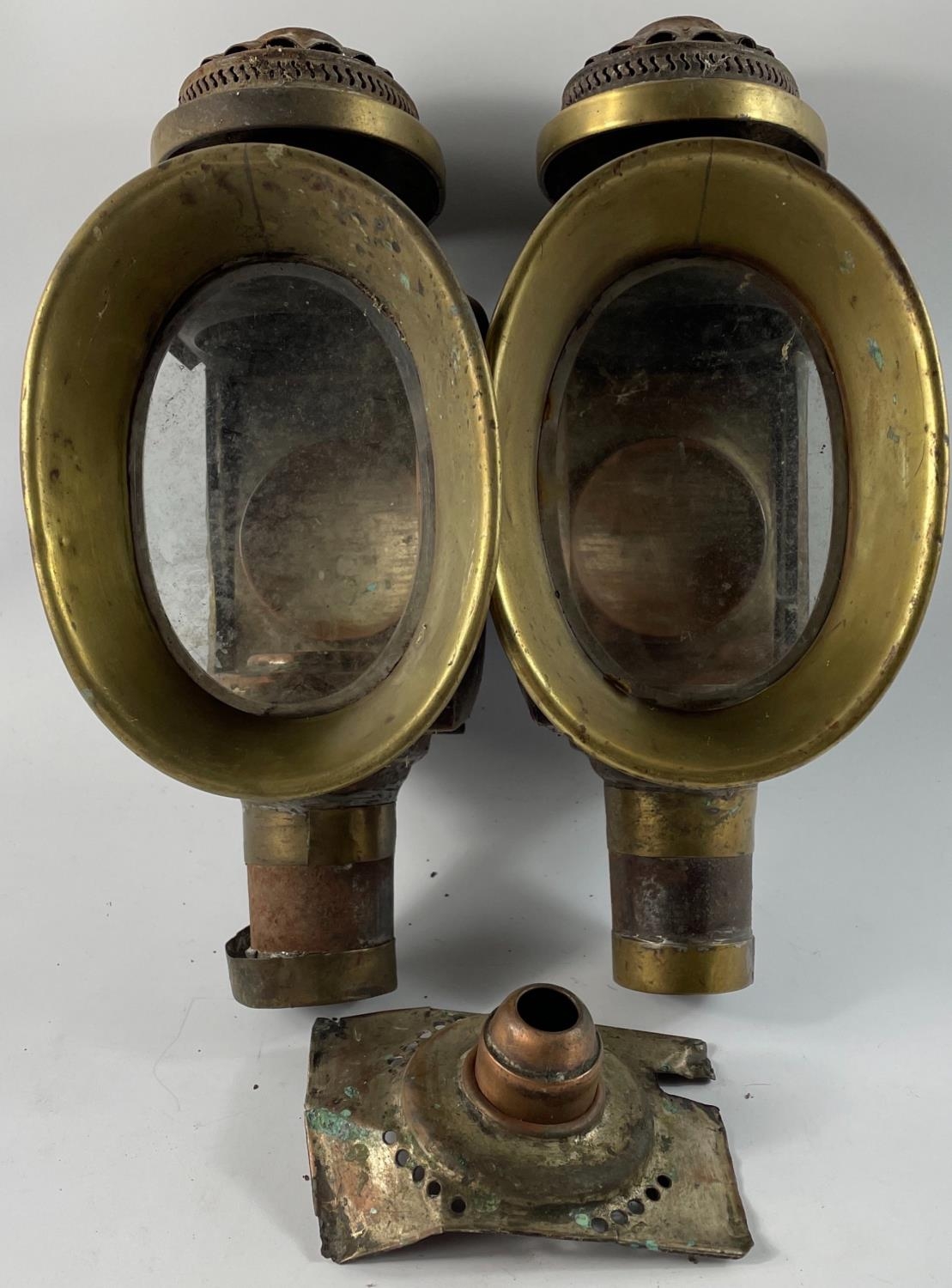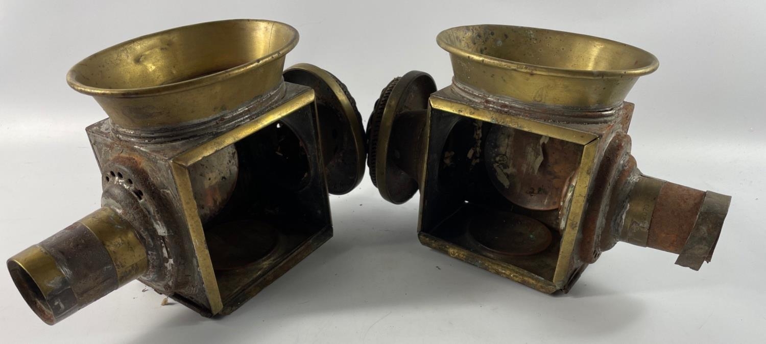 A pair of ORIGINAL19th century coach lamps with brass fittings, both require a piece of side fitting glass to complete - LOTS OF CHARACTER!!