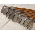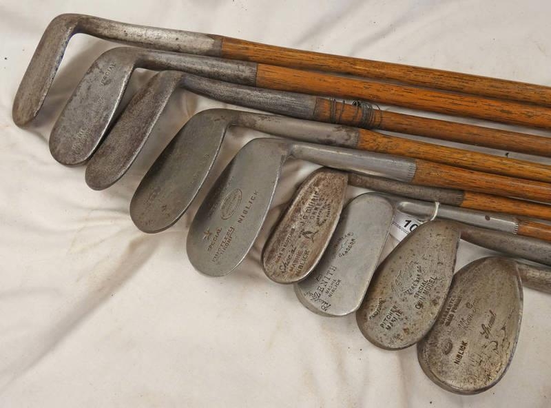 9 HICKORY SHAFTED GOLF CLUBS TO INCLUDE SENITH MACHINE NIBLICK BY D SUTHERLAND, GLASGOW, NIBLICK MASHIE NIBLICK BY J.G. QUIRIE FORRES, PITCHER MASHIE BY TAYLOR, NIBLICK SPECIAL BY GIBSON & CO LONG HORN AND FOUR OTHERS -9-
