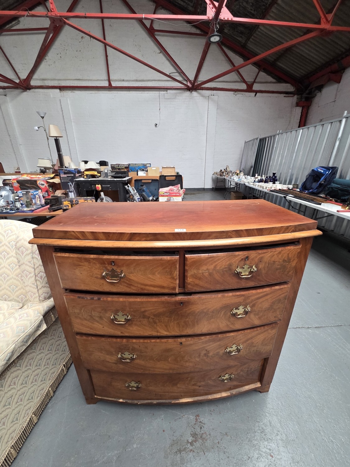 A bowed mahogany two over three chest of drawers
