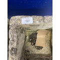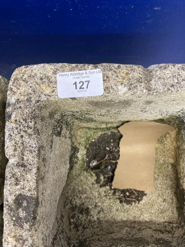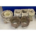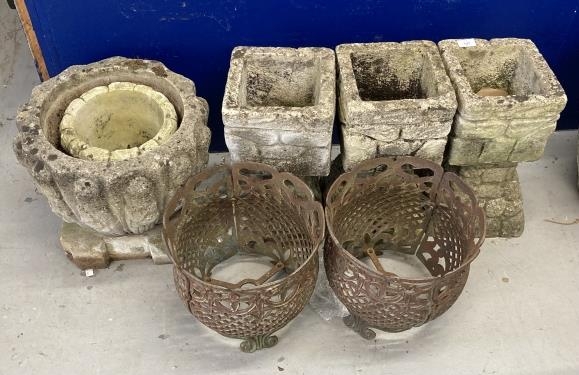 Garden Stoneware: Mixed lot of seven concrete pots. Plus two iron planters. (9)