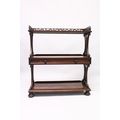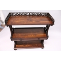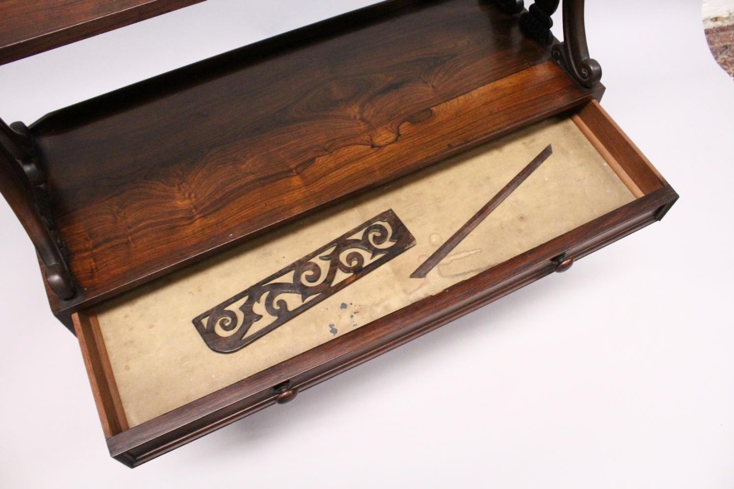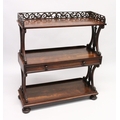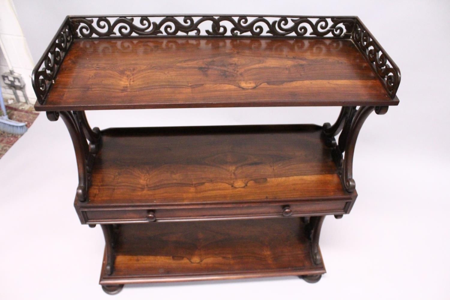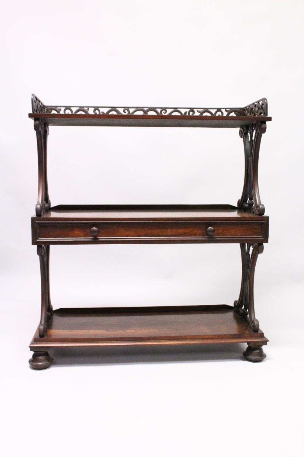 A GOOD LATE REGENCY ROSEWOOD THREE TIER WHAT-NOT, with pierced gallery, three shelves, the centre one with a long drawer, supported on bun feet.